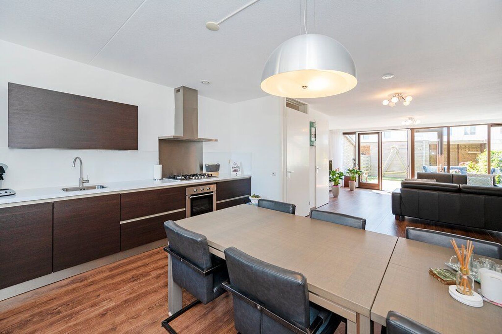 De woonkamer verrast positief door de oase aan licht en ruimte. De 6 meter brede glaspartij op het zuid/westen, moderne laminaatvloer en gestuukte wanden vloeien samen tot een prachtig geheel. De indeling is praktisch; zo is er een afgesloten trapopgang met daaronder kastruimte. Daarnaast is de woonkamer voorzien openslaande deuren welke een mooi verlengstuk van de woonruimte naar de tuin vormen. Aansluitend treft u aan de voorzijde de open, compleet uitgevoerde woonkeuken bestaande uit een rechte wand opstelling met veel kast- en werkruimte. Geheel in stijl met de rest van de afwerking is ook de keuken strak uitgevoerd met witte (greeploze) fronten, een licht werkblad en rvs accenten en voorzien van de navolgende inbouwapparatuur: 5-pits gaskookplaat, rvs afzuigkap met achterwand, oven, vaatwasser en koel-/vriescombinatie.