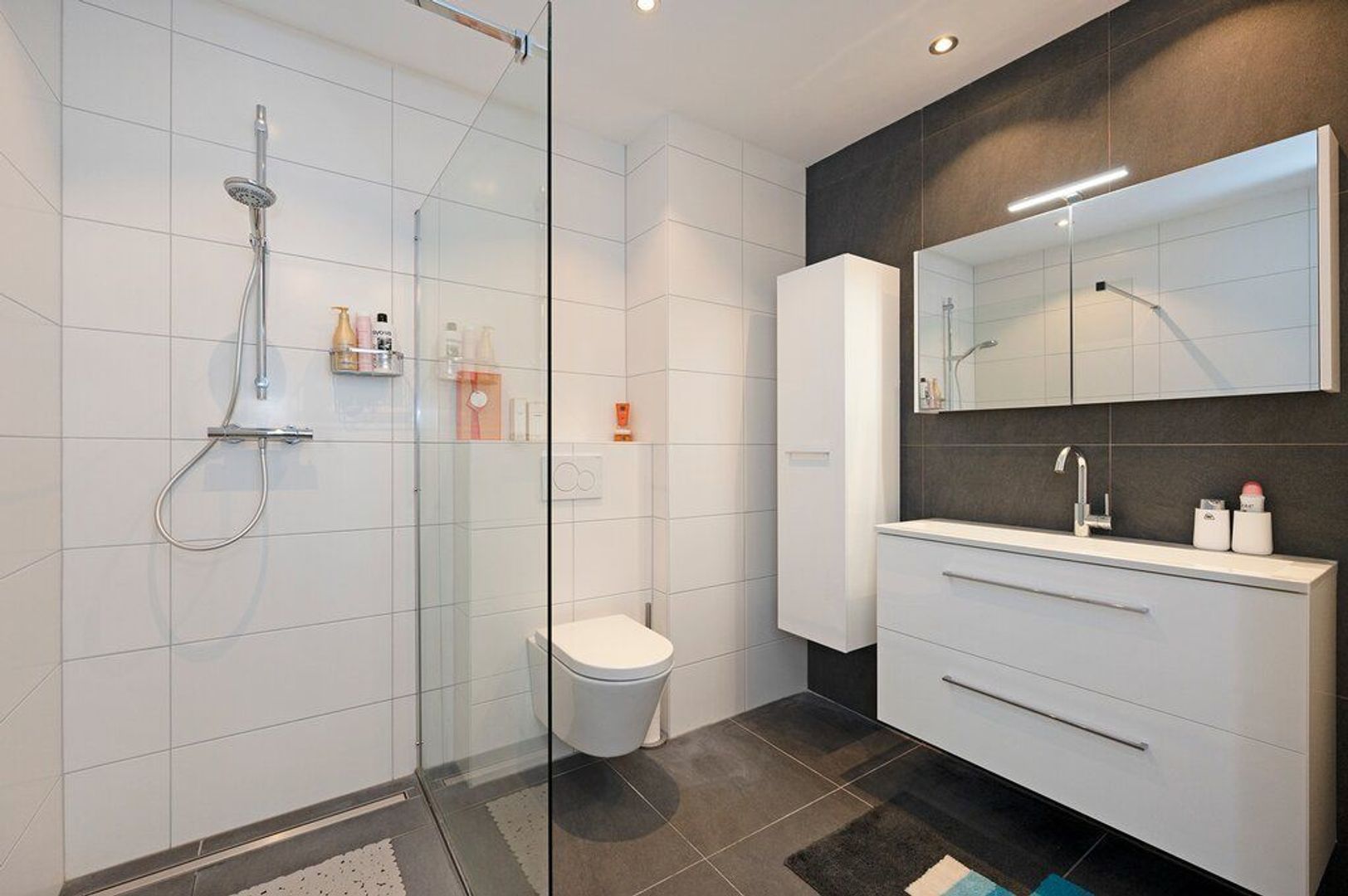 Ruime overloop, 3 slaapkamers, badkamer met inloopdouche, wastafelmeubel met laden en bijpassende spiegelkast en kolomkast en vrij hangend wandcloset.