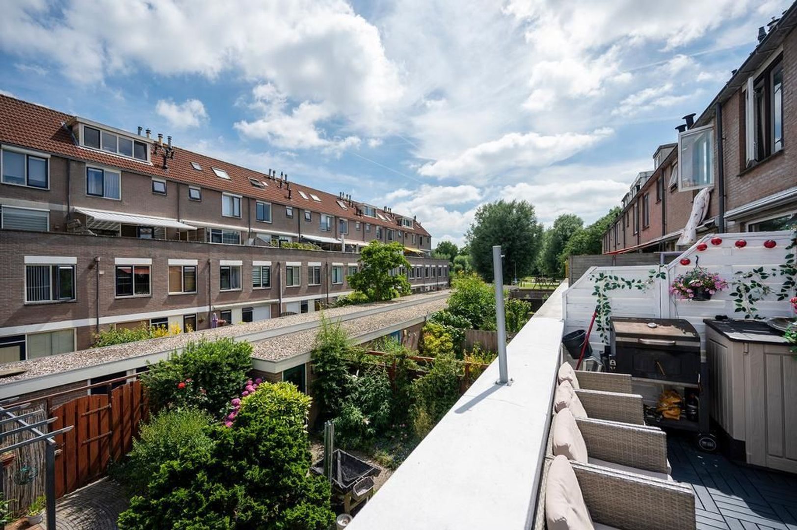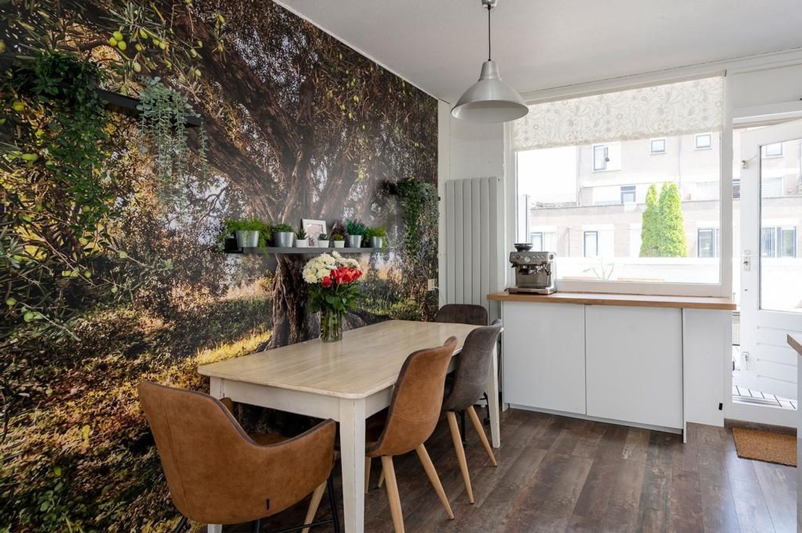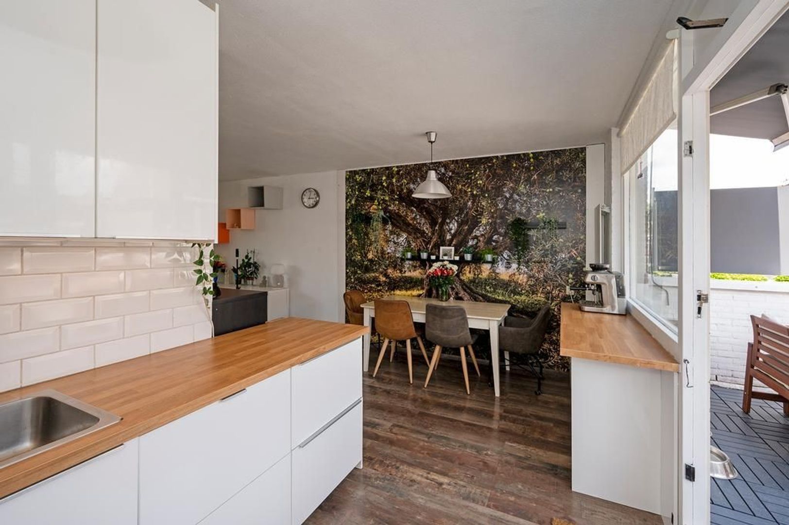 Aan de achterzijde is de lichte keuken gesitueerd. Deze is voorzien van diverse inbouwapparatuur zoals een 4-pits inductiekookplaat, koelkast, vriezer, oven en afzuiginstallatie. Vanuit de keuken is er toegang tot het zonnige terras welke op het zuidoosten is gelegen. Tussen de woonkamer en de eethoek is de afgesloten trapopgang te vinden met een toiletruimte.