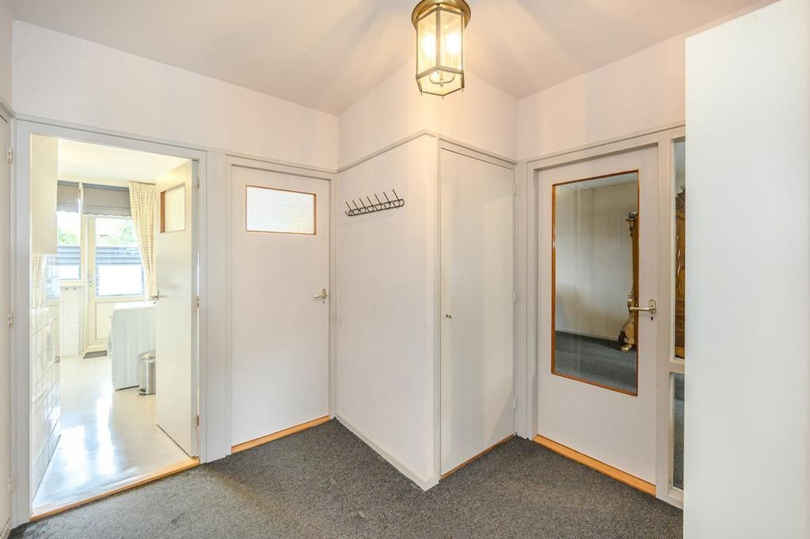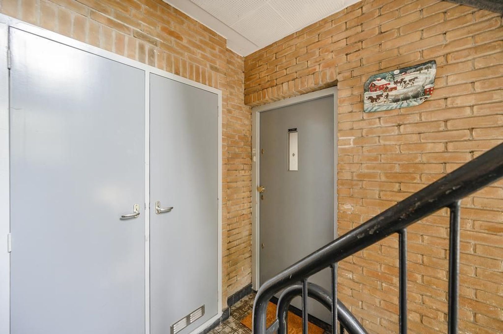 Overdekte entree met afgesloten portiek, bellentableau en postbussen. De trapopgang naar de woonverdiepingen en toegang tot het souterrain met de (fietsen)bergingen.