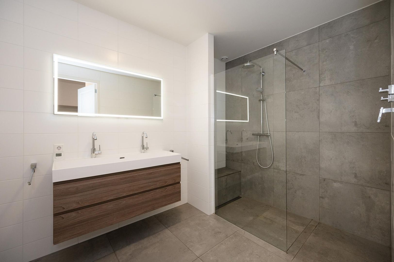 De badkamer is een toonbeeld van modern comfort en stijl. Hier vindt u een ruime stortdouche, subtiel afgeschermd met een combinatie van glas en steen, evenals een wastafelmeubel met dubbele wastafel en praktische opbergruimte. De gekozen materialen en kleuren, zoals de matte witte wandtegels en de antracietgrijze vloertegels, zorgen voor een tijdloze en rustige uitstraling.