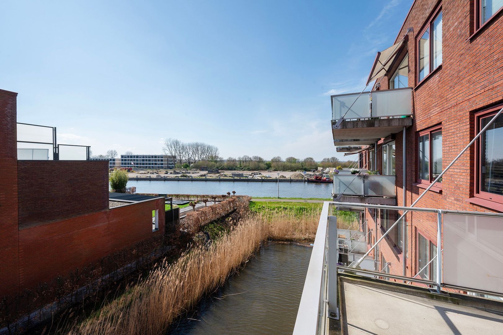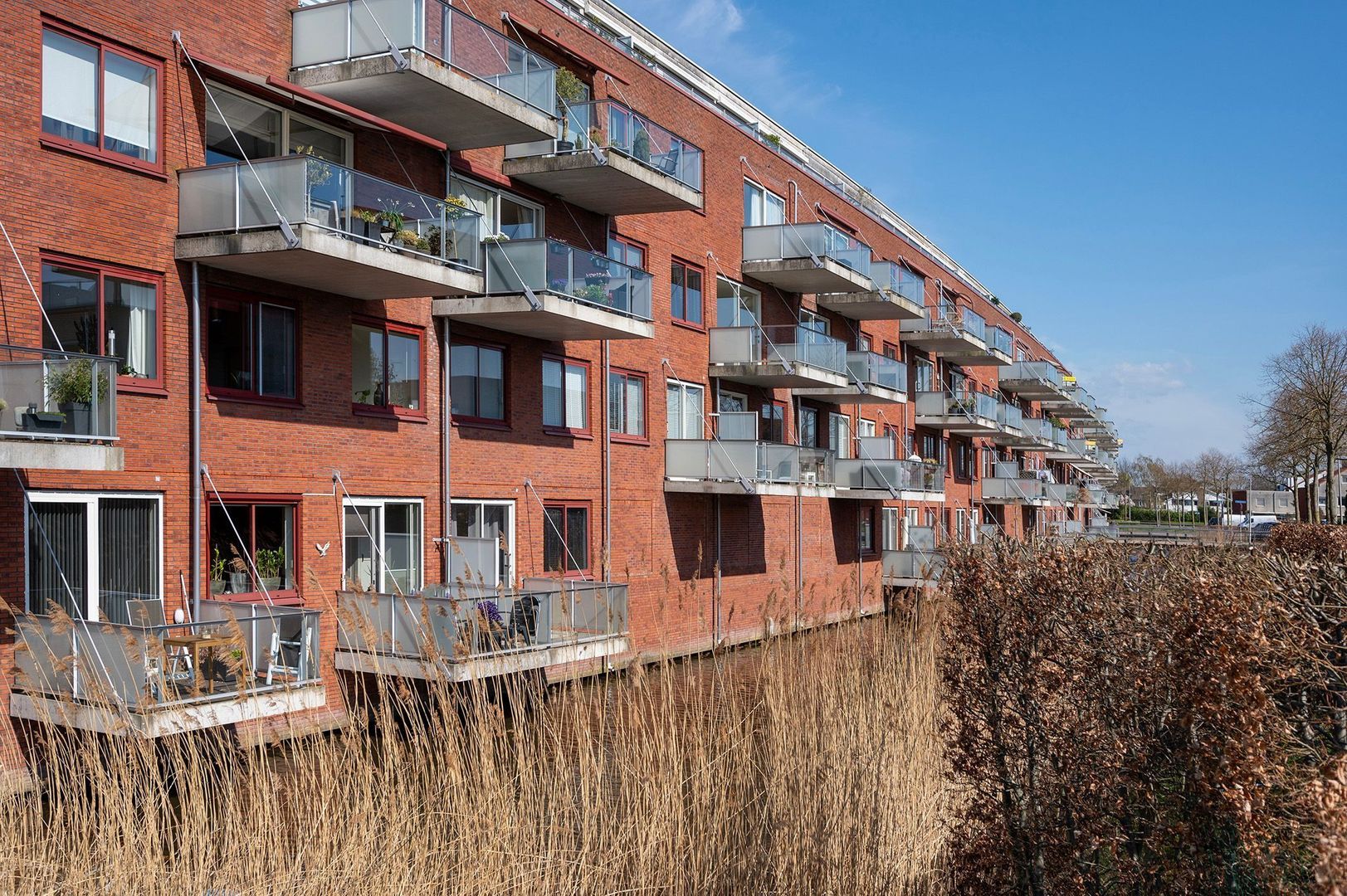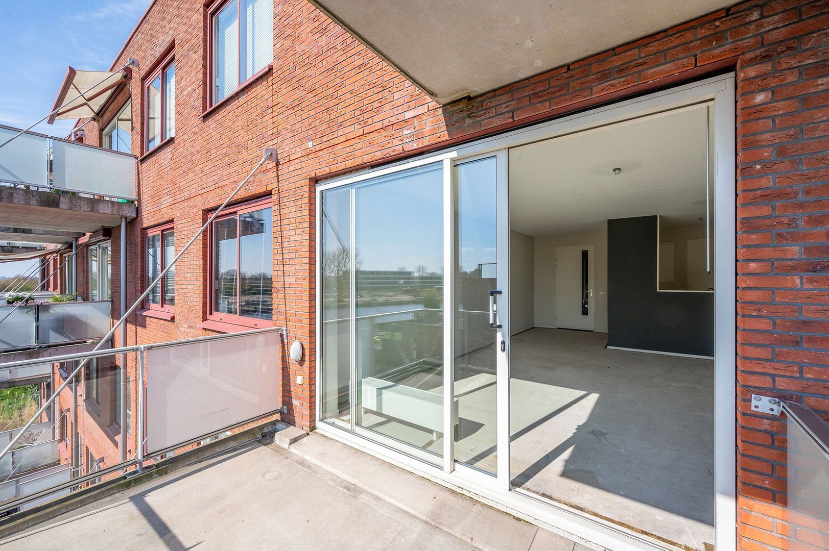 De schuifpui in de woonkamer geeft toegang tot het balkon, dat gunstig gelegen is op het zuiden. Door de ruime afmetingen kun je hier een gezellige zithoek creëren. Daarnaast heb je heerlijk zicht op de rijn.
