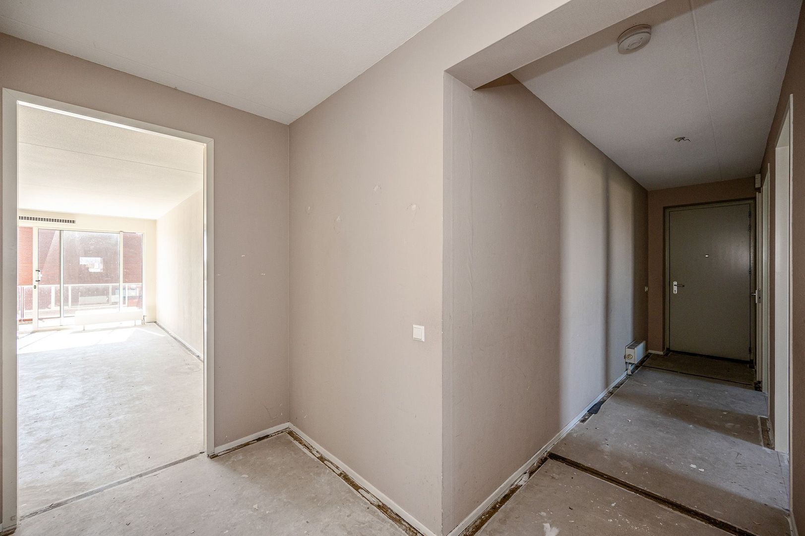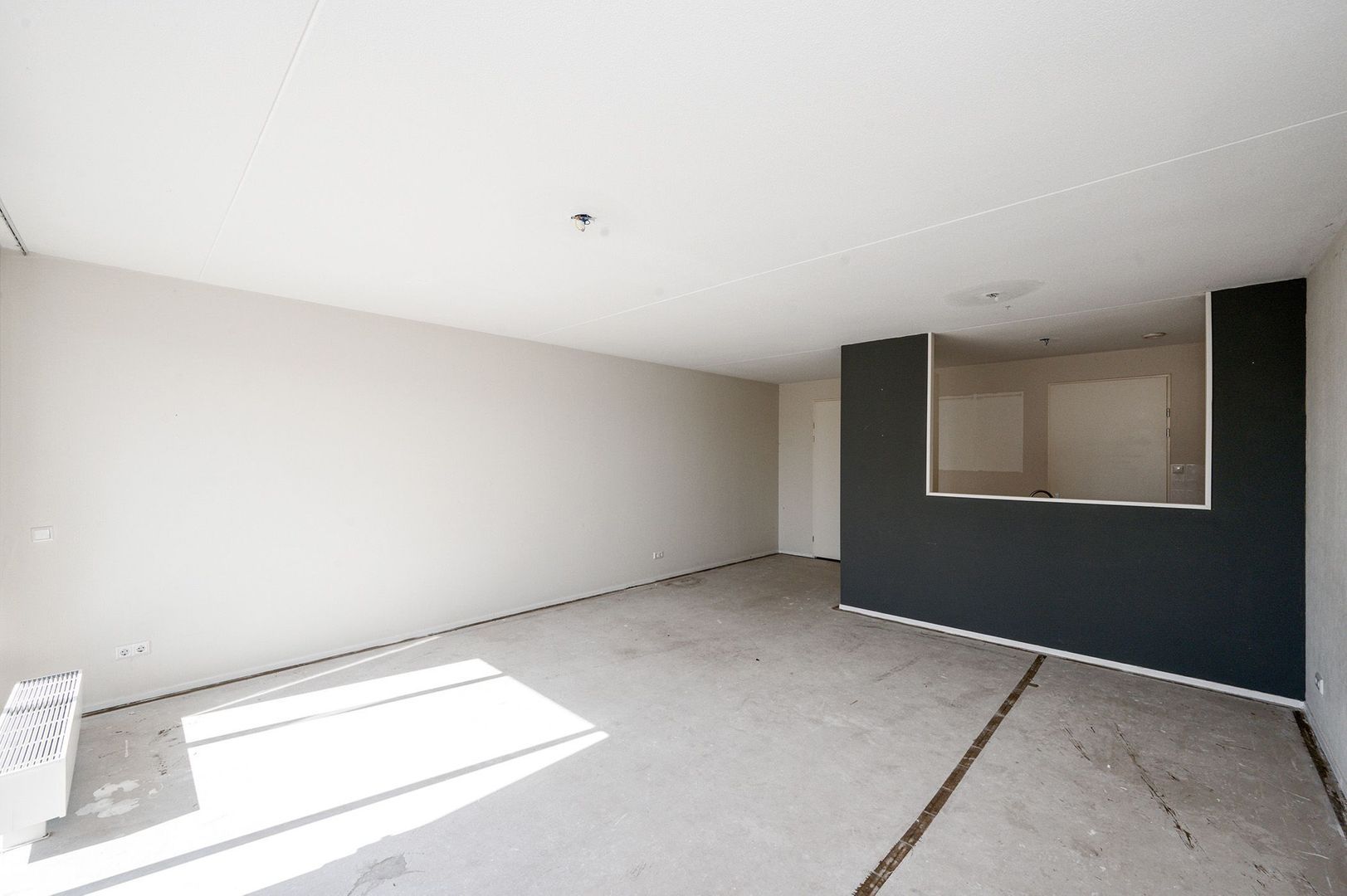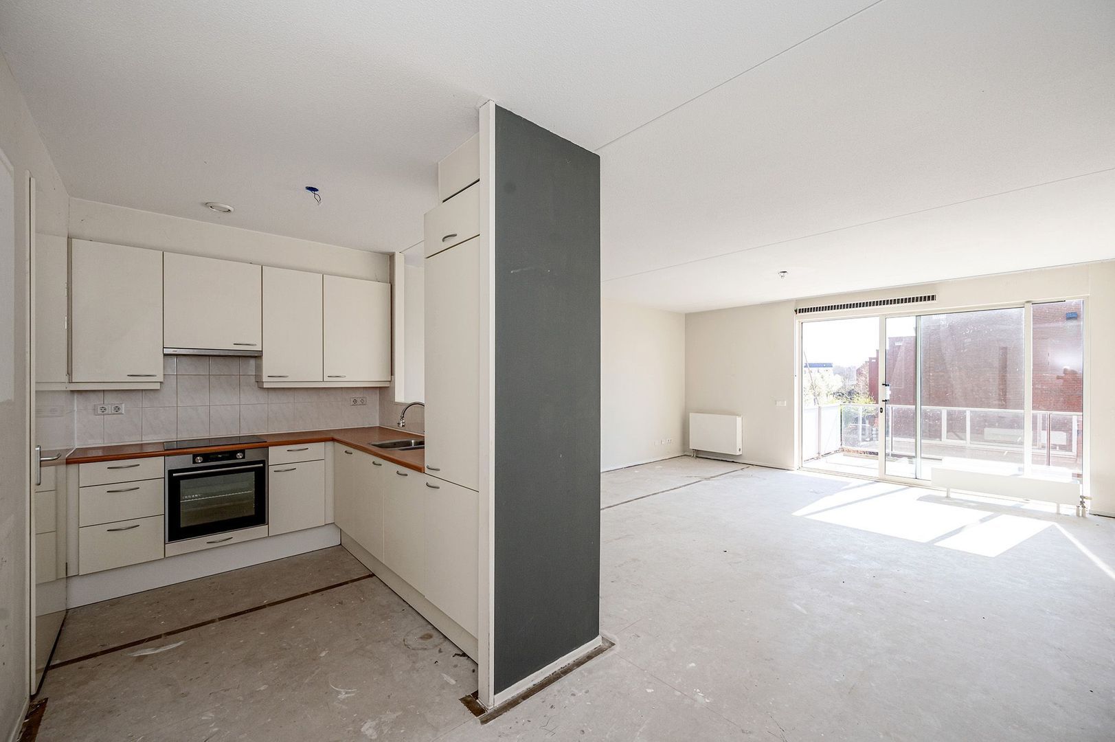 De woonkamer is licht door de grote raampartij aan de achterzijde met schuifpui. Door de breedte van de kamer kun je deze op verschillende manieren inrichten. Vanuit de woonkamer zijn de entree, balkon, tussenhal en de open keuken bereikbaar.