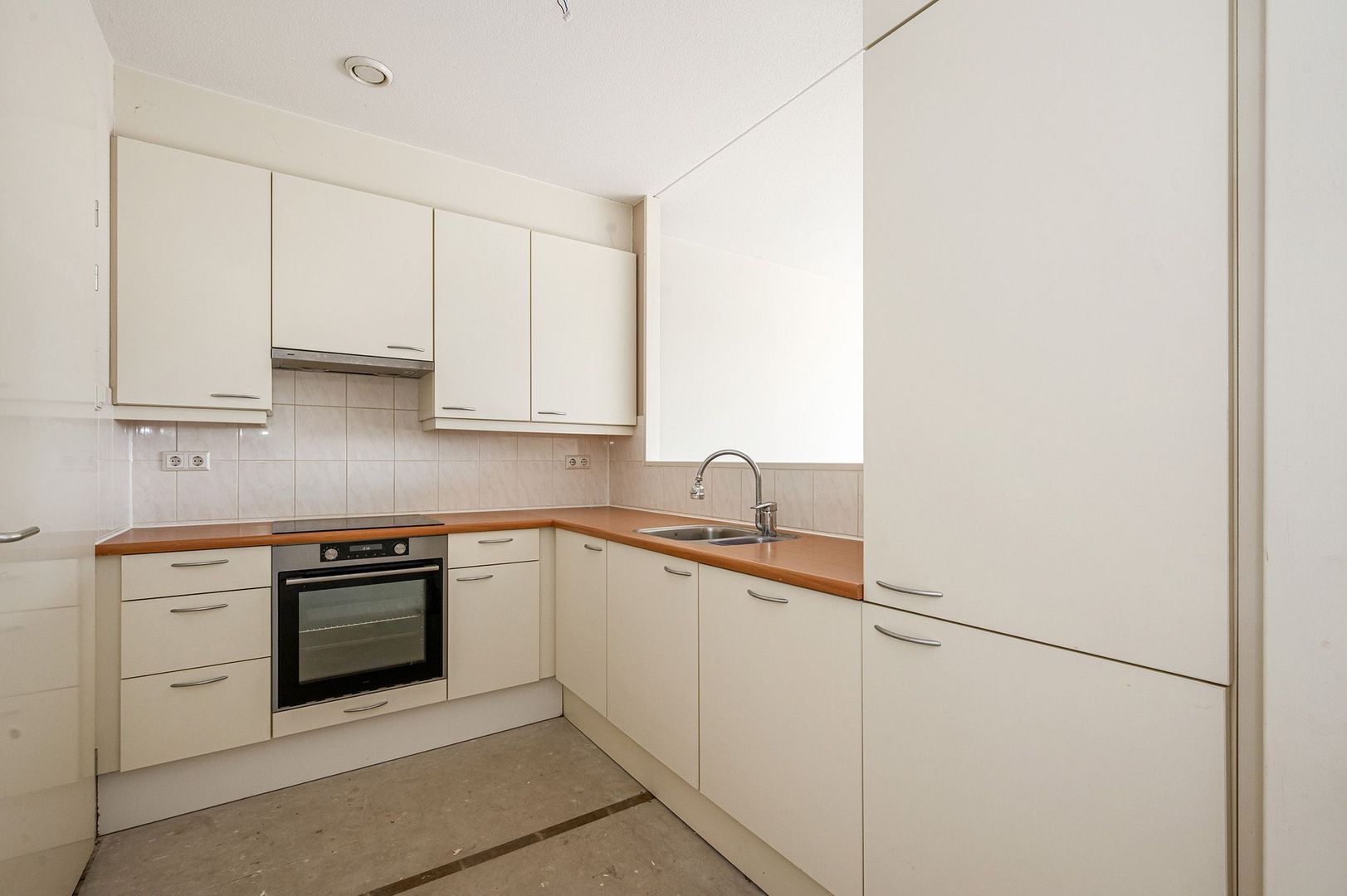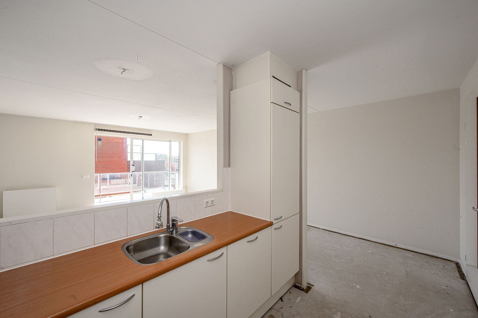 Door de ruime opzet zijn er veel indelingsmogelijkheden. Er staat een L-vormig keukenblok met lichte kastfronten en voldoende opbergruimte boven en onder het werkblad. De keuken is verbonden door een open muur met de woonkamer, ideaal om hier een bar te creëren en een echte woonkeuken te realiseren.