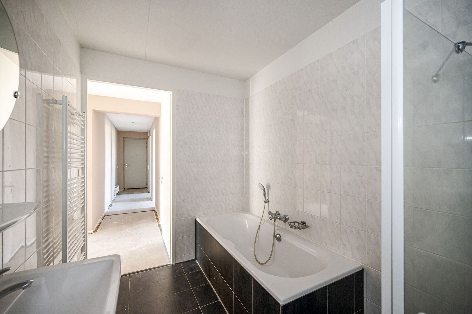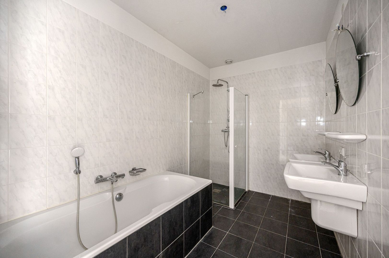 De grotendeels betegelde badkamer is bereikbaar vanuit de centraal gelegen hal. De badkamer heeft een douchegelegenheid, ligbad/bad-douchecombinatie, wastafel en een spiegel met planchet. De toiletruimte is apart en voorzien van een fonteintje.