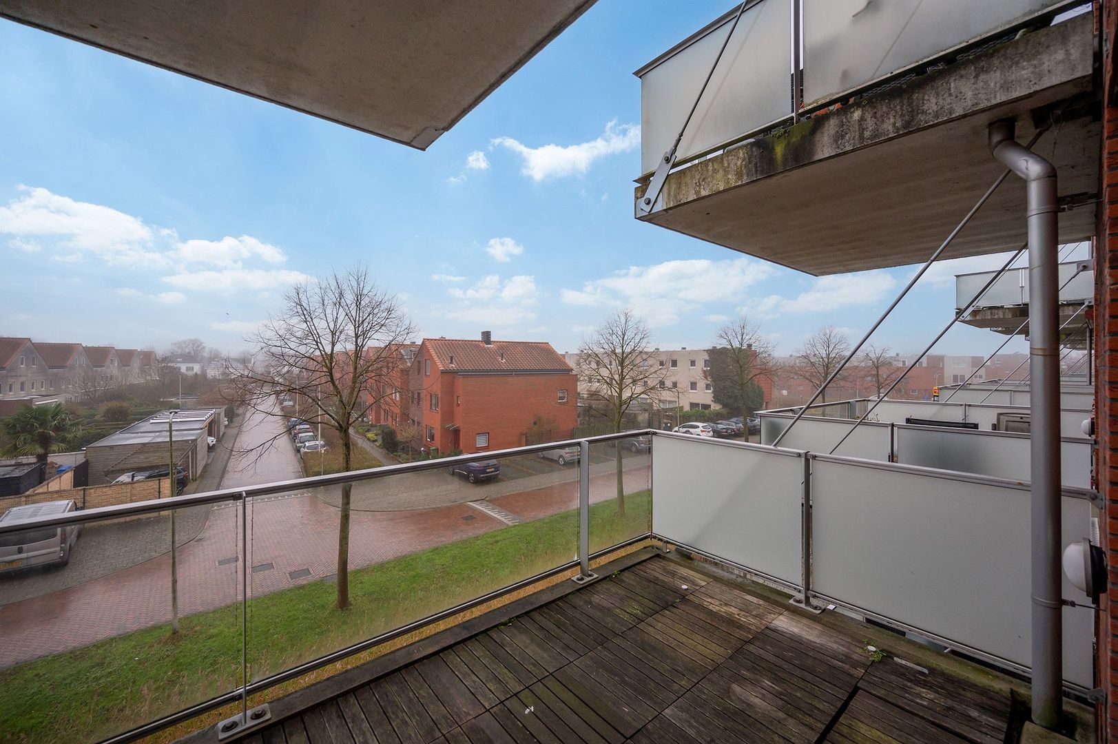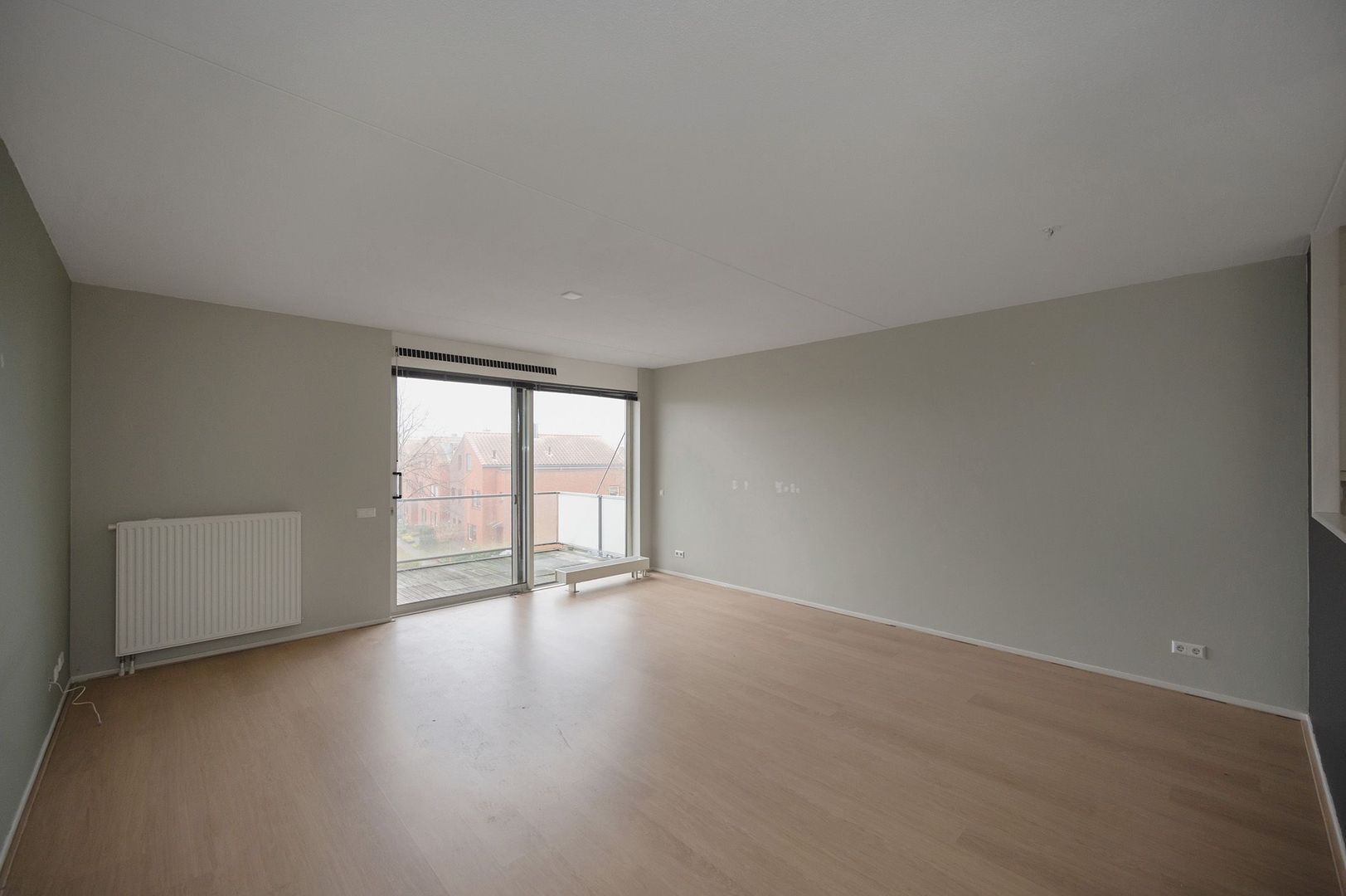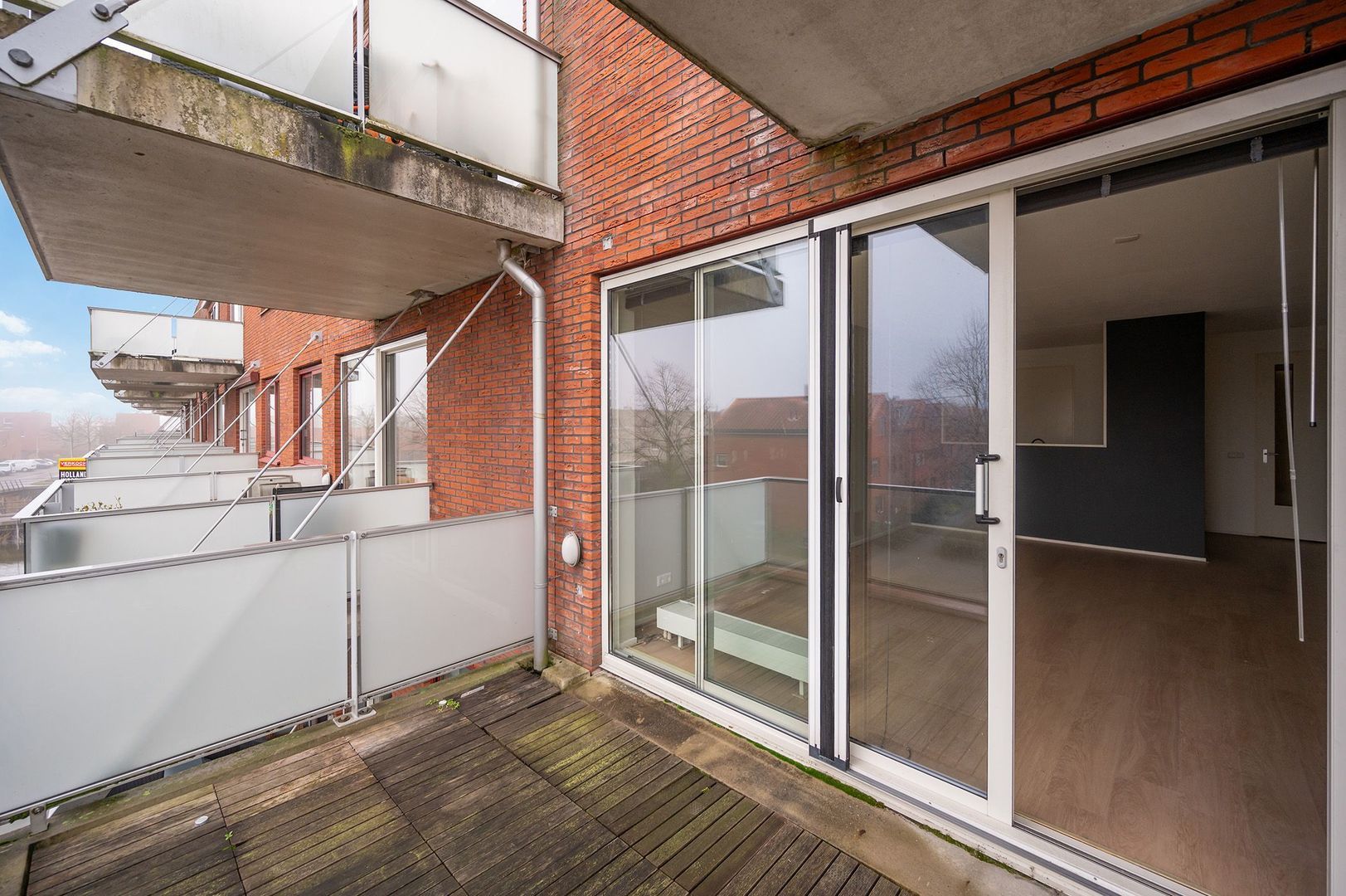 De schuifpui in de woonkamer geeft toegang tot het balkon, dat gunstig gelegen is op het zuiden. Door de ruime afmetingen kun je hier een gezellige zithoek creëren.