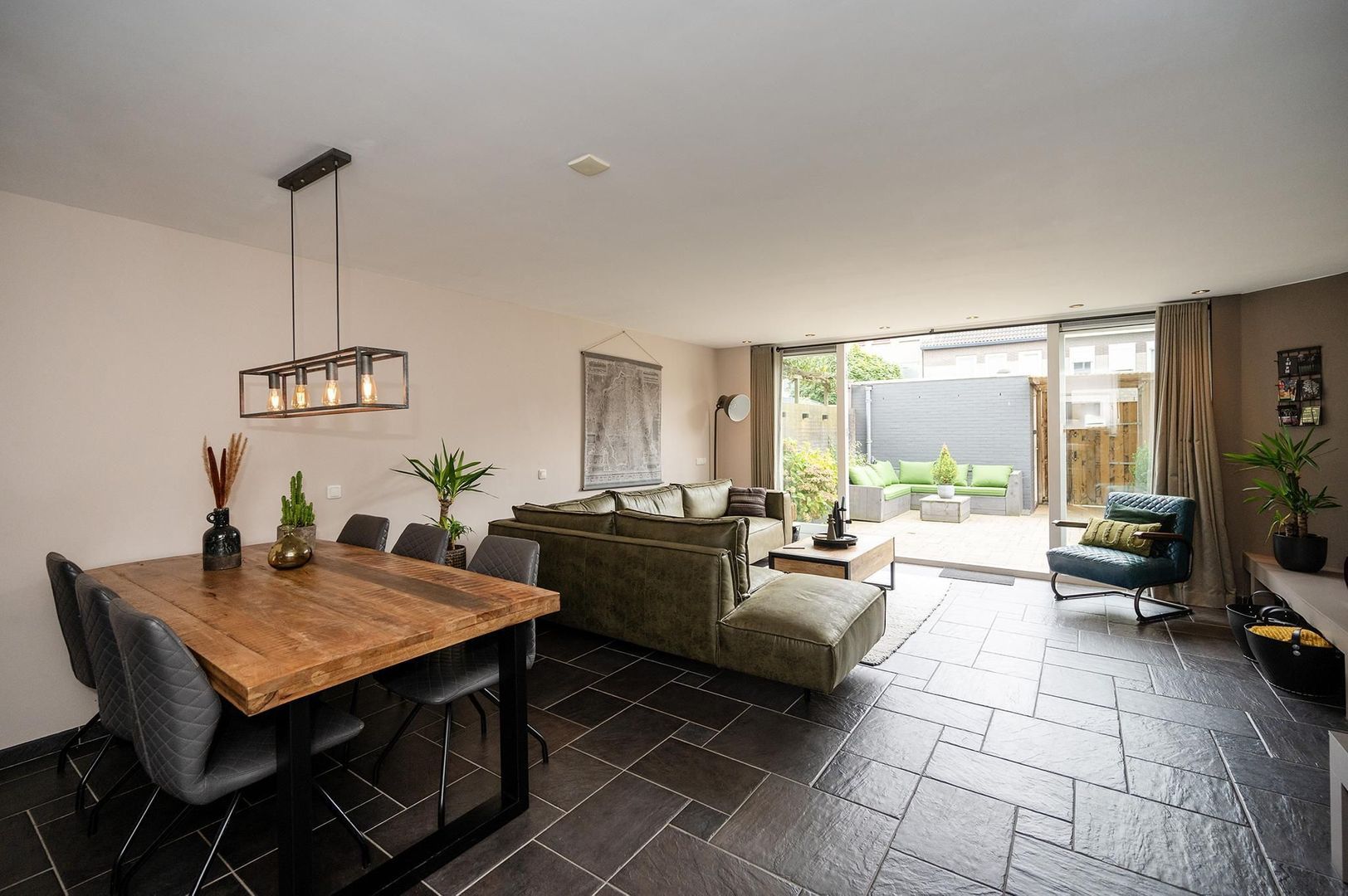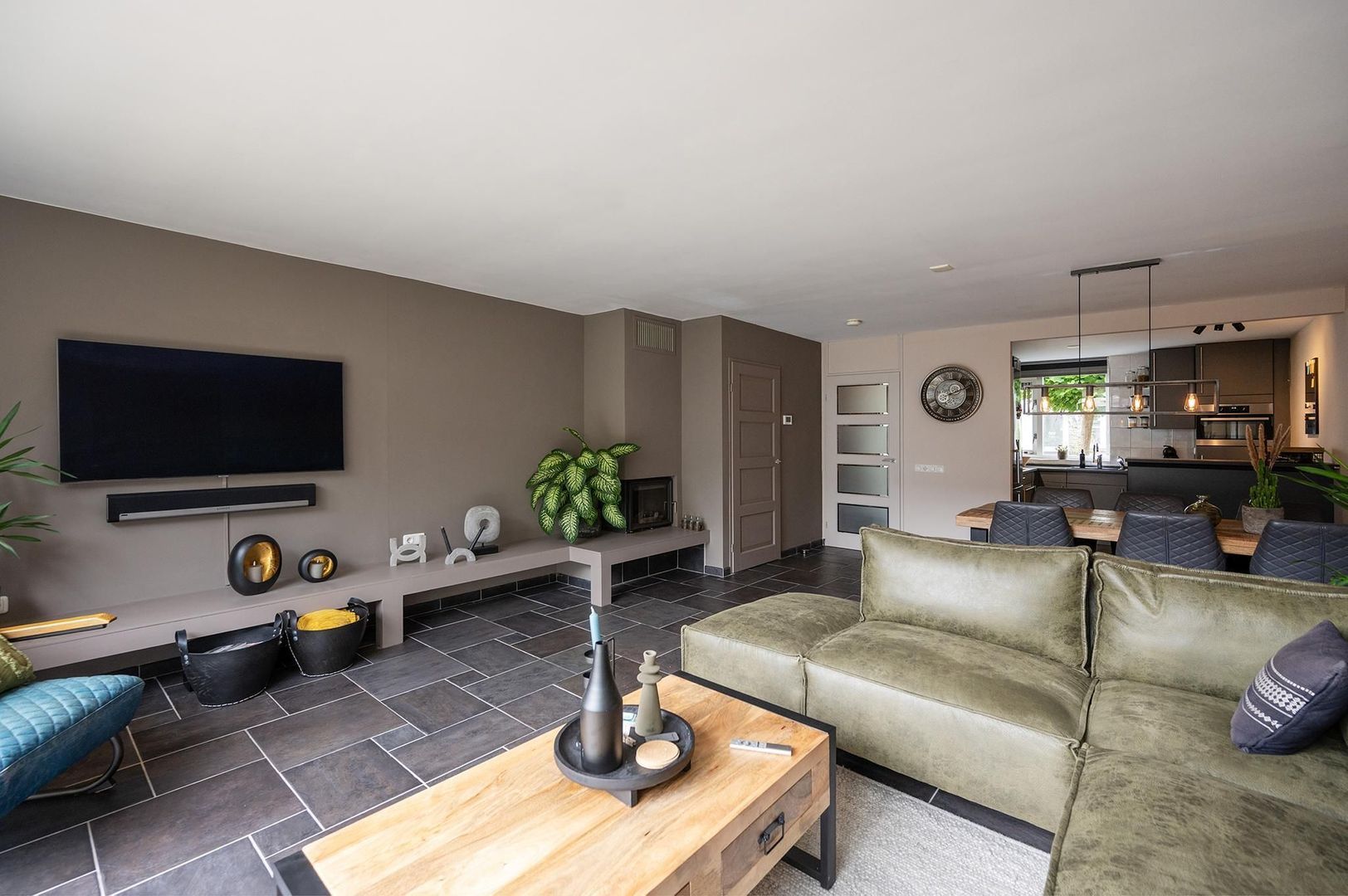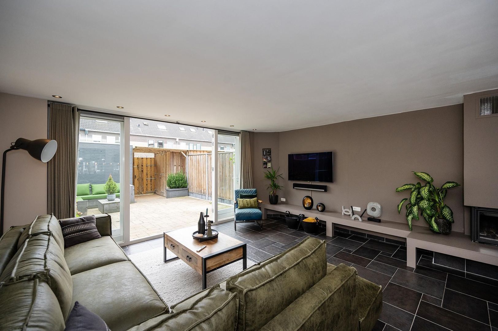 - Uitgebreide woonkamer met vloerverwarming, houtkachel en openslaande deuren naar een zonnige achtertuin op het zuiden.