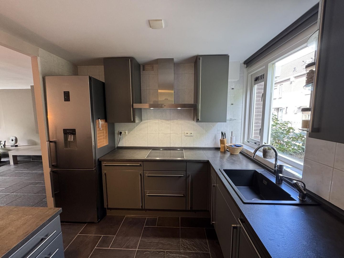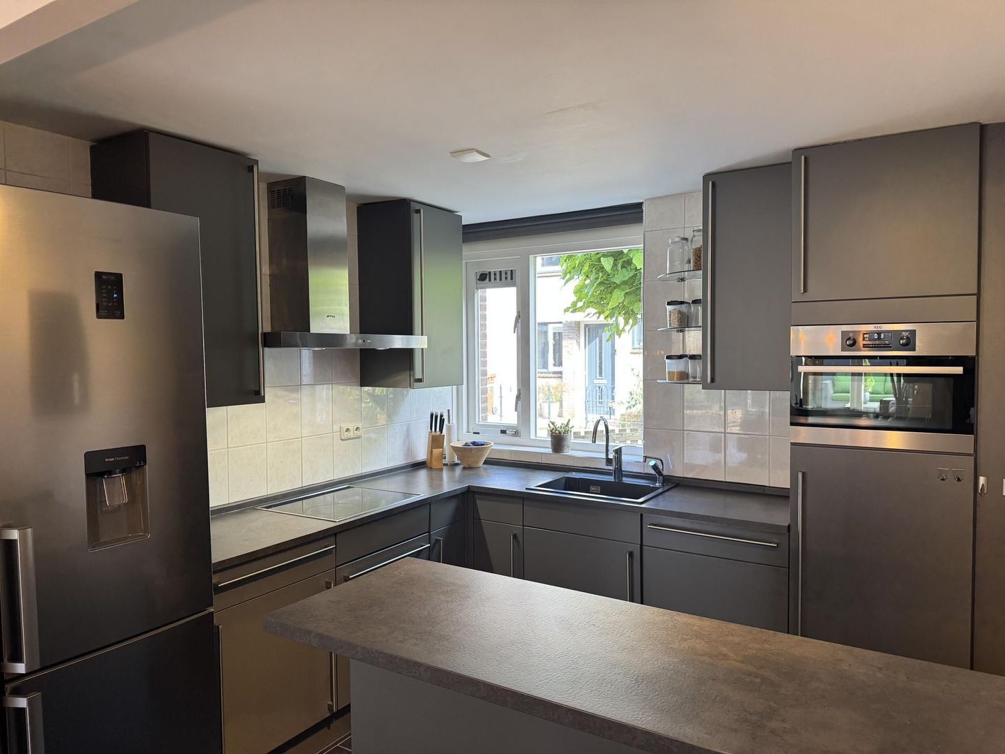 De open keuken aan de voorzijde van de woning heeft een moderne L-vormige opstelling met grijze kastfronten en RVS handgrepen. De keuken is voorzien van diverse hoogwaardige inbouwapparaten, zoals een keramische kookplaat, afzuigkap, combimagnetron, vaatwasser en koel-vriescombinatie.