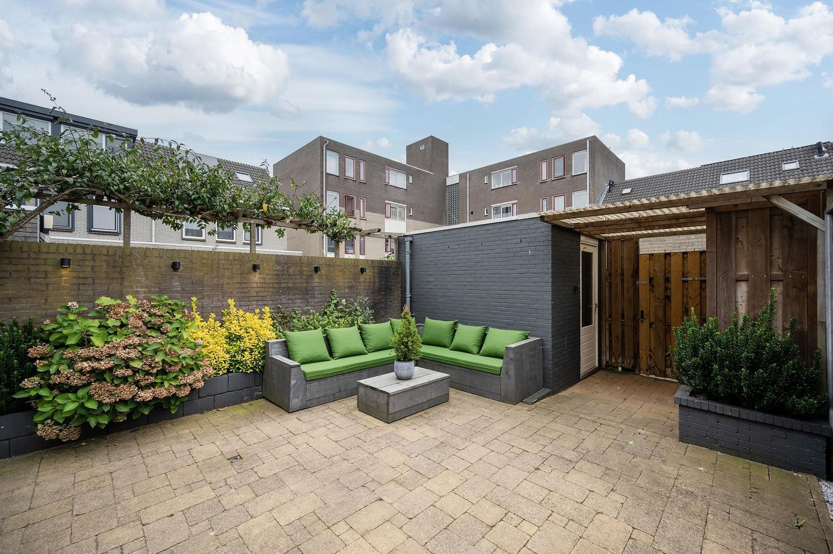 - Fraai aangelegde, onderhoudsvriendelijke tuin met stenen berging en overkapping.