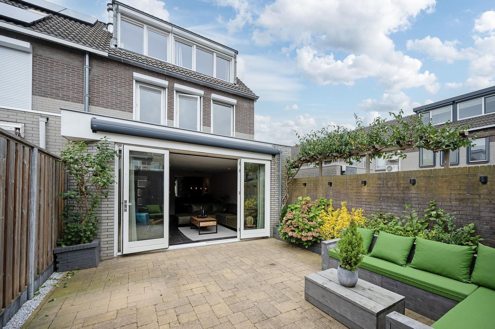 De zonnige achtertuin, gelegen op het zuiden, is fraai aangelegd en onderhoudsarm met sierbestrating en groenborders langs de onderheide tuinmuur. Aan de achtergevel is een elektrisch zonnescherm bevestigd. De tuin heeft verlichte muurelementen en een stenen berging achterin met een overkapping naar de achterom. Dankzij de hoekligging geniet u hier van veel privacy.