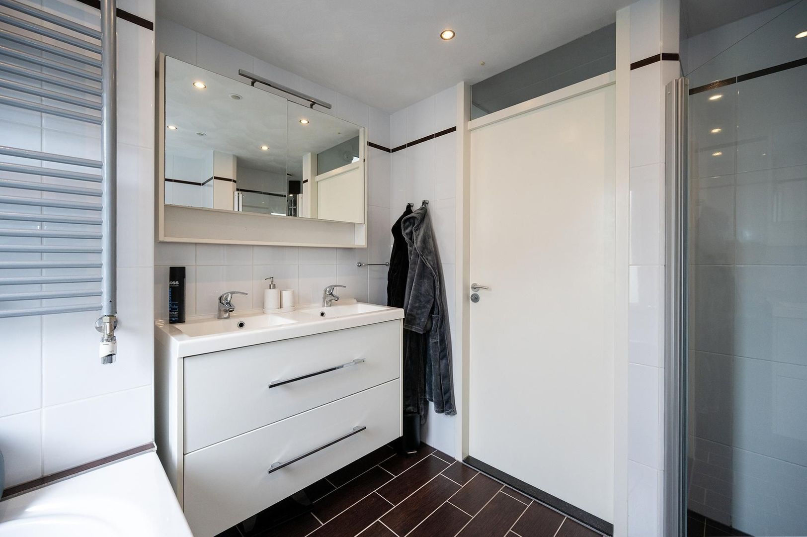 Op de eerste verdieping bevinden zich drie slaapkamers, waarvan twee zijn uitgerust met ruime schuifdeurkasten. De luxe badkamer, uitgevoerd in wit en donkerbruin, beschikt over een dubbele wastafel, whirlpool, inloopdouche, tweede toilet en designradiator. Het verlaagde plafond met inbouwspots en ingebouwde radio geven deze ruimte een extra gevoel van luxe.
