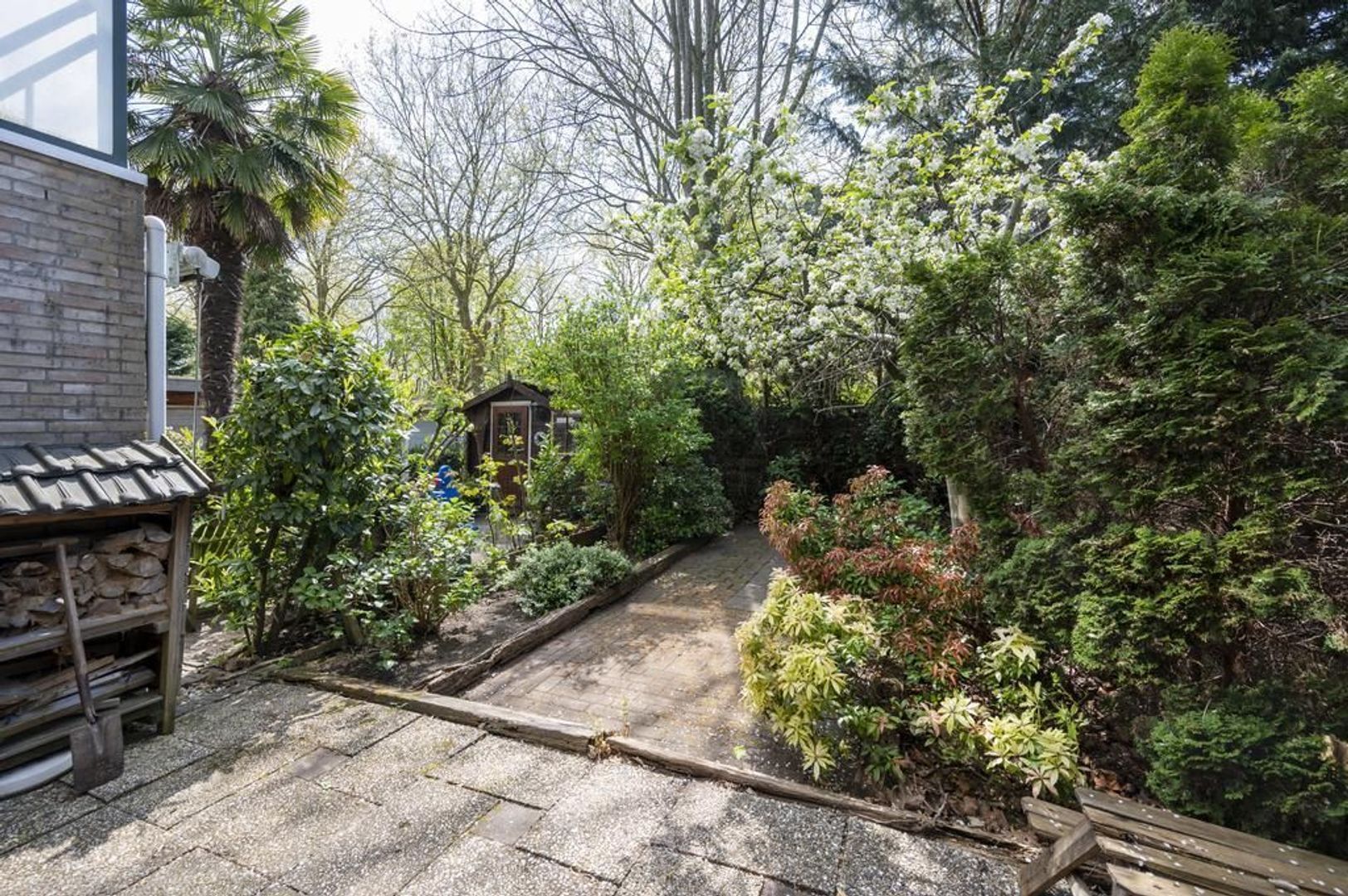 Mooi volgroeide achtertuin, gelegen op het zuiden, met borders aan beiden kanten en diverse bomen.