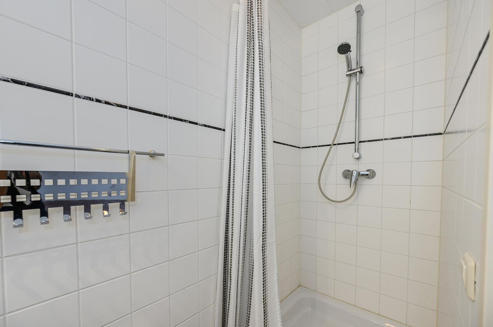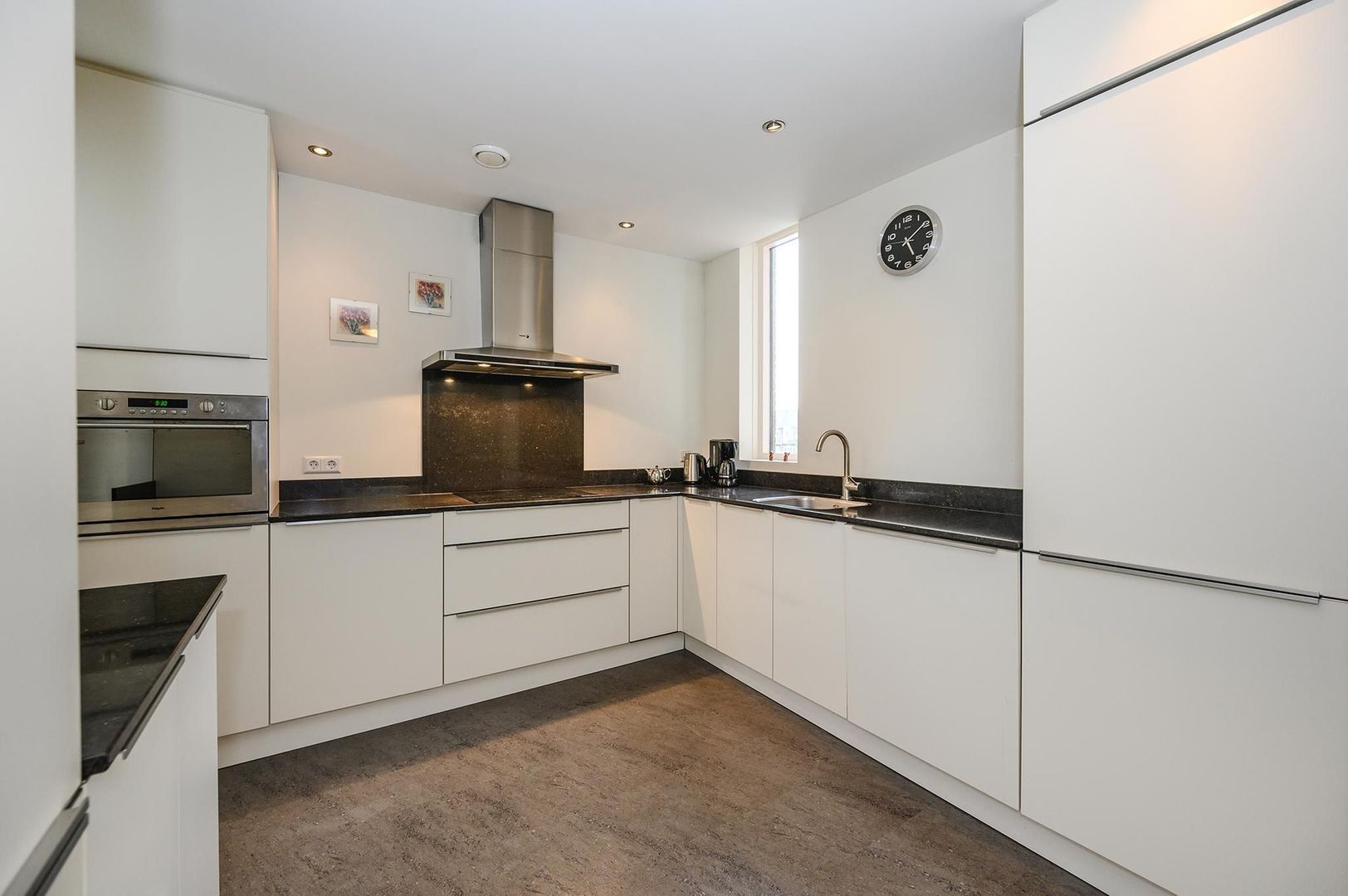De half open keuken is compleet uitgerust met moderne apparatuur en grenst direct aan de eetkamertafel-opstelling. De grote ramen en glazen schuifpui in de woonkamer dragen zorg voor veel natuurlijk lichtinval. Vanuit de woonkamer loopt u zo het riante overdekte balkon op aan het water, waar u de hele dag kunt genieten van alles wat passeert.