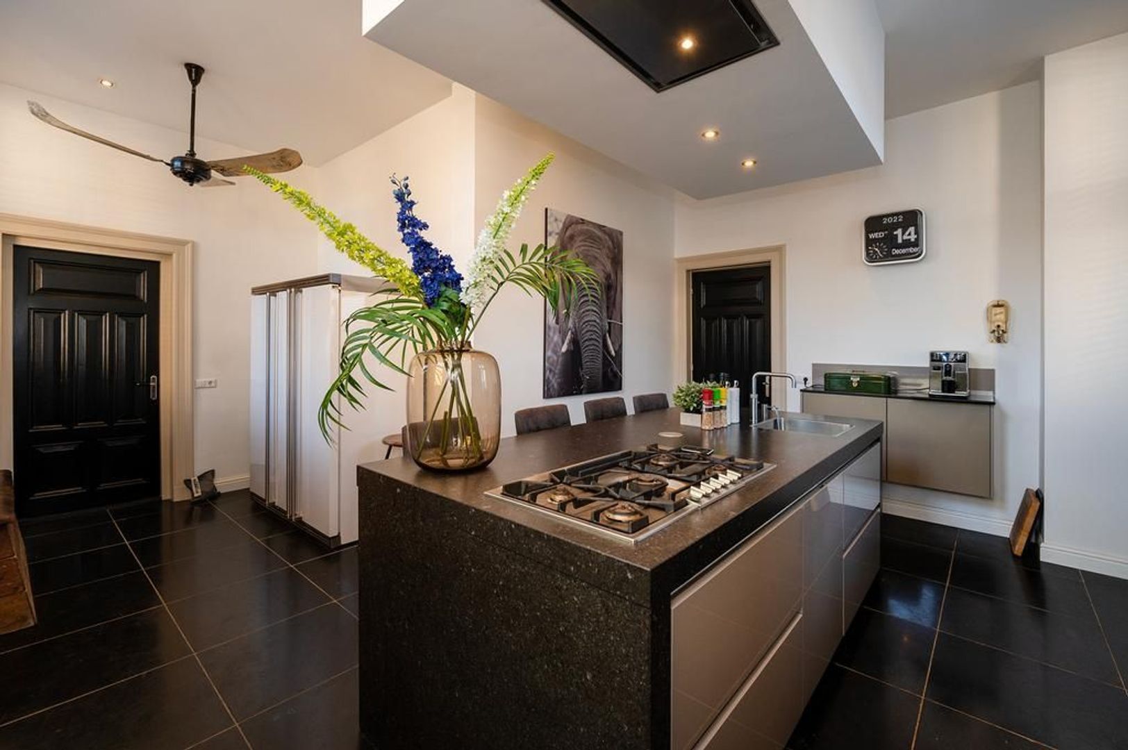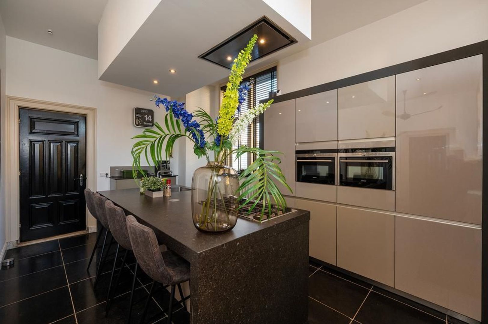 De keuken bevindt zich aan de achterzijde van de woning. In deze luxe keuken bent u van alle gemakken voorzien. Zo treft u hier onder andere een uitgebreide kookplaat, een vaatwasser, een riant kookeiland. Tevens een vrijstaande opstelling van een grote koel- en vrieskast, dus geen gebrek aan ruimte.