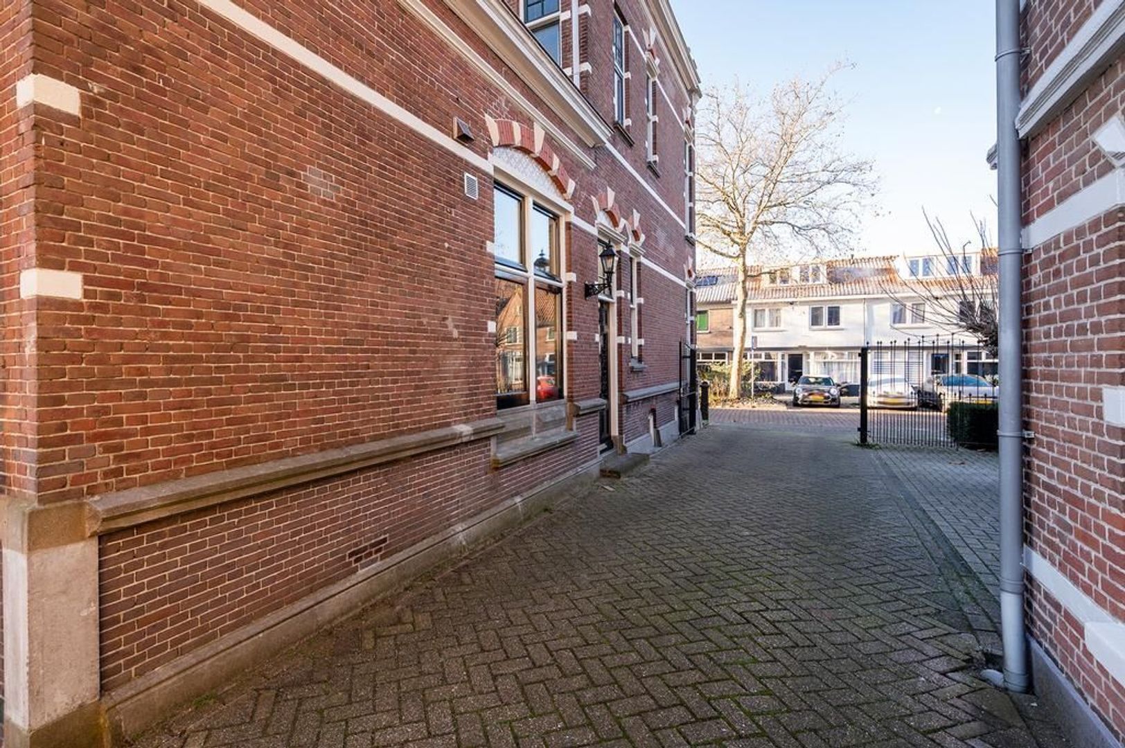 Tegen de achtergevel een éénlaagse uitbouw afgedekt door twee dakschilden met dezelfde pannen. De gevels hebben gepleisterde speklagen en sierstenen op de hoeken en in de strekken boven de vensters, vensters met roedenverdeling in de bovenlichten, deels gekoppeld onder getoogde strekken van oranje baksteen. Het boogveld is gevuld met tableaus in oranje en witte tegels. Rijk gedecoreerde voorgevel (west) met hoge natuurstenen plint met cassettes en panelen. Iets terugliggende middentravee, waarin op de begane grond de entree met aan weerszijden een risaliet. De middentravee wordt bekroond door een topgeveltje met frontonbekroning en daaronder een gepleisterd fries met het jaartal '1902' onder een kroonlijst op consoles. Beide zijrisalieten zijn voorzien van een decoratief fries onder een kroonlijst op consoles.