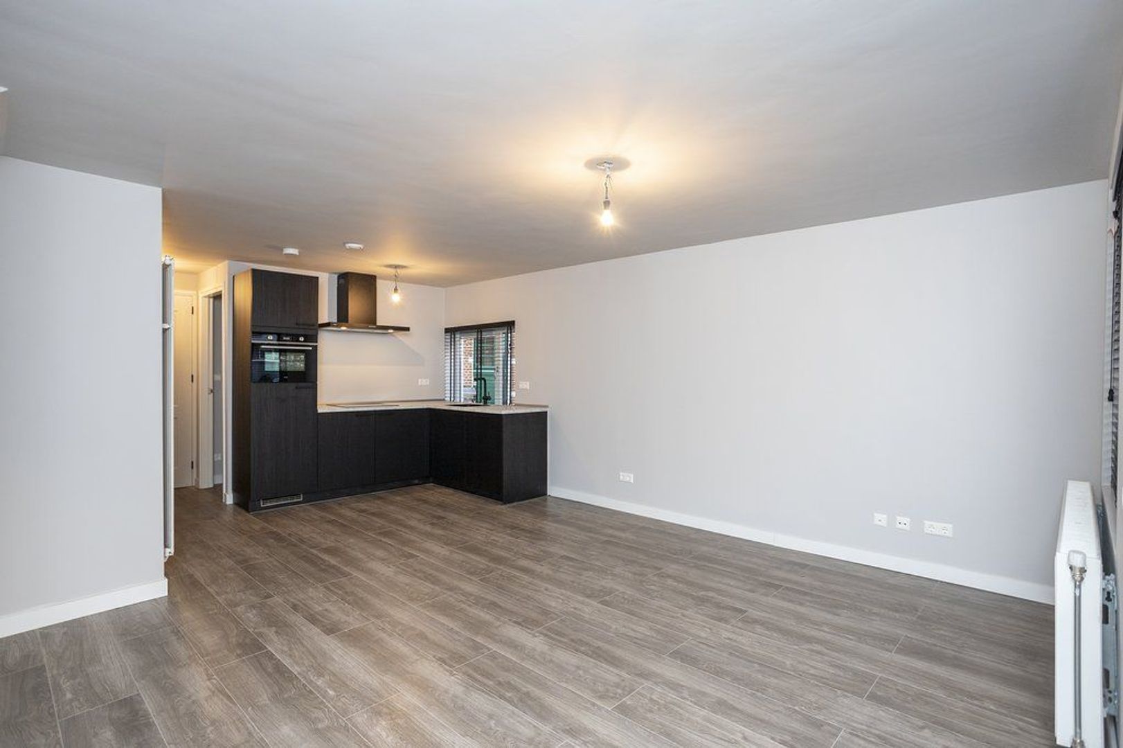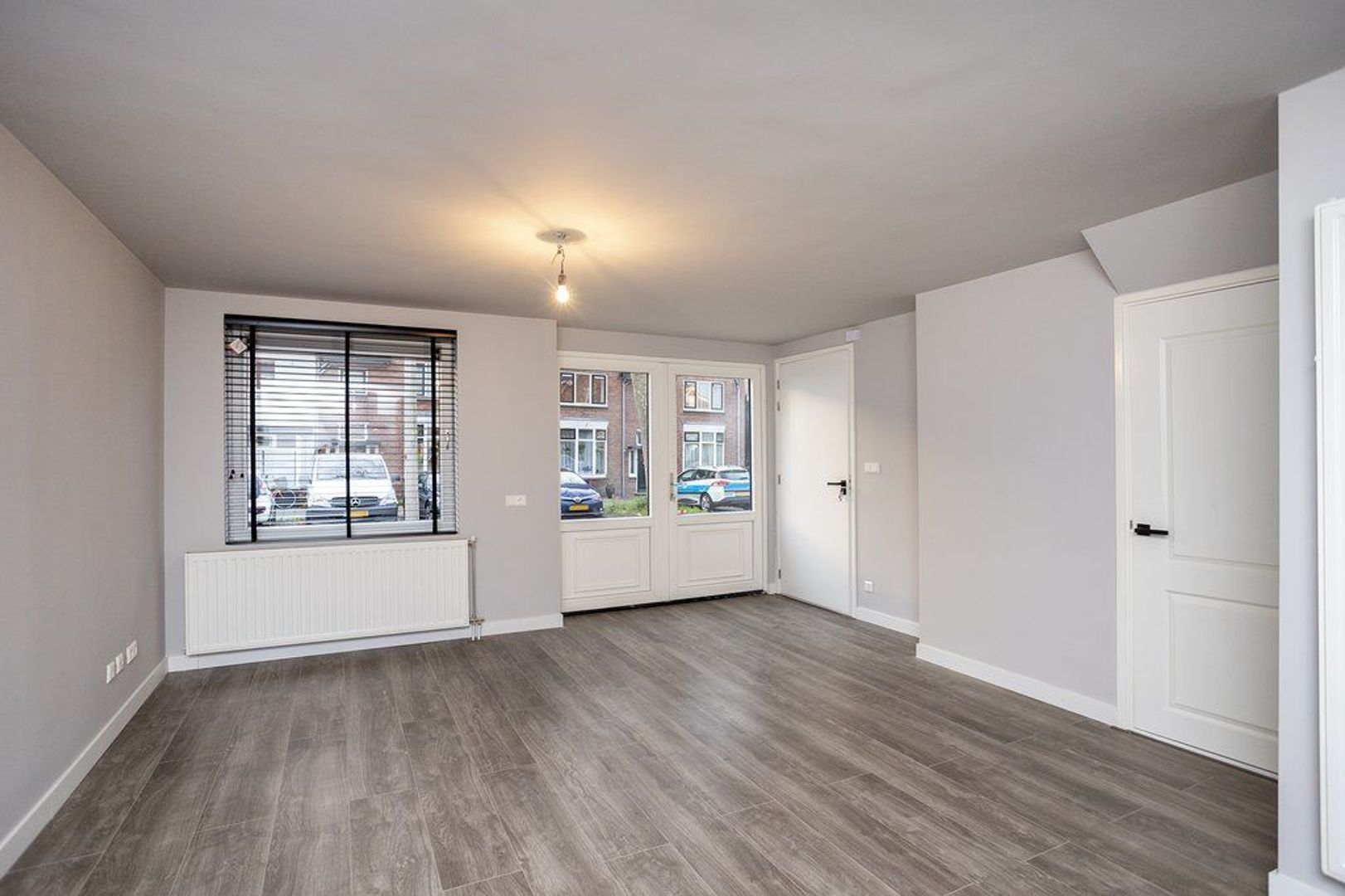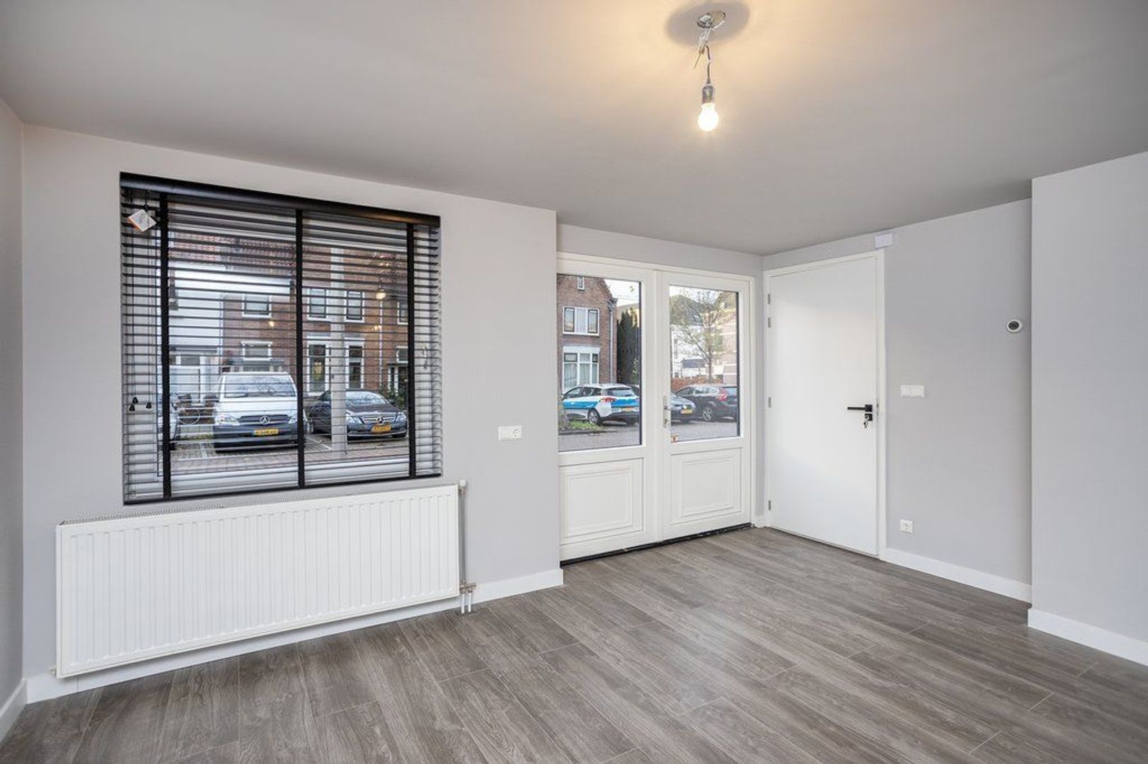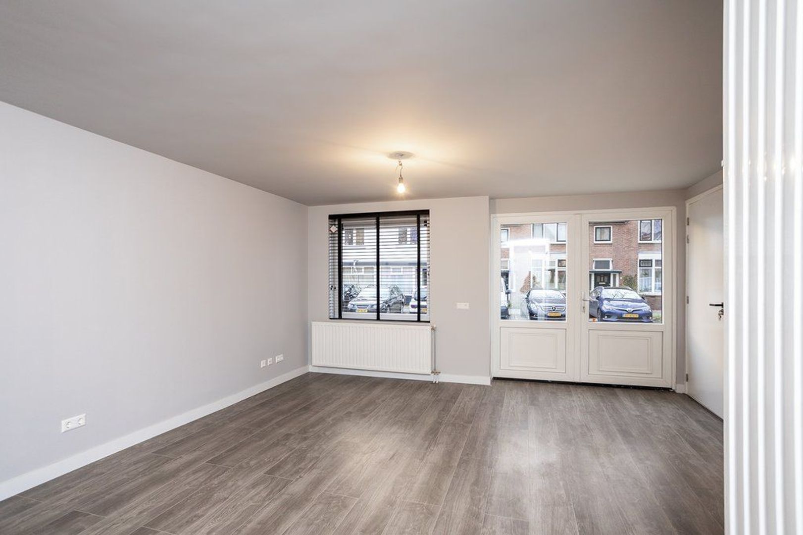 Royale woonkamer met openslaande deuren naar buiten. De wanden en het plafond zijn fraai glad gestuukt en mede door de grote raampartij valt er heerlijk veel licht in de woonkamer. Dit alles geeft het appartement een positieve vibe.