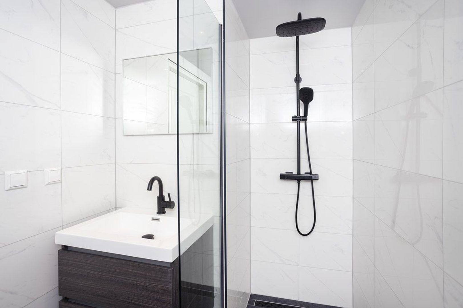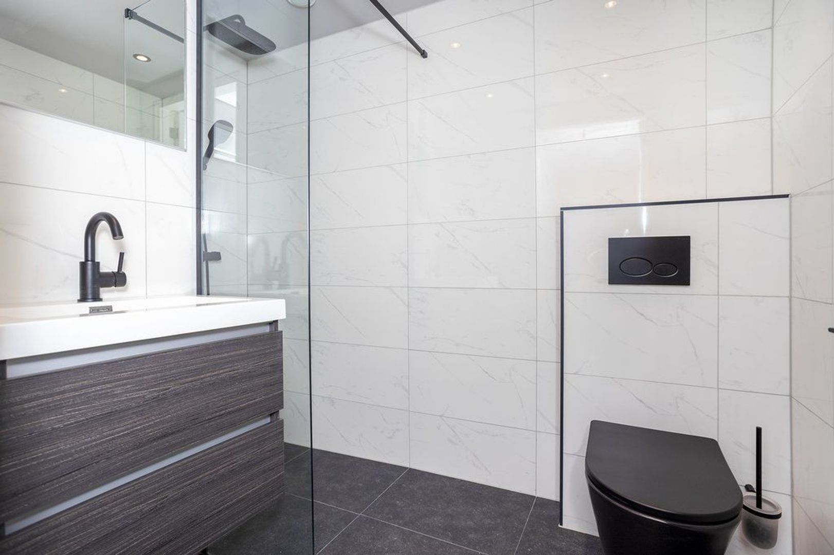 De ruimte heeft een luxe wandtegel en is deels strak gestuukt. Ook hier overheerst een ruimtelijk gevoel.