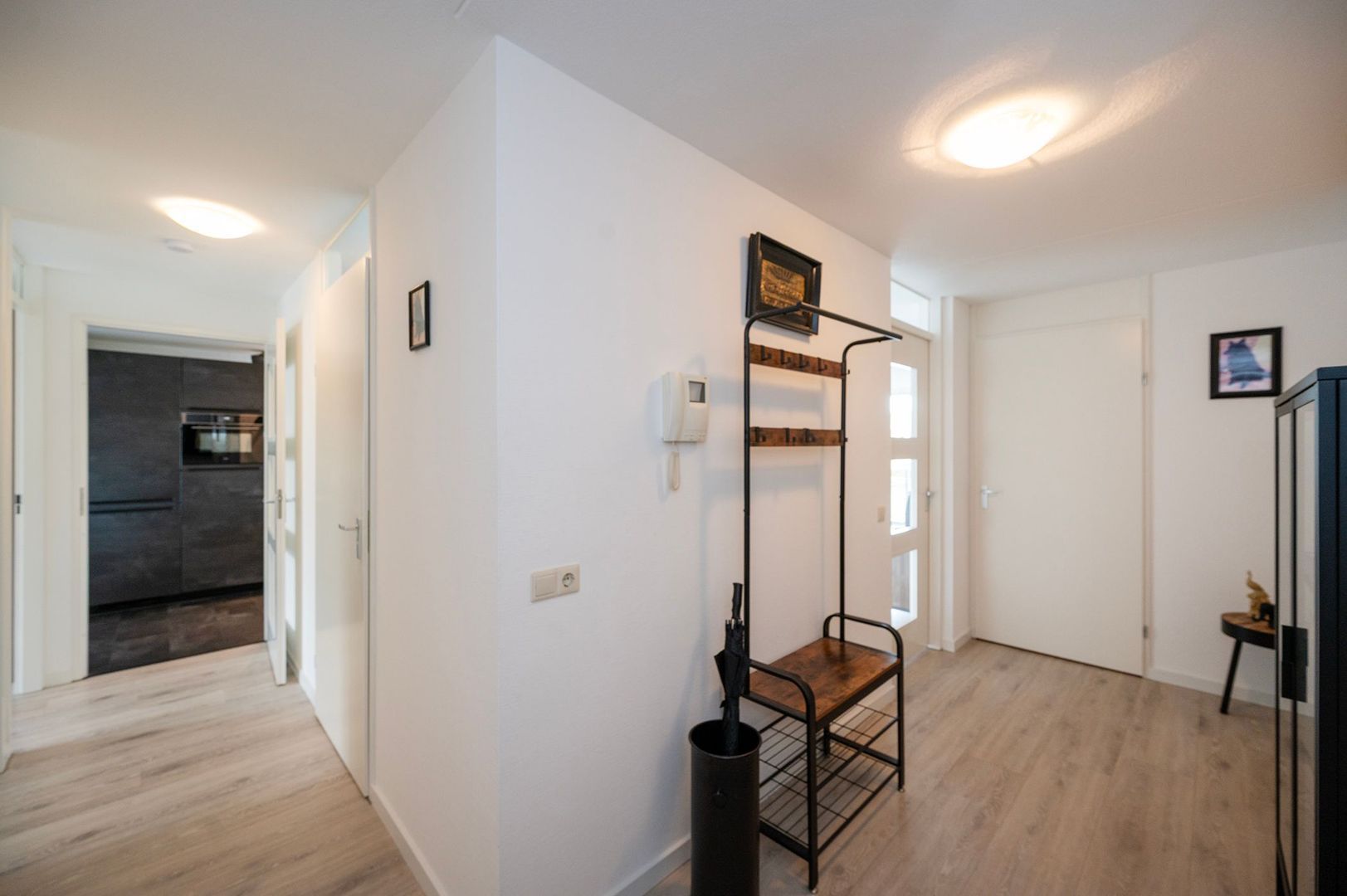 De entreehal geeft toegang tot alle vertrekken. Het speelse aan deze woning is dat u een rondje kunt lopen vanuit de entreehal, via de woonkamer, keuken en weer uitkomt in de entreehal. Deze praktische indeling geeft het appartement een unieke en open sfeer.