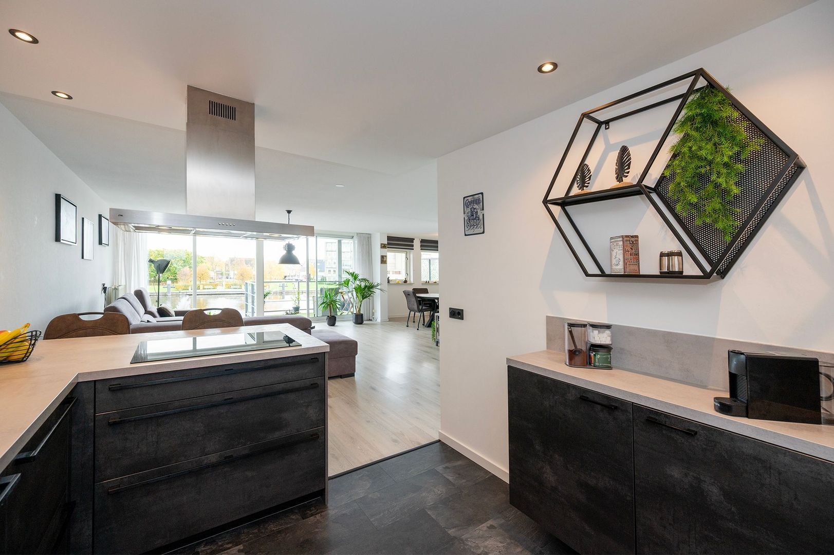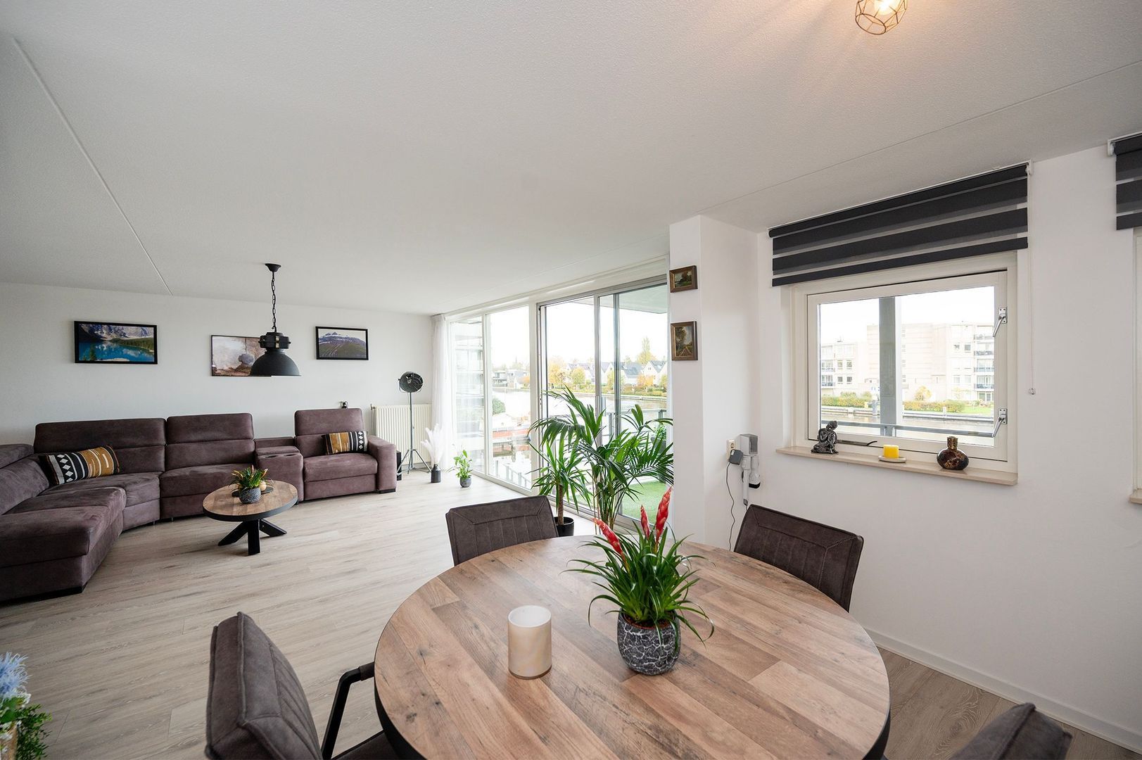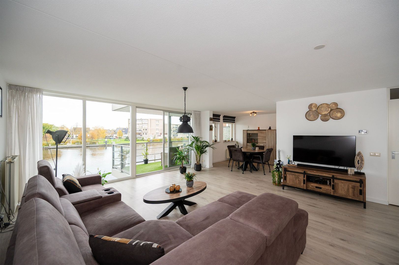 Dankzij de grote ramen valt het daglicht rijkelijk binnen en ontstaat er een heerlijk open en serene sfeer. De schuifpui geeft u toegang tot het grote terras aan de Oude Rijn! Hier kunt u heerlijk genieten van het uitzicht en buitenlucht. De zithoek is royaal en biedt genoeg plaats voor een comfortabele bank en aanvullende zitmeubels. Aansluitend bevindt zich een aparte eethoek, die op een natuurlijke manier in de ruimte is opgenomen. De open indeling zorgt voor een mooie verbinding, terwijl beide zones toch hun eigen sfeer houden.