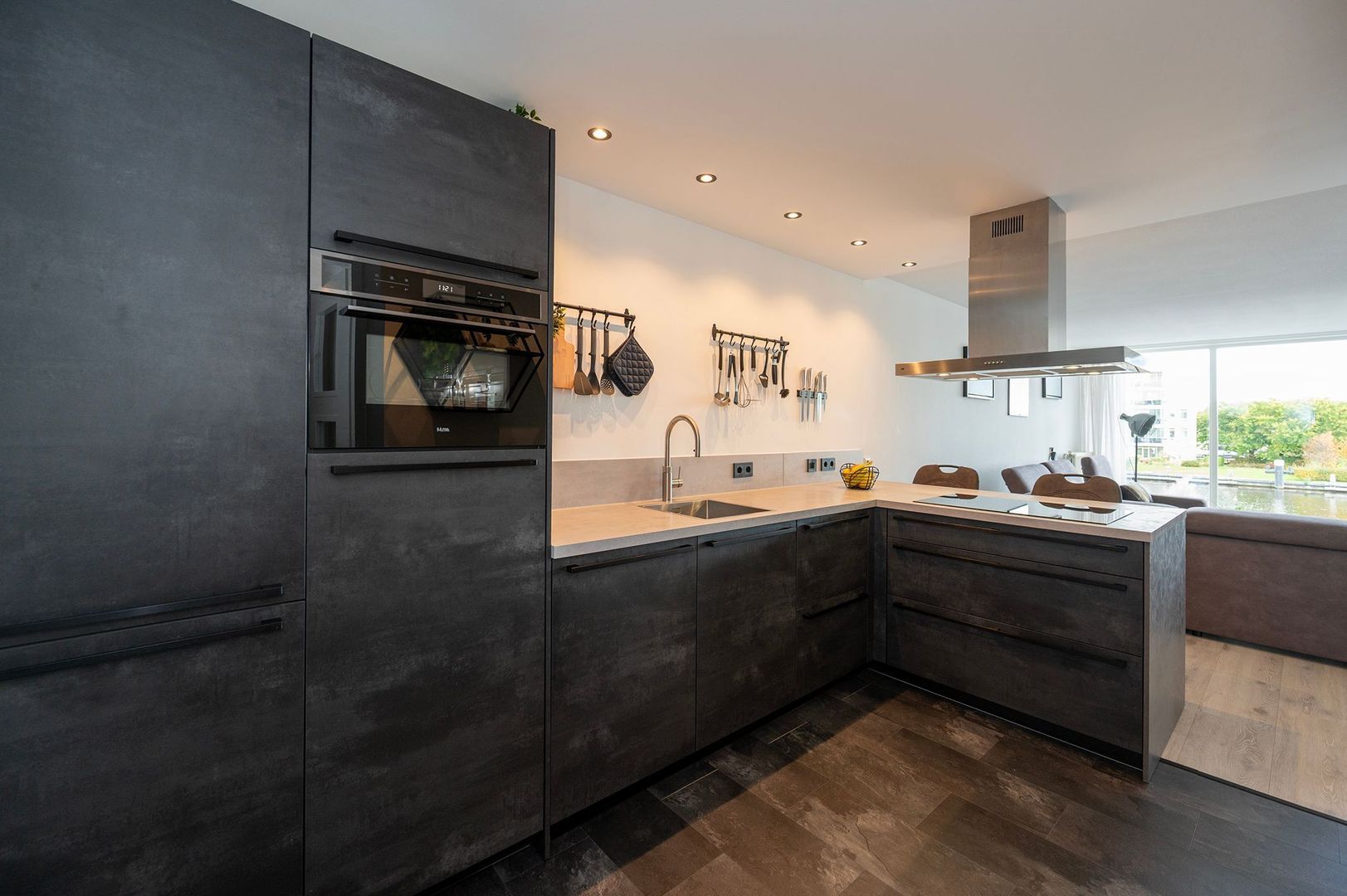 De moderne keuken is een ware blikvanger en combineert stijl met functionaliteit. De strakke, donkere fronten vormen een mooi contrast met het lichte werkblad en geven de ruimte een luxe uitstraling. Het bar-eiland nodigt uit tot informele gesprekken terwijl je kookt, perfect voor socializen met vrienden of familie. Verder is de keuken is voorzien van inbouwapparatuur. De ruime indeling biedt volop werkruimte en opbergruimte, terwijl de kookplaat met ingebouwde afzuiging zorgt voor een strak en minimalistisch geheel. Vanuit de keuken heeft u direct contact met de woonkamer en het balkon, waardoor koken en gezellig samen zijn hier moeiteloos samengaan. Het open karakter, gecombineerd met het prachtige uitzicht door de grote raampartijen, geeft deze leefruimte een heerlijk lichte en uitnodigende sfeer. De keuken is niet alleen praktisch, maar ook een echte eyecatcher, de ideale plek voor iedereen die houdt van modern wonen met comfort en stijl.