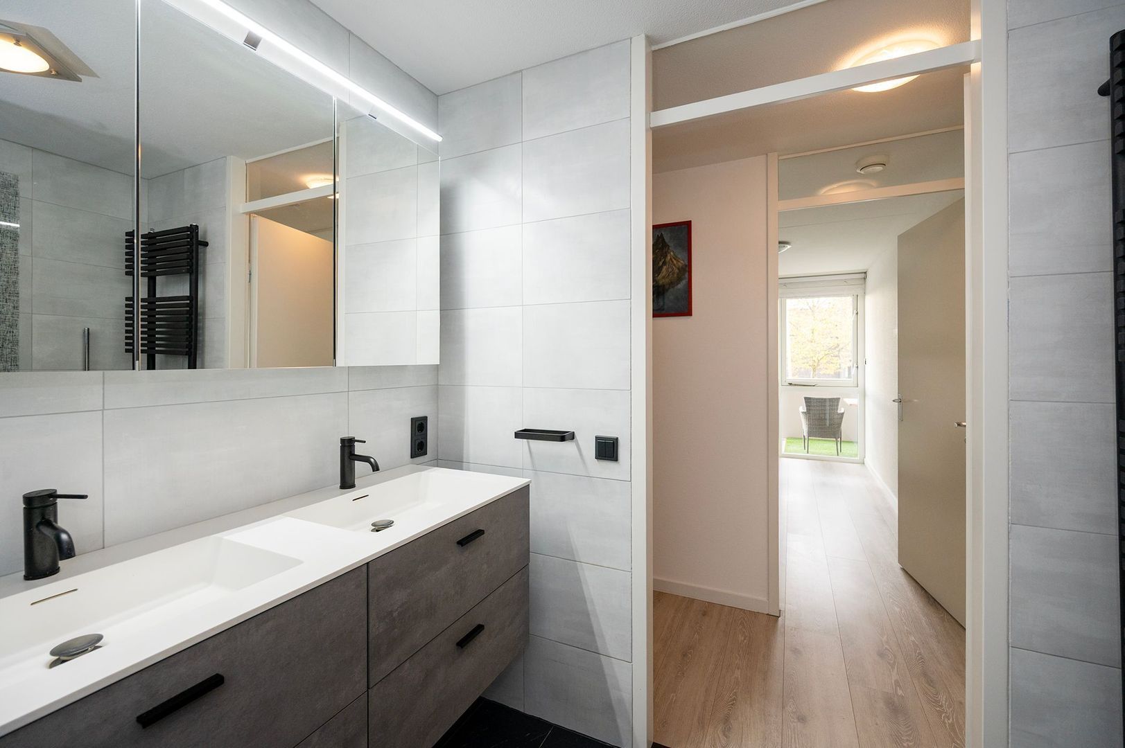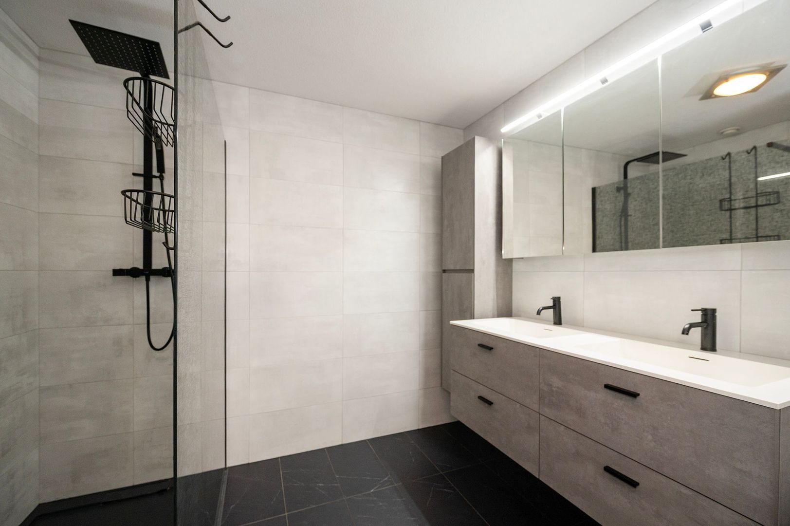 De keurige badkamer heeft een donkere vloer en lichte wandtegels en is voorzien van een inloopdouche, radiator, dubbele wastafel en wastafelmeubel met veel opbergruimte.