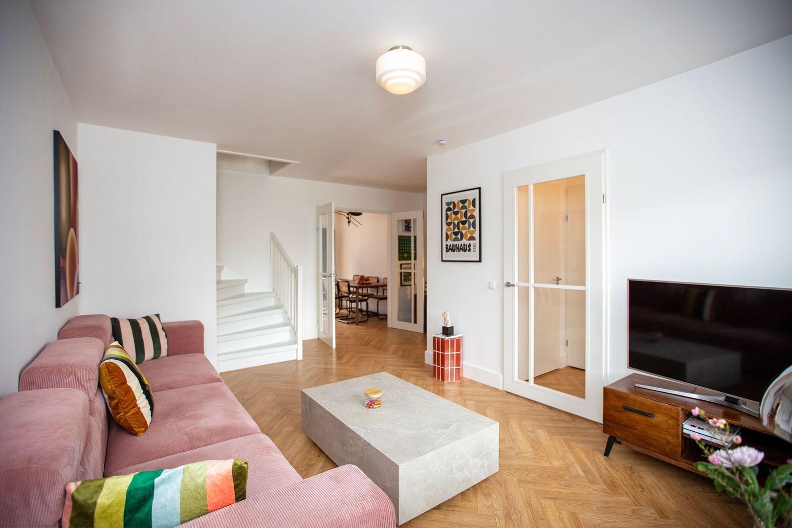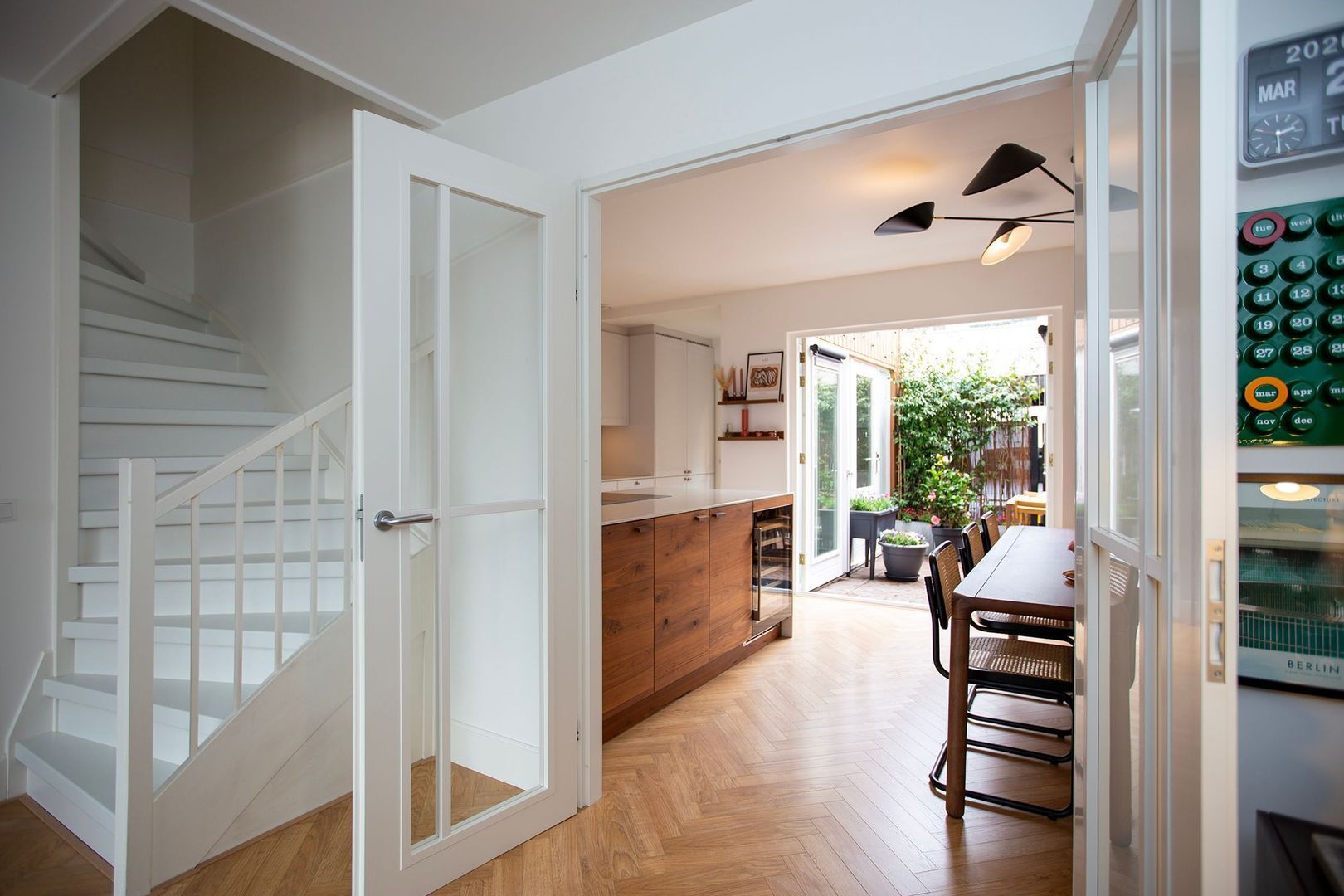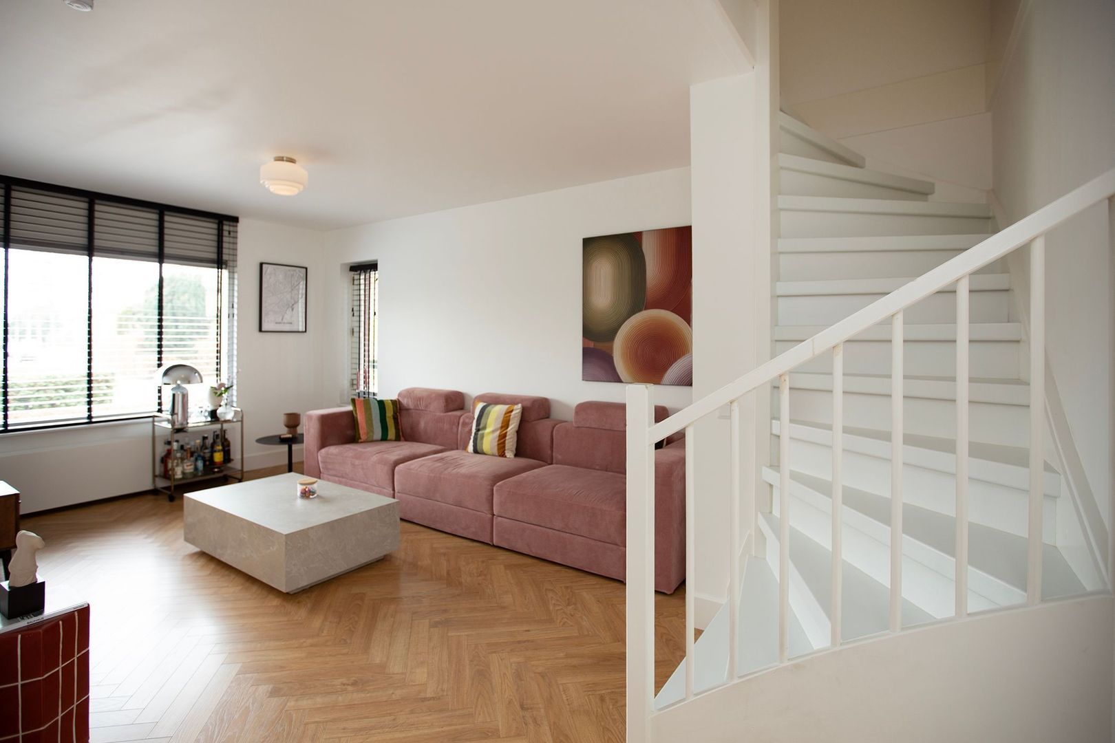 De woonkamer beschikt over een trapopgang naar de eerste verdieping en staat middels tussendeuren in verbinding met de half-open leefkeuken.