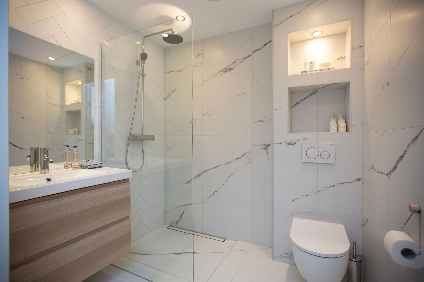 De badkamer is centraal gelegen en uitgevoerd in een moderne, neutrale kleurstelling met een luxe uitstraling. Deze beschikt over een inloopdouche, wastafelmeubel en een tweede toilet.