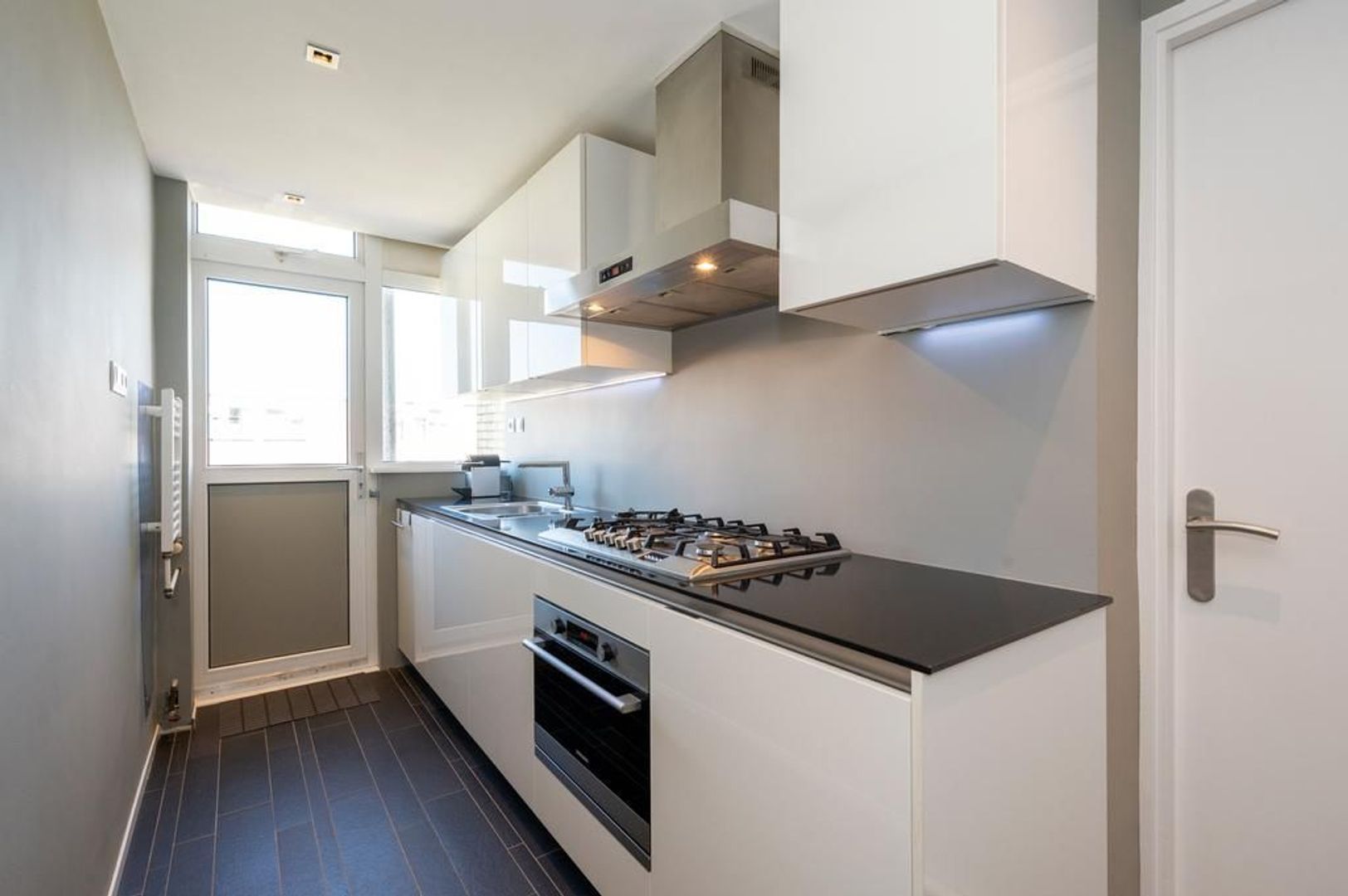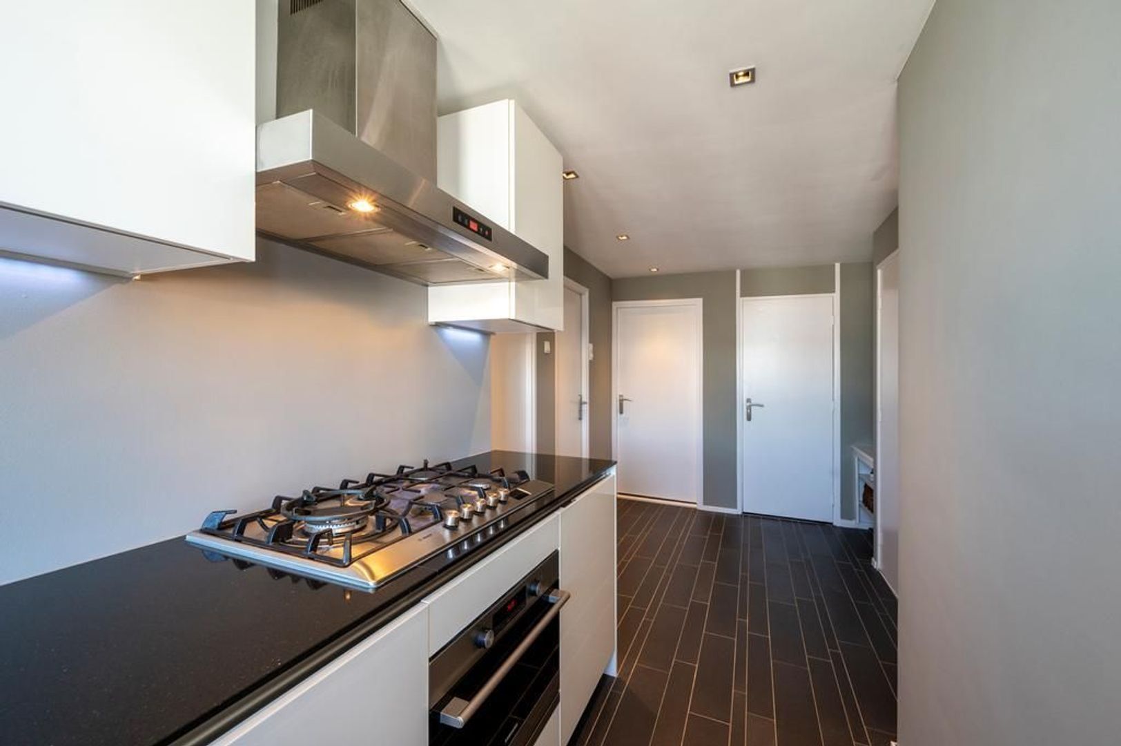 De strakke hoogglans witte keuken (Bemmel en Kroon) met oriental black composiet werkblad is voorzien van diverse inbouwapparatuur. Vanuit de keuken is er toegang tot het 2e balkon.