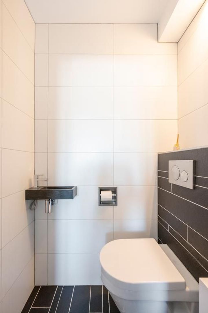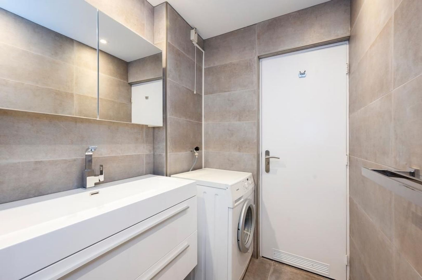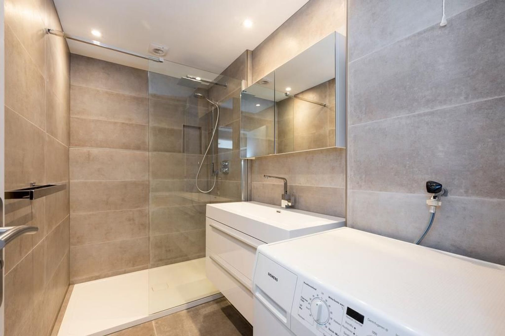 De moderne badkamer is vergroot doormiddel van de vaste inbouwkast uit de hal in de inbouwkant uit de eetkamer erbij te betrekken.