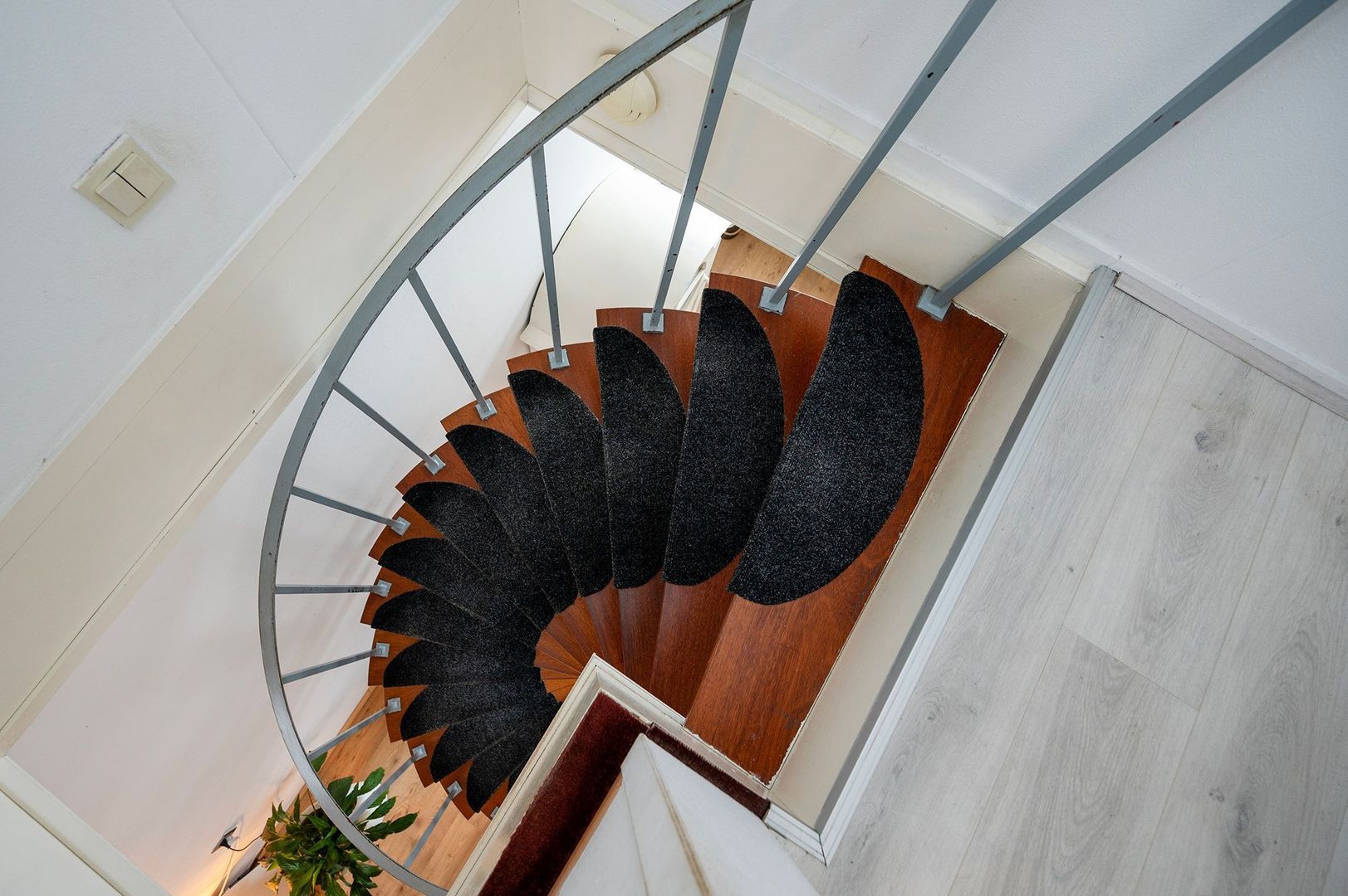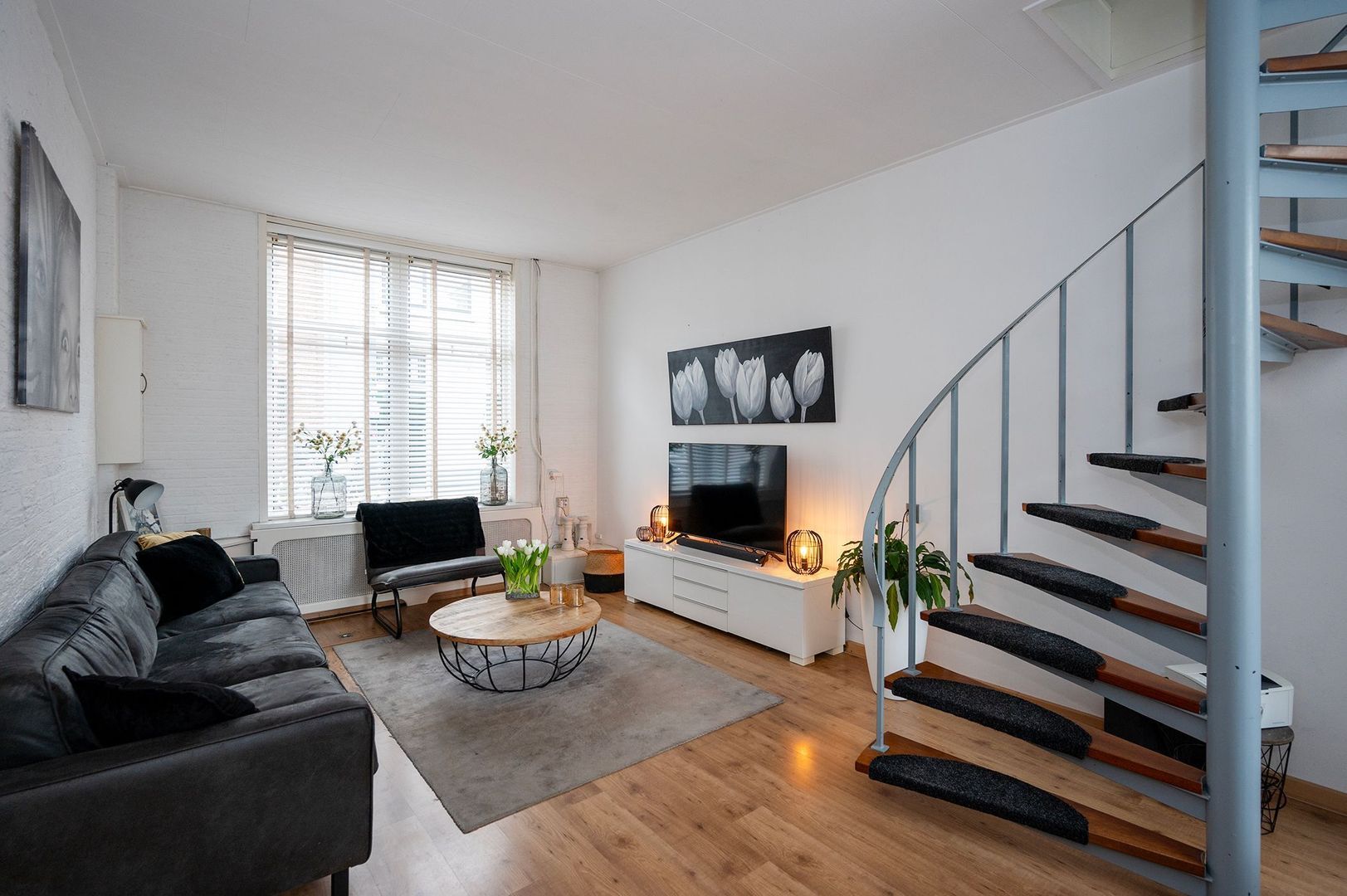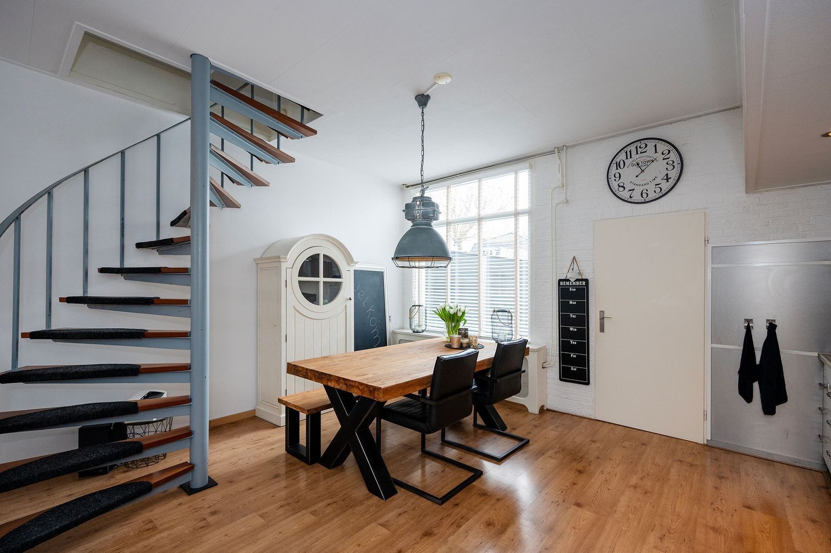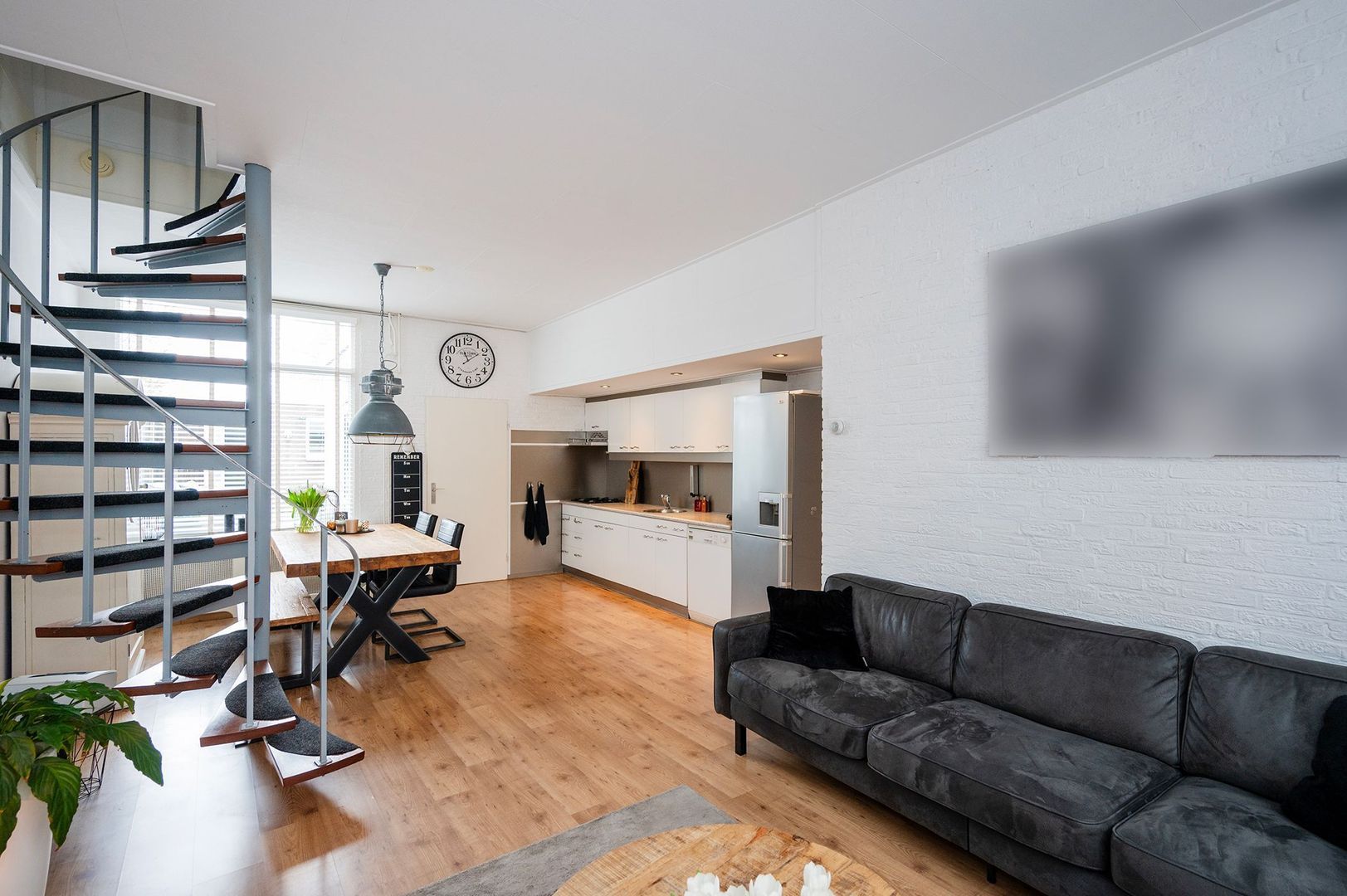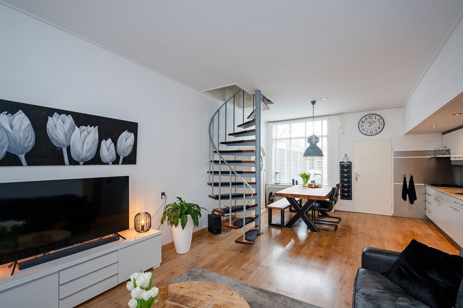 De lichte doorzon woonkamer is een uitnodigende ruimte met een hoog plafond, waar het zonlicht vrij spel heeft. De aanwezigheid van een wenteltrap naar de eerste verdieping voegt karakter toe aan de ruimte.