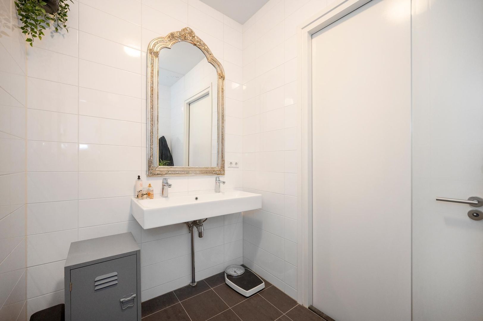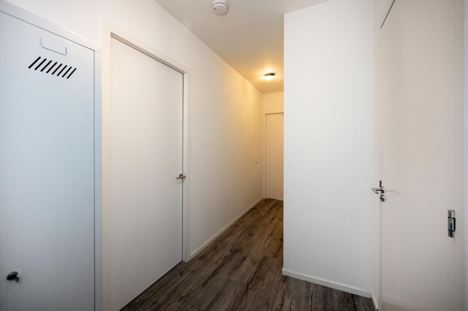 Entree van het appartement, ruime hal met kastruimte alwaar zich de technische installatie, alsmede de wasmachine/droger aansluiting bevindt. De hal geeft verder toegang tot alle overige vertrekken. Toiletruimte met vrij-hangend closet en fonteintje.