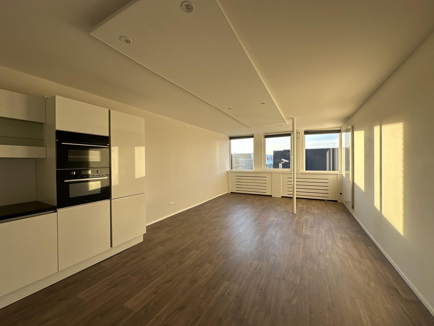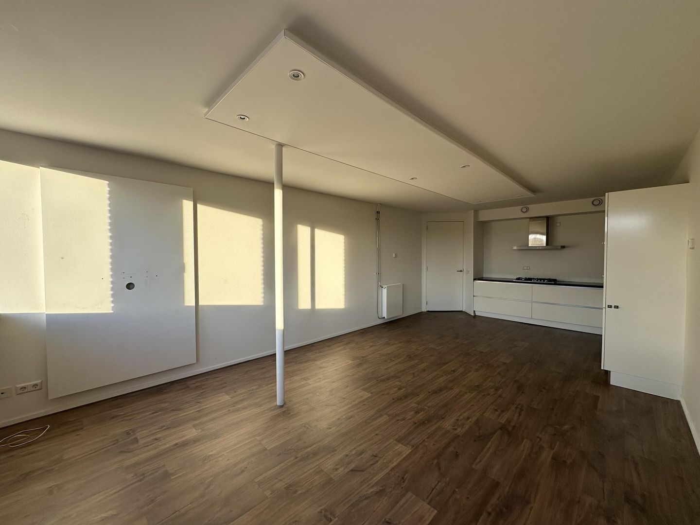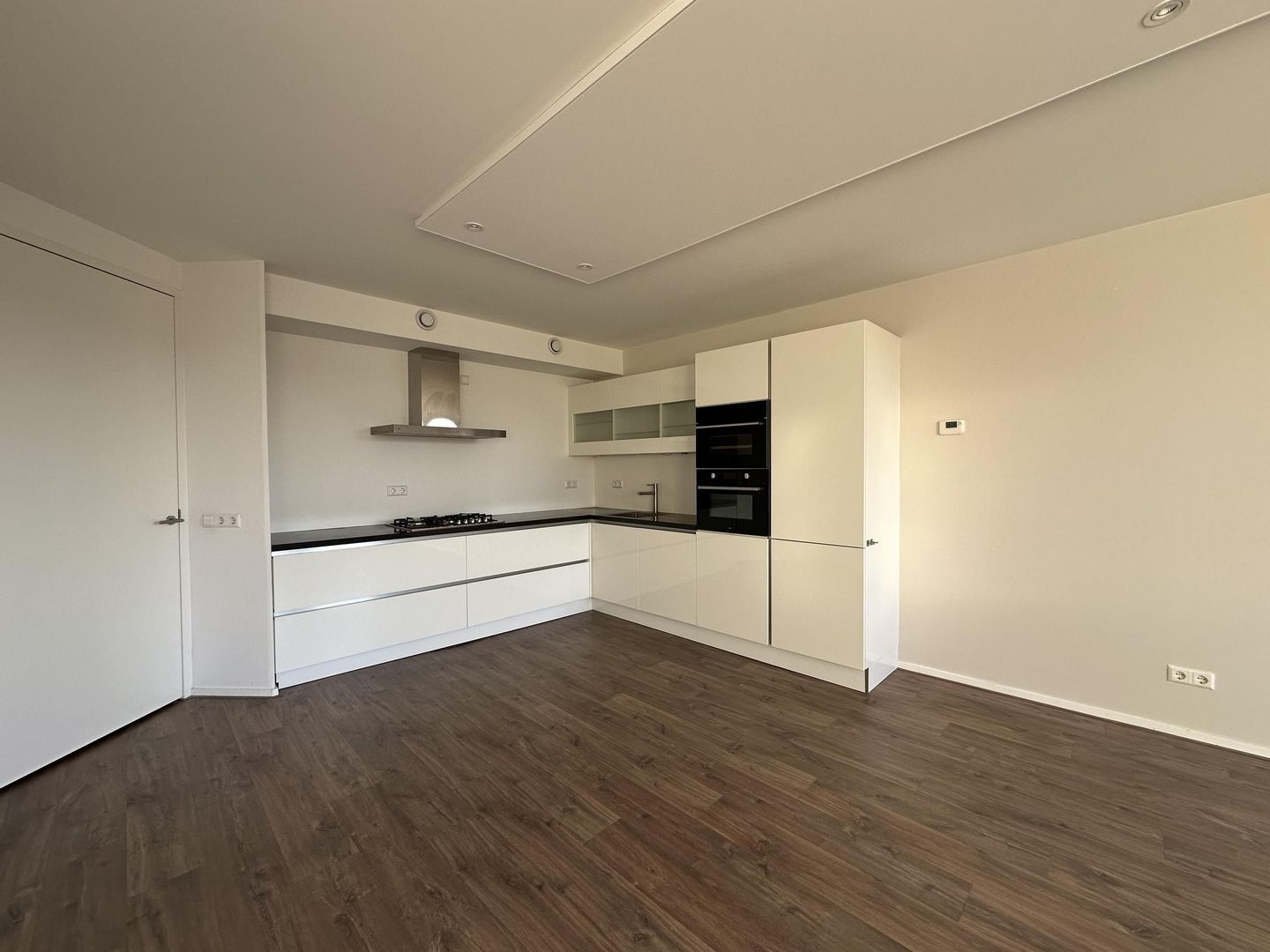 De ruime lichte living met open keuken is goed ingedeeld en ligt qua zicht precies op de hoek van de Van Boetzelaerstraat en de winkelstraat Van Mandersloostraat.