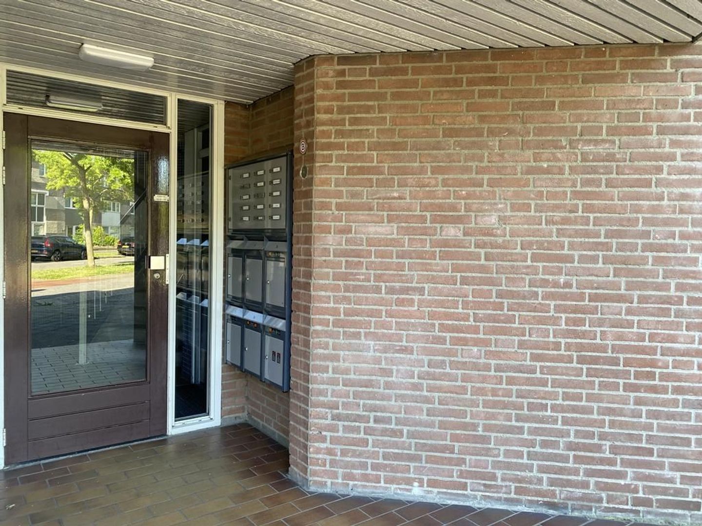 Afgesloten entree met brievenbussen, bellentableau en het trappenhuis op de begane grond.
