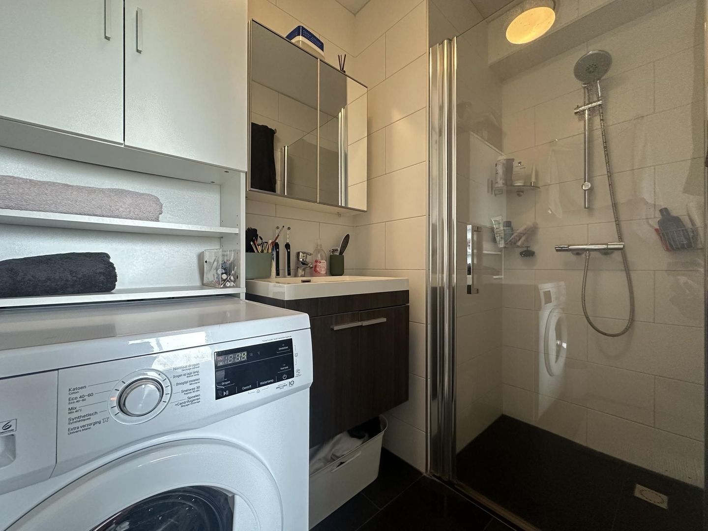 Eenmaal binnen in de hal treft u aan de voorzijde een ruime slaapkamer met badkamer en-suite. De badkamer is voorzien van een douche, wastafelmeubel, vloerverwarming en aansluiting voor de wasmachine/droger. Verder in de hal is het toilet gesitueerd met daarnaast een kast met technische installaties. Aan het einde van de hal bevindt zich de lichte woonkamer met open keuken. De keuken is uitgevoerd in witte kleurstelling en beschikt over diverse inbouwapparatuur. Tot slot grenst aan de woonkamer een balkon welke wordt afgesloten middels een schuifpui.
