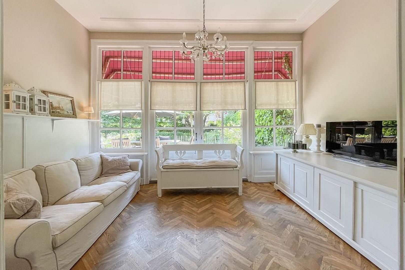 Vanuit de eetkamer treft u de tuinkamer, thans tv-kamer. Een kamer met prachtige lichtinval en voorzien van dubbele deuren naar de achtertuin.