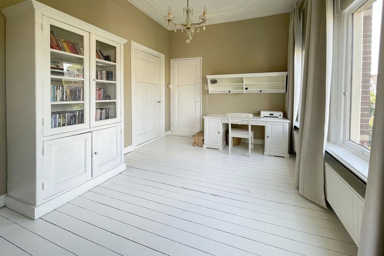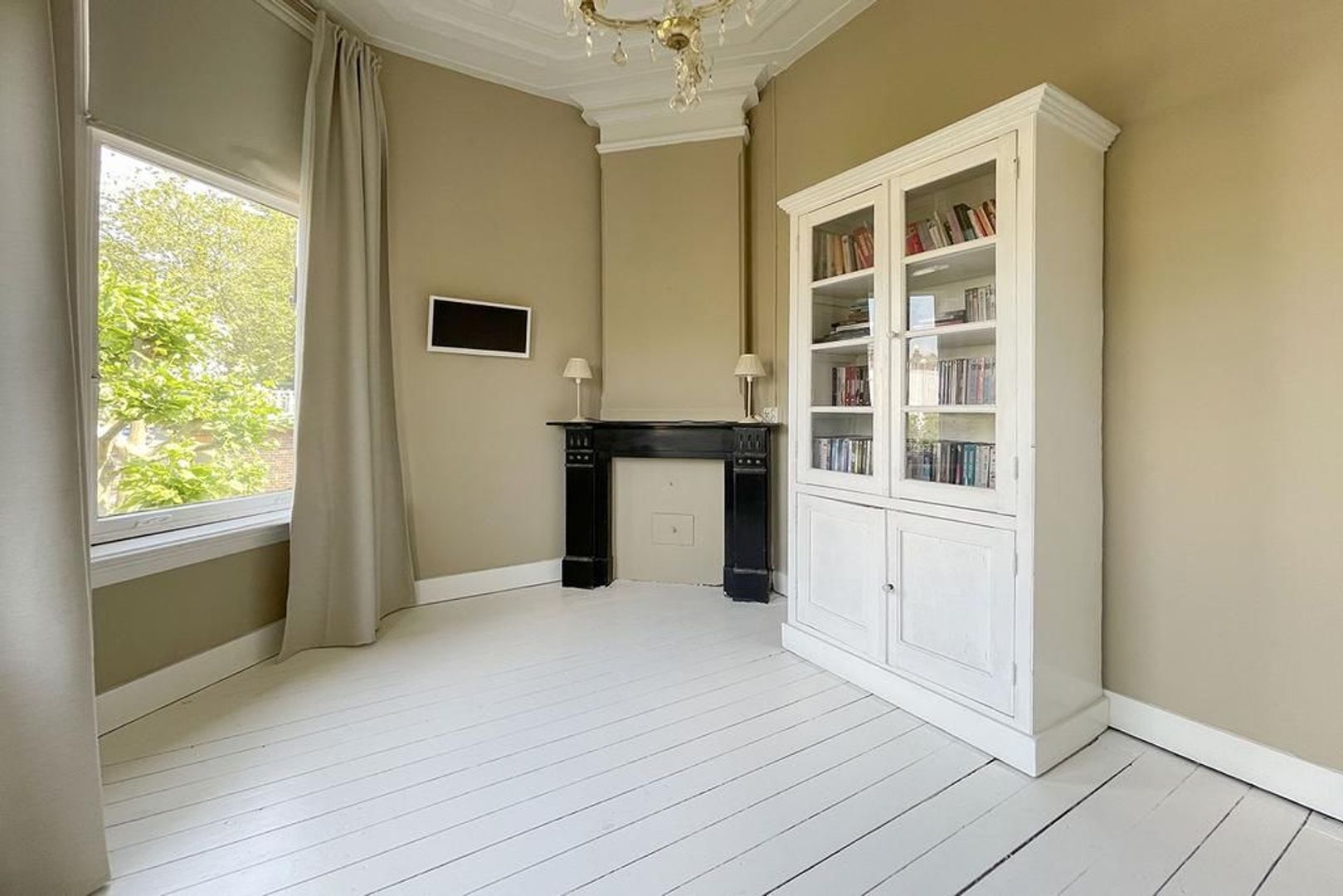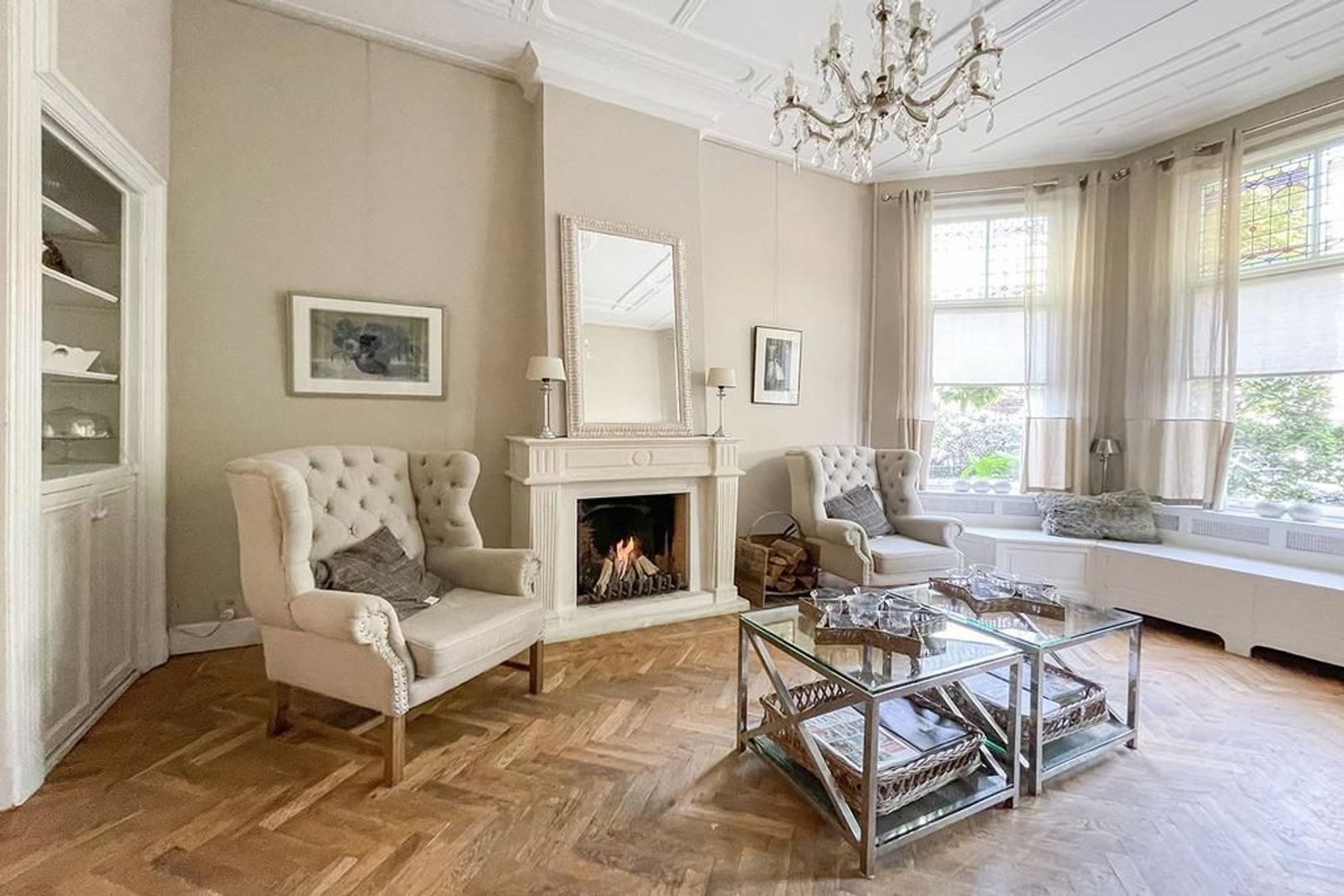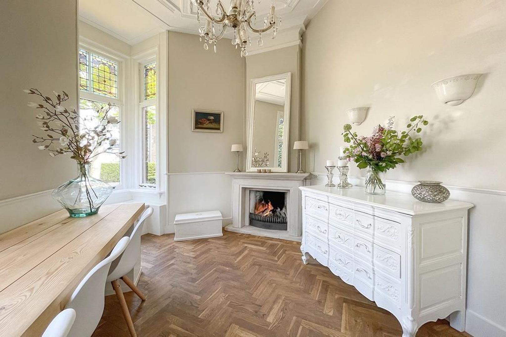 Ook de zitkamer is voorzien van een gashaard welke voor een warme sfeer zorgt. Verder vindt u hier zeer hoge plafonds met de nog originele decoratie. Deze combinatie met de in visgraad verband gelegde vloer levert een erg chique uitstraling in deze kamer.