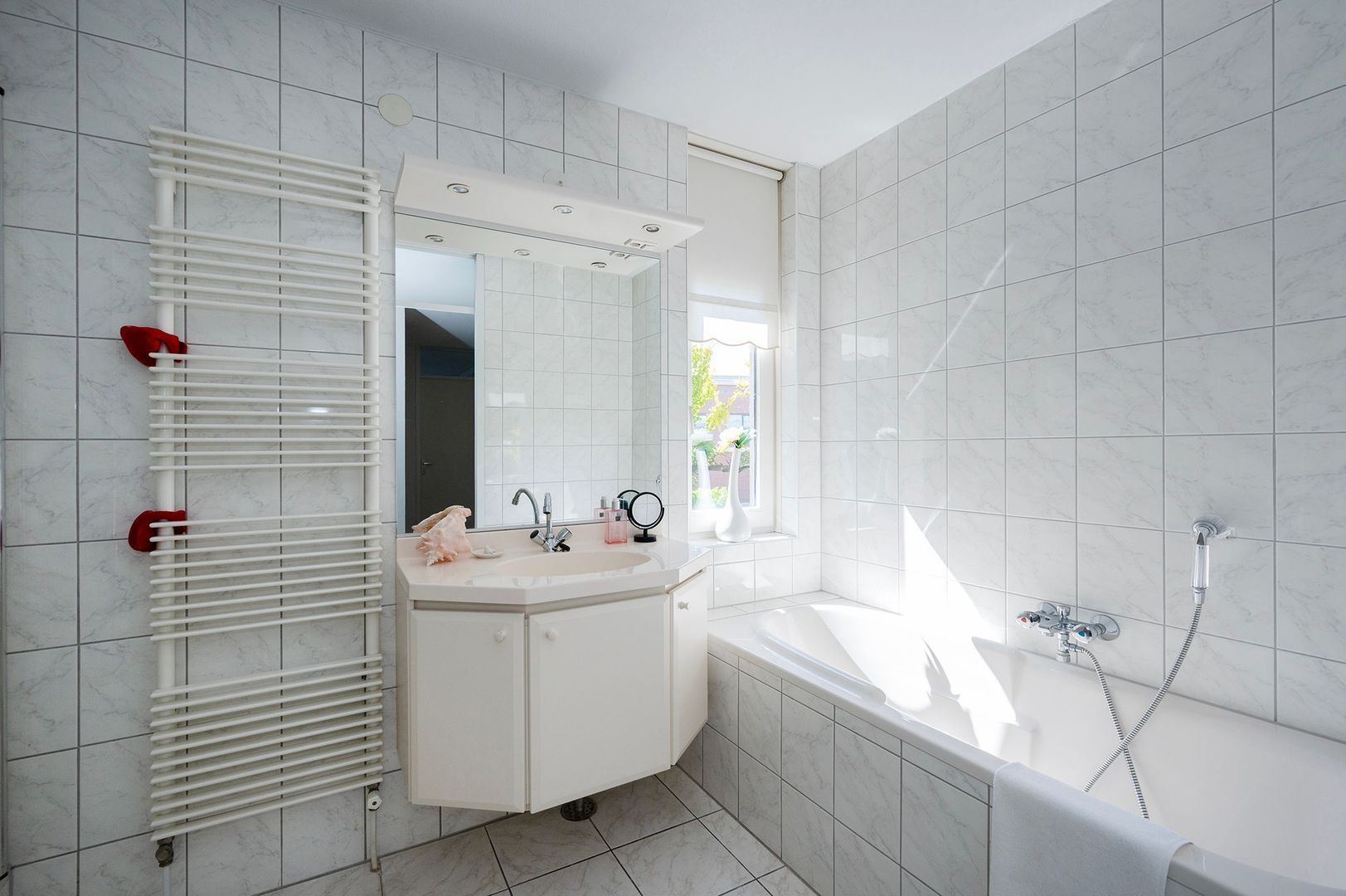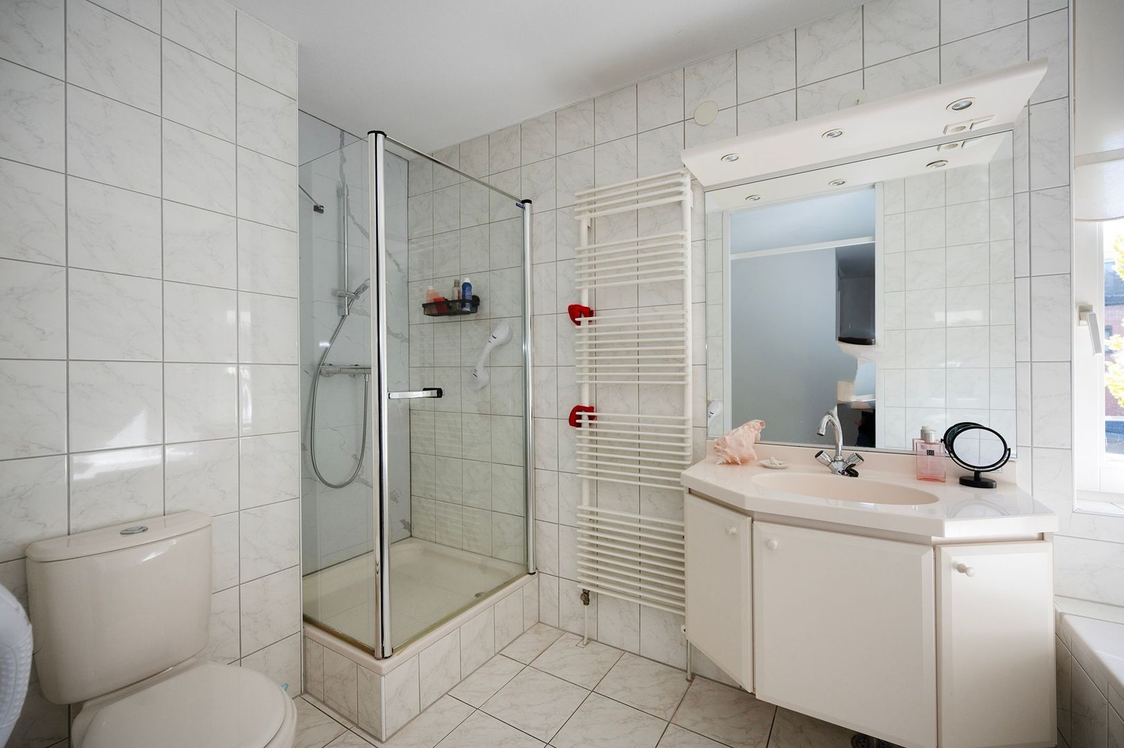 De badkamer is volledig betegeld en uitgerust met een ligbad, aparte douchecabine, wastafelmeubel en designradiator.