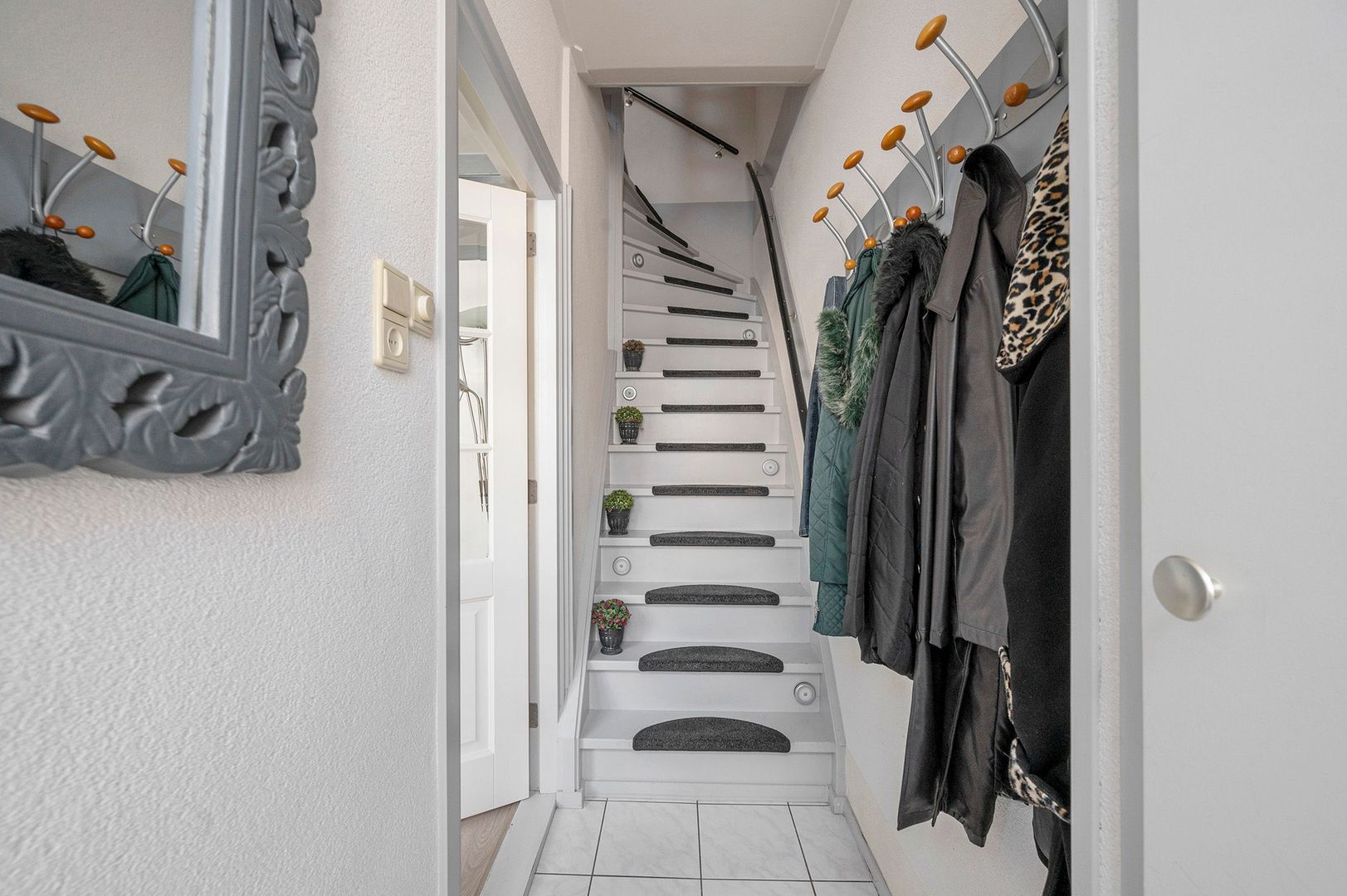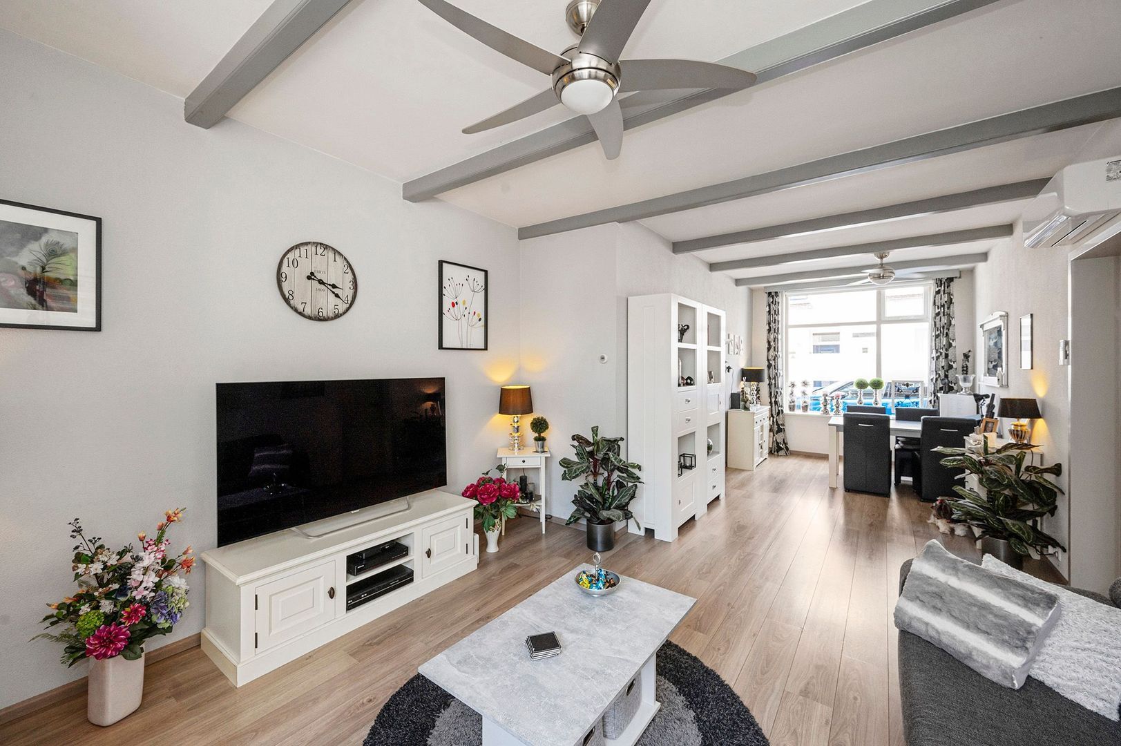 Je betreedt de woning via de hal met trapopgang naar de eerste verdieping. De woonkamer biedt ruimte voor een zit- en eethoek, is voorzien van een betonnen vloer met vloerverwarming en beschikt tevens over een schuifpui naar de achterplaats. Daarnaast is er een airco aanwezig.