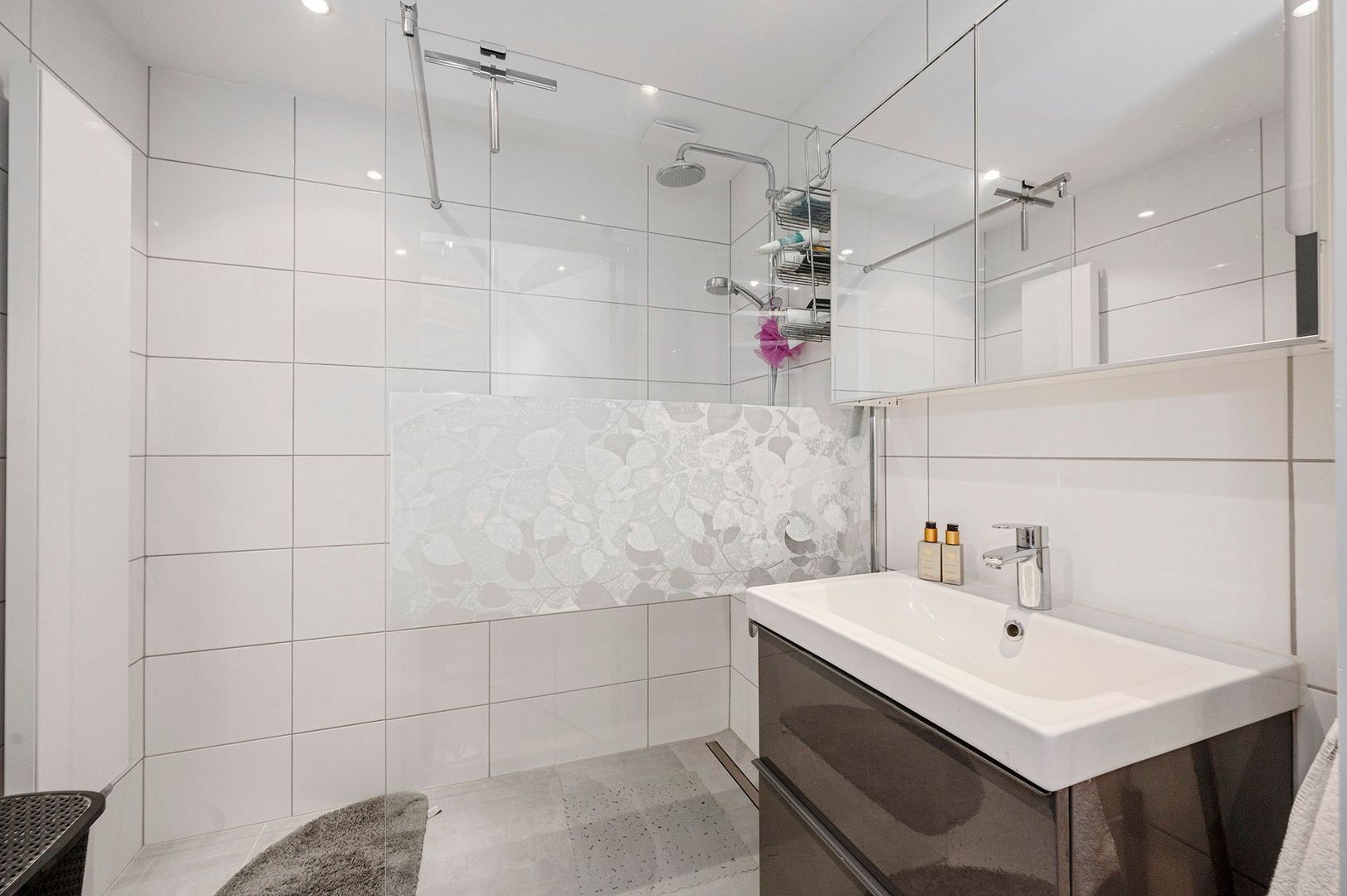 De badkamer beschikt over een douche en een wastafelmeubel met bijbehorende kast. Op deze verdieping bevindt zich ook een apart tweede toilet.