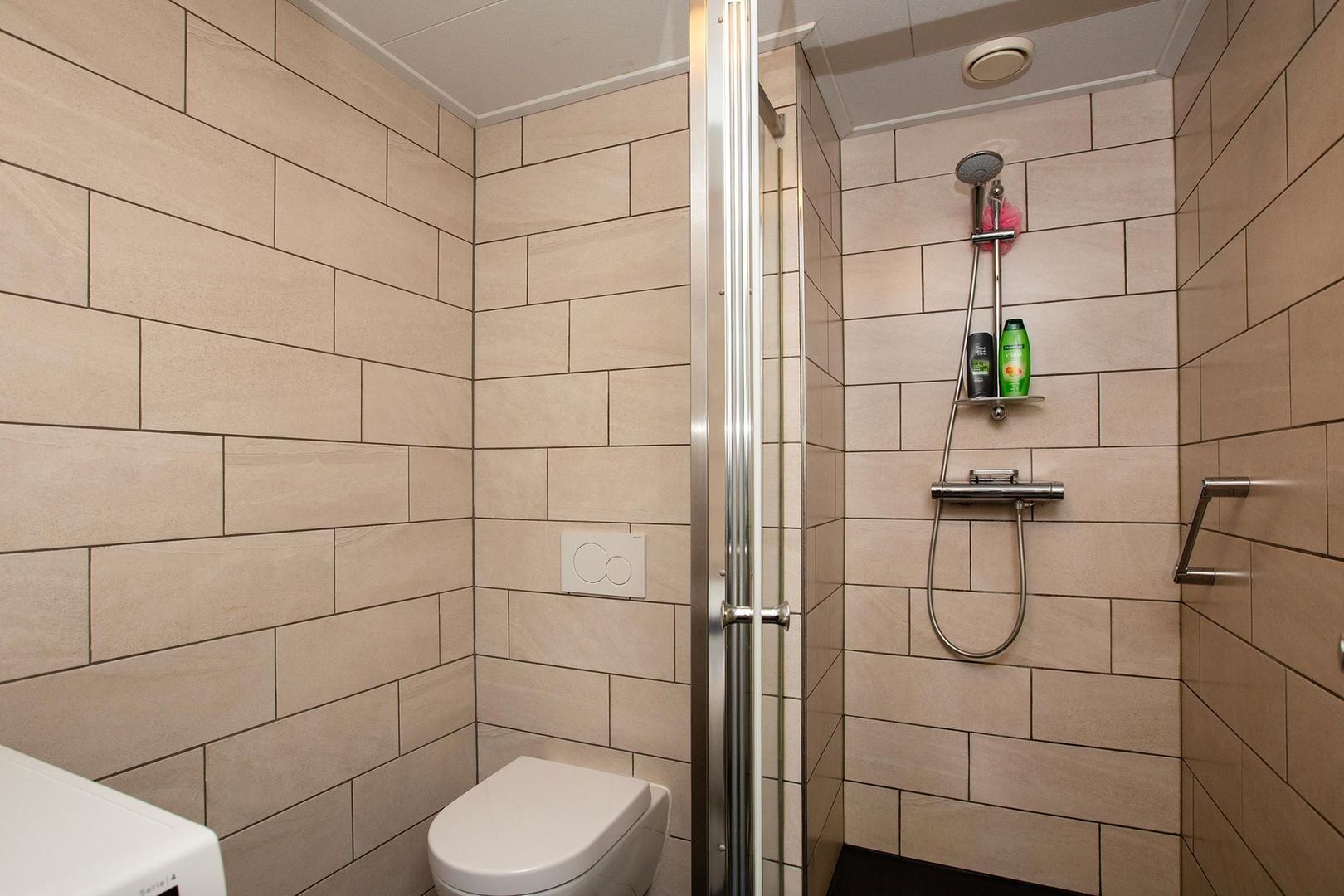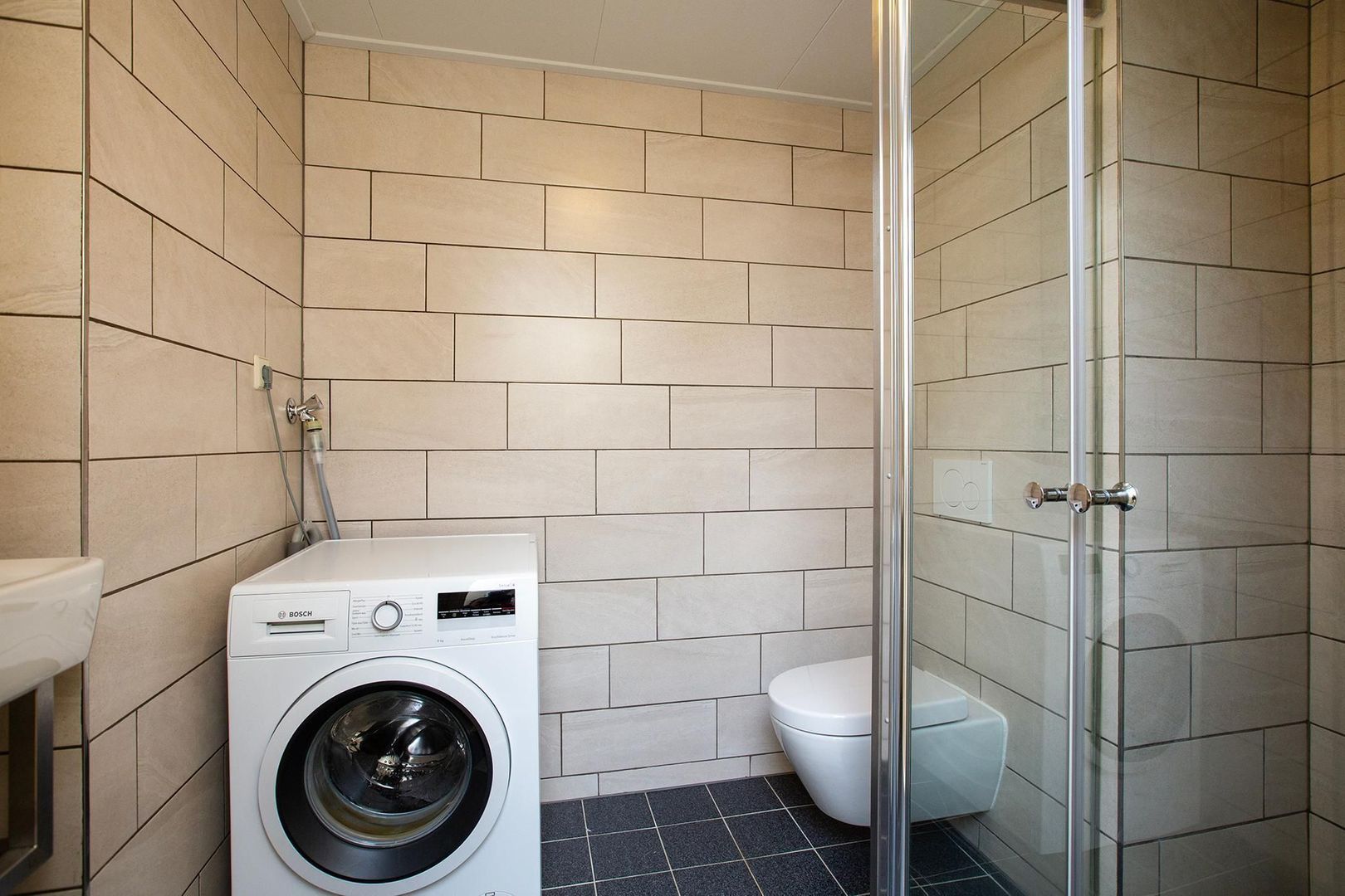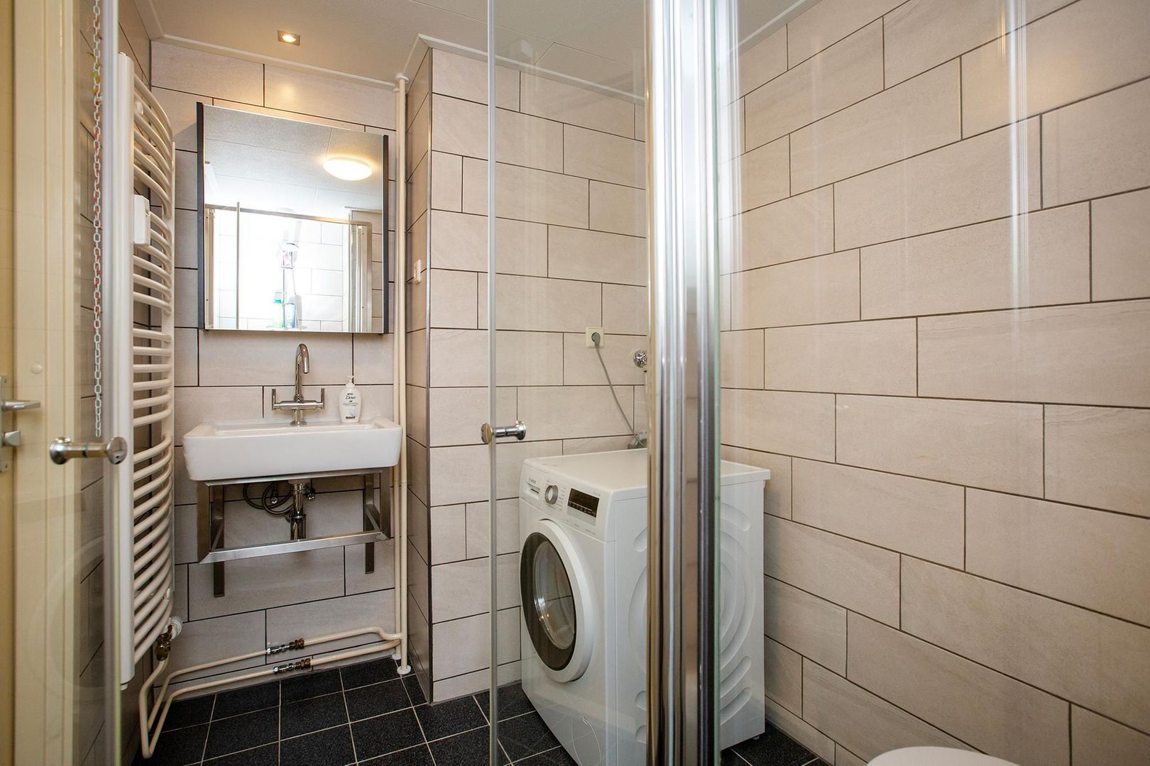 Daarnaast is op deze verdieping de badkamer gelegen welke is voorzien van een wastafel met een spiegelkast, douchehoek, toilet en aansluiting voor de wasmachine en droger.