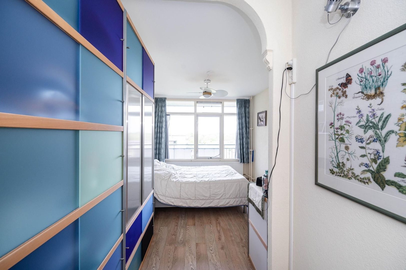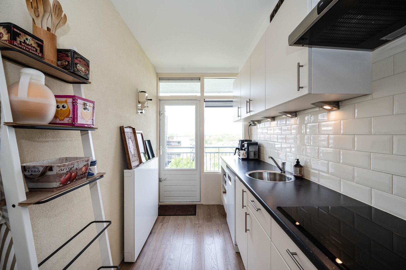 Aan de achterzijde treft u de 3e slaapkamer welke groter is gemaakt dan traditioneel. De nette keuken is eveneens aan de achterkant en biedt toegang tot het 3e balkon. De keuken biedt meer dan voldoende kastruimte en is voorzien van diverse (inbouw)apparatuur zoals: een inductie kookplaat, luxe wandafzuigkap, vaatwasser en koel- vrieskast.