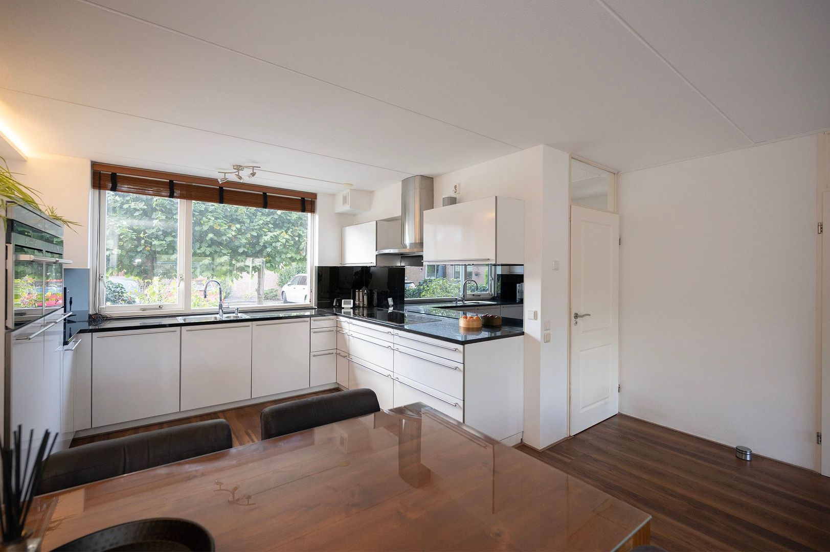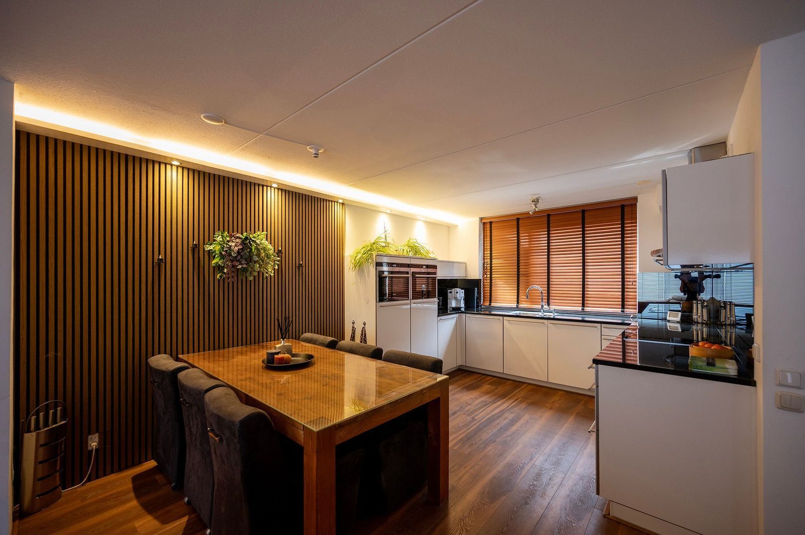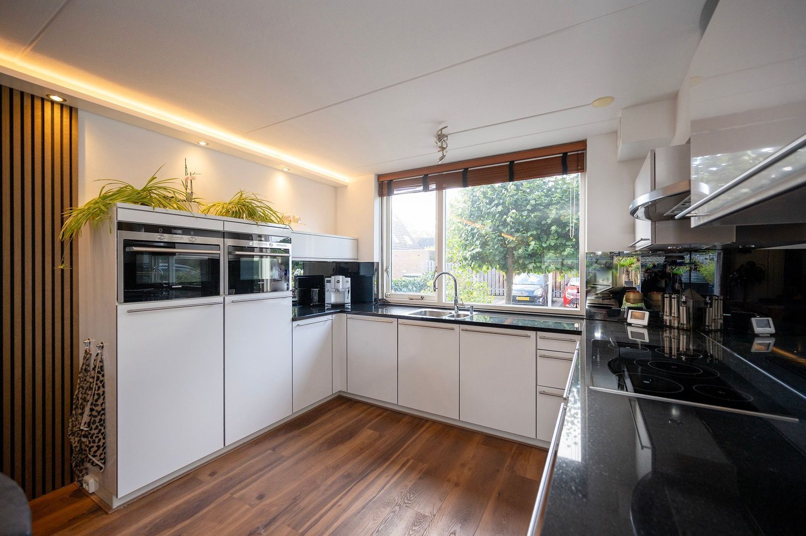 De moderne keuken aan de voorzijde is opgesteld in een praktische U-vorm en uitgerust met inbouwapparatuur: koelkast, vriezer met 4 lades, vaatwasser, quooker, oven, combimagnetron, 5-pits inductiekookplaat, afzuigkap en een granieten werkblad. De afwerking met inbouwspots, RVS-details en een spiegelwand geeft de keuken een luxe uitstraling. Voor extra gemak is er een trapkast met slimme opbergruimte. Het keukenraam is voorzien van een screen.