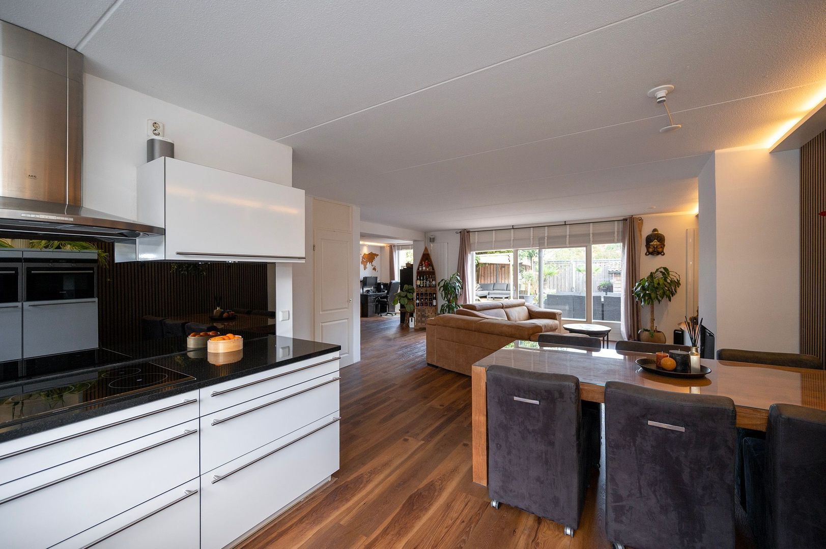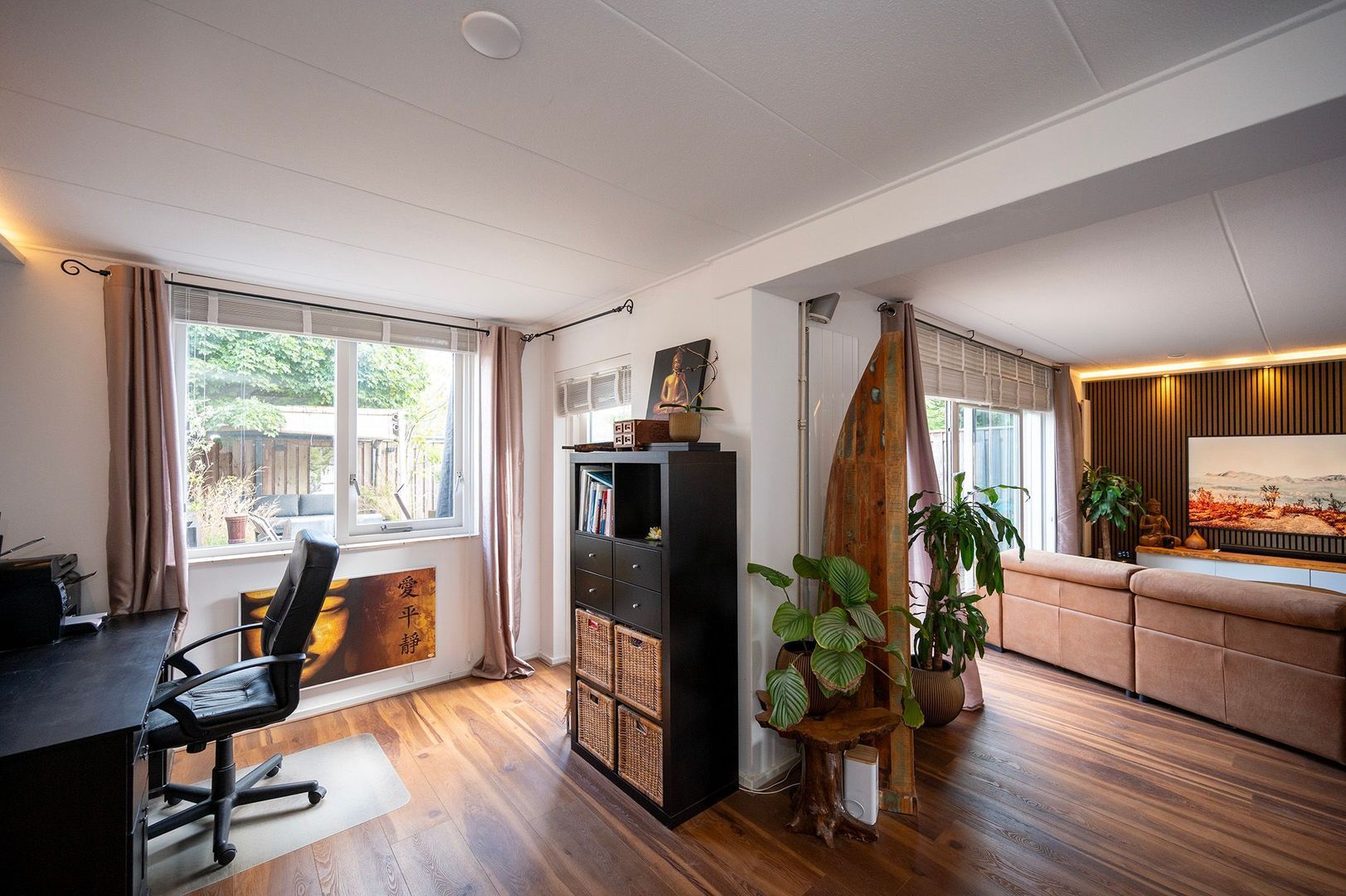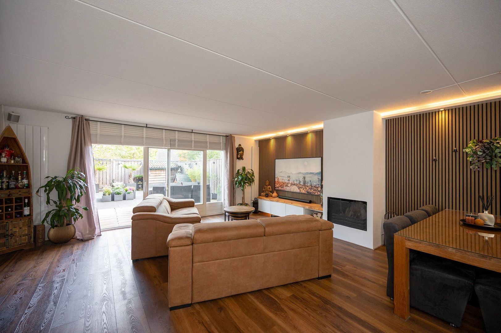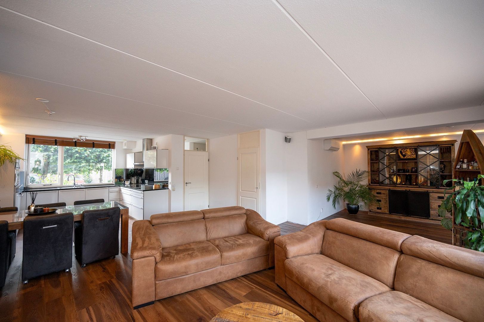 De woonkamer is licht en ruim opgezet, voorzien van een stijlvolle PVC-vloer met vloerverwarming en airconditioning. Aan de tuinzijde bevindt zich de zithoek met open haard en schuifpui naar de achtertuin. Dankzij de royale zij-uitbouw is er extra leefruimte ontstaan, bijvoorbeeld geschikt als werkplek, speelhoek of tweede eethoek.