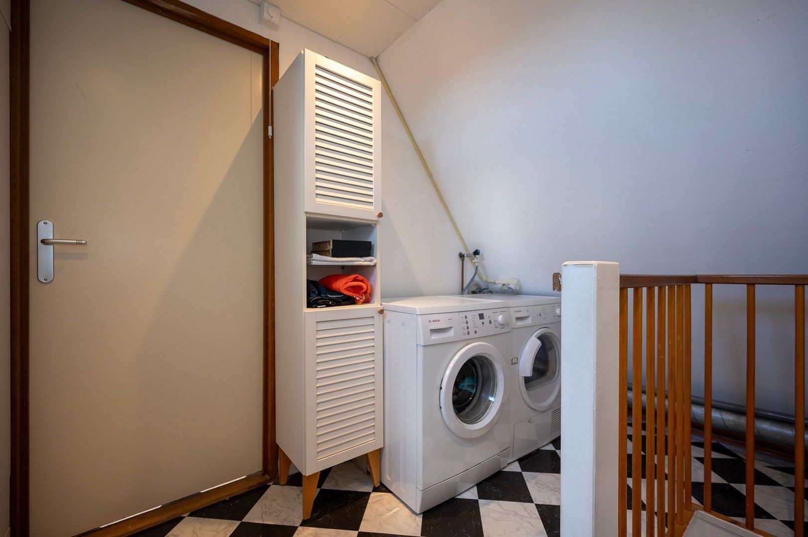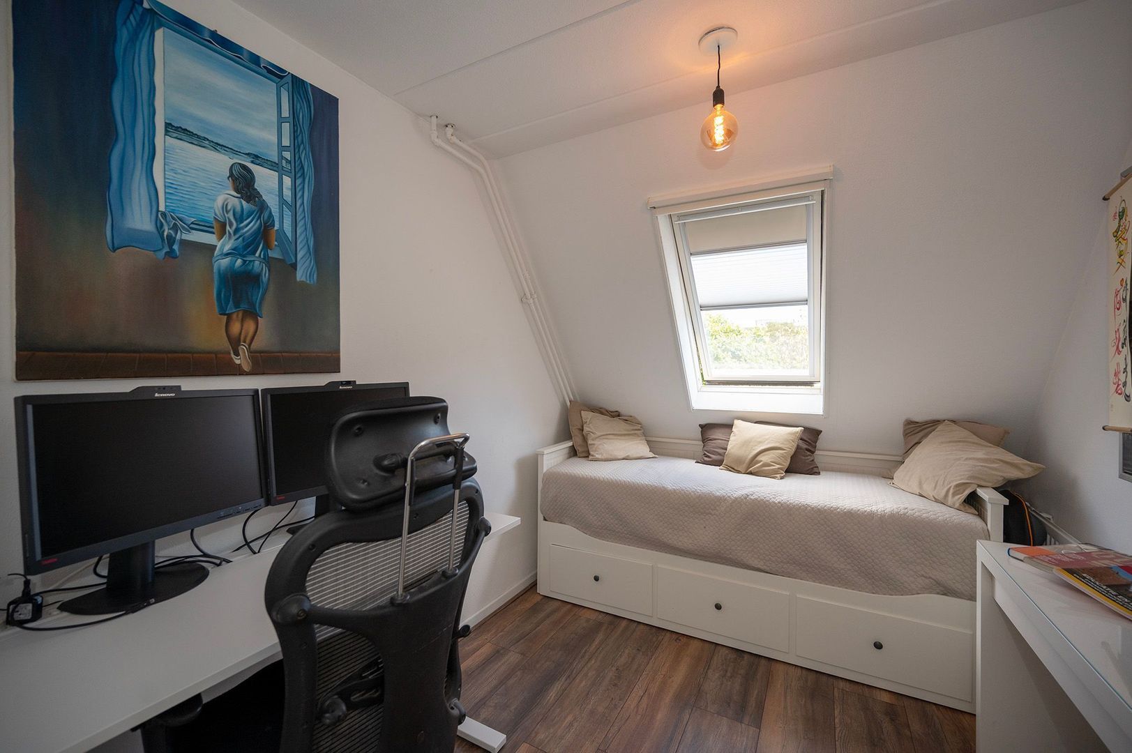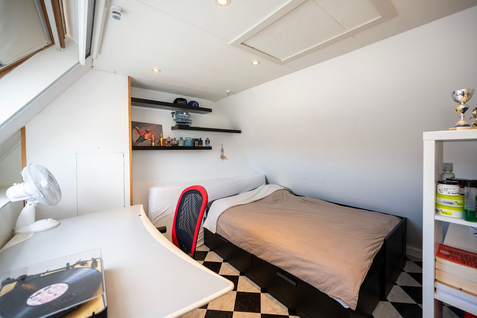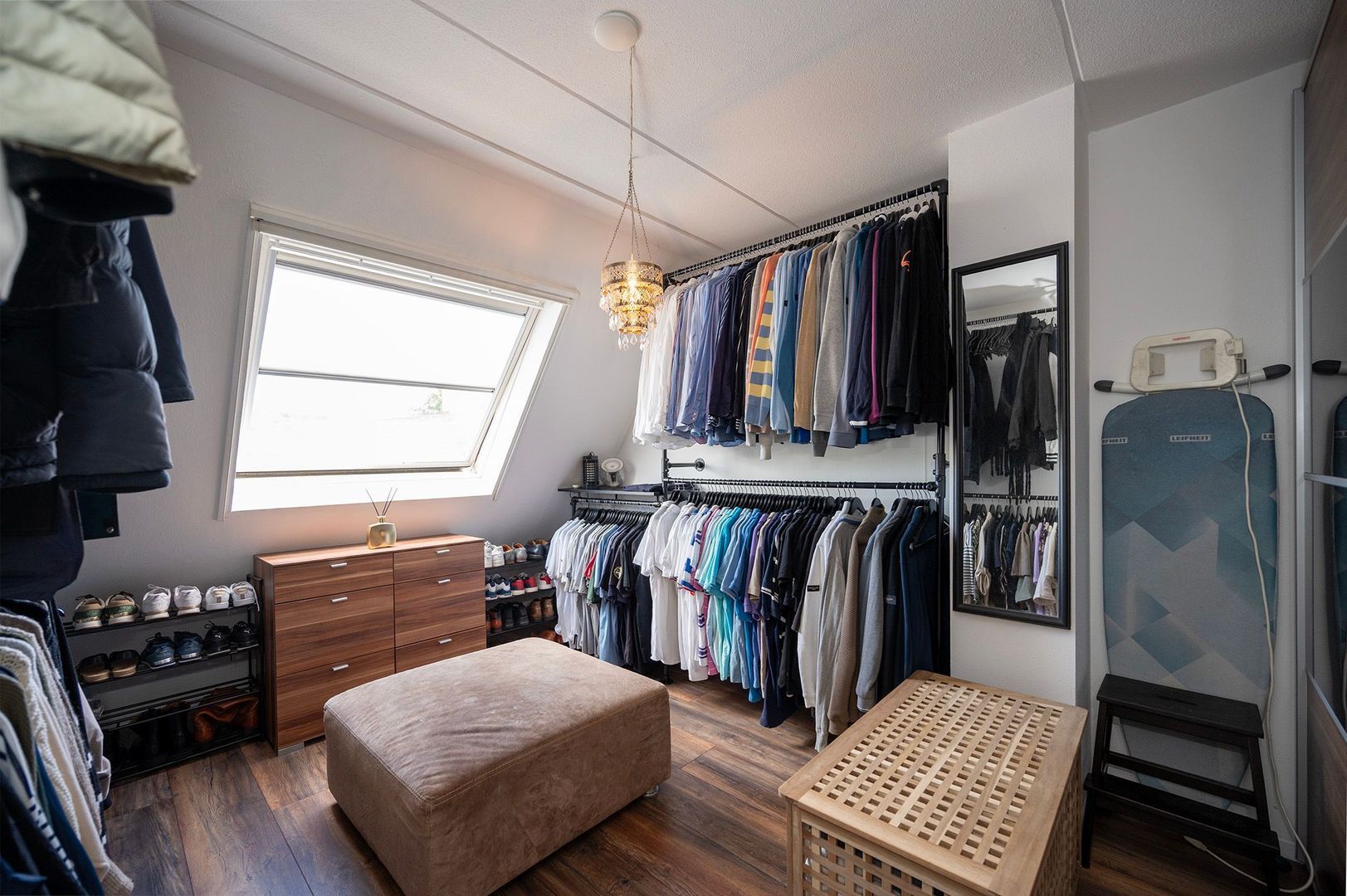 De zolder is bereikbaar via een vaste trap. Hier vindt u de voorzolder met aansluitingen voor wasmachine en droger, de cv-installatie, mechanische ventilatie en toegang tot de vliering. Daarnaast is er een ruime zolderkamer met dakraam (voorzien van hor en verduistering) en extra bergruimte achter de knieschotten.