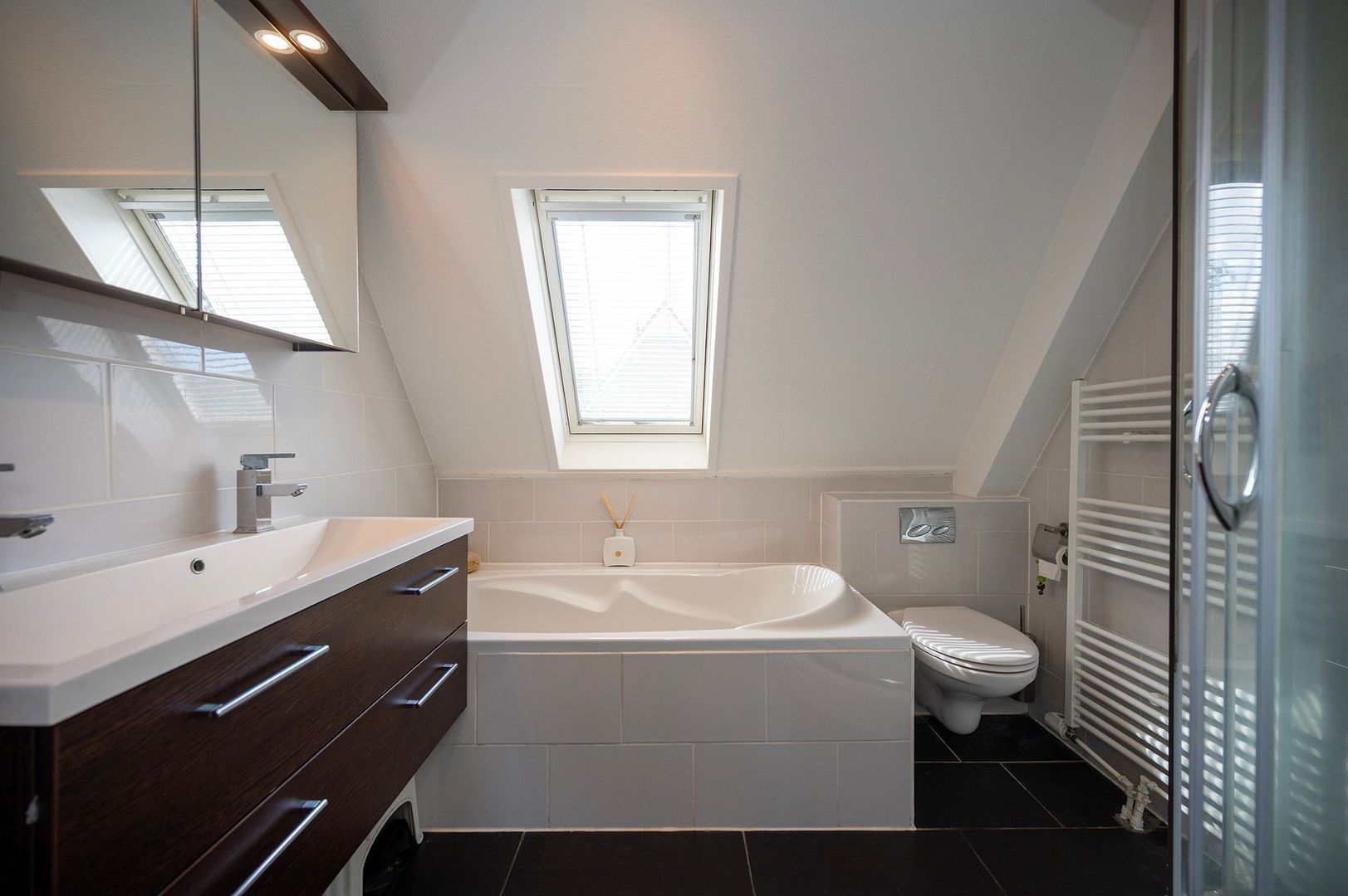 De badkamer is uitgevoerd in een grijs-witte tint en compleet ingericht met een ligbad, aparte douche, dubbele wastafel in meubel, wandcloset, designradiator, inbouwverlichting en zowel natuurlijke als mechanische ventilatie.