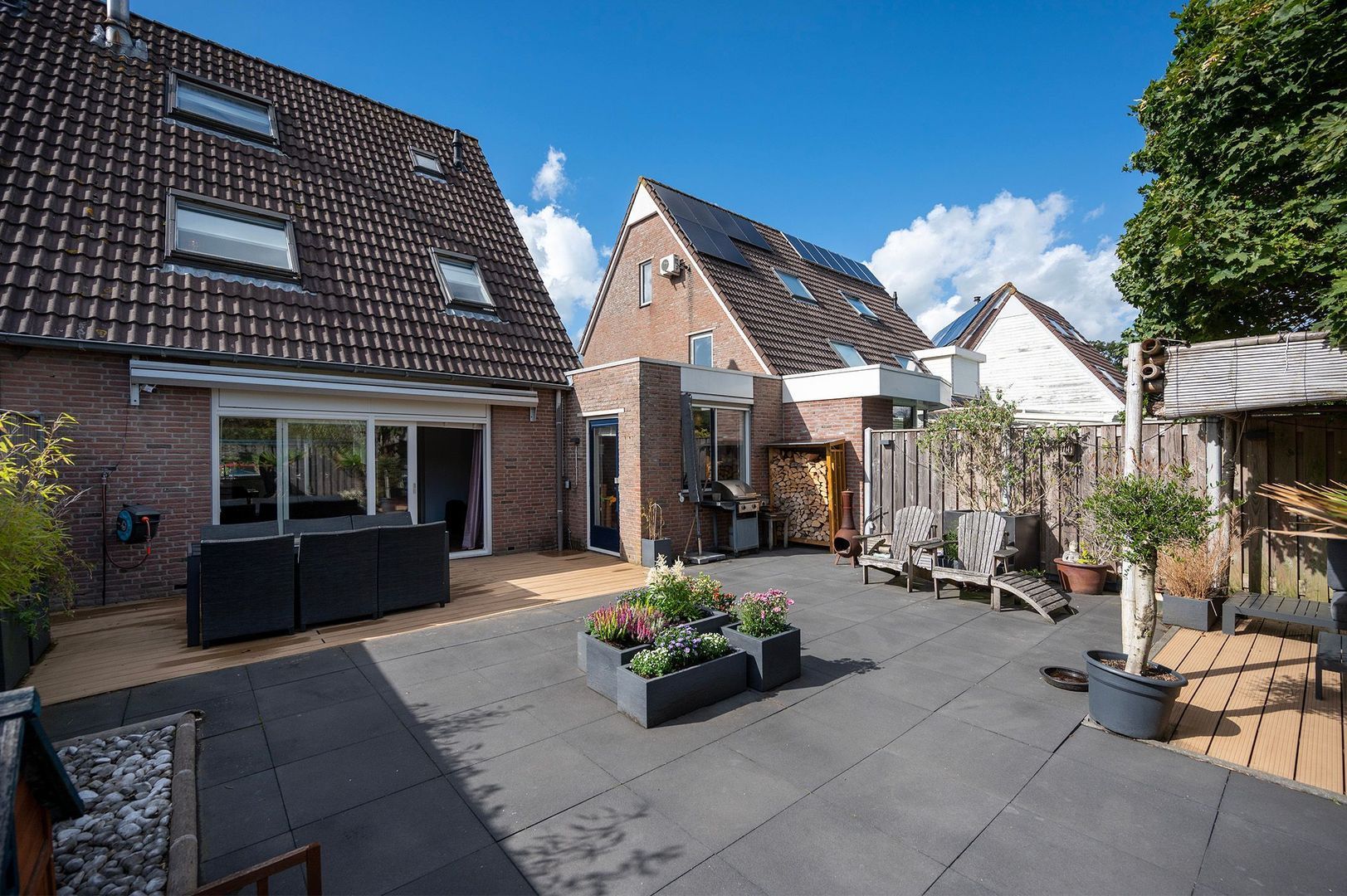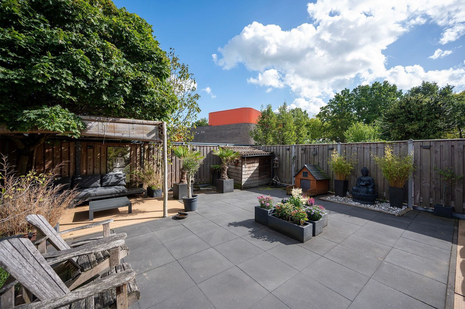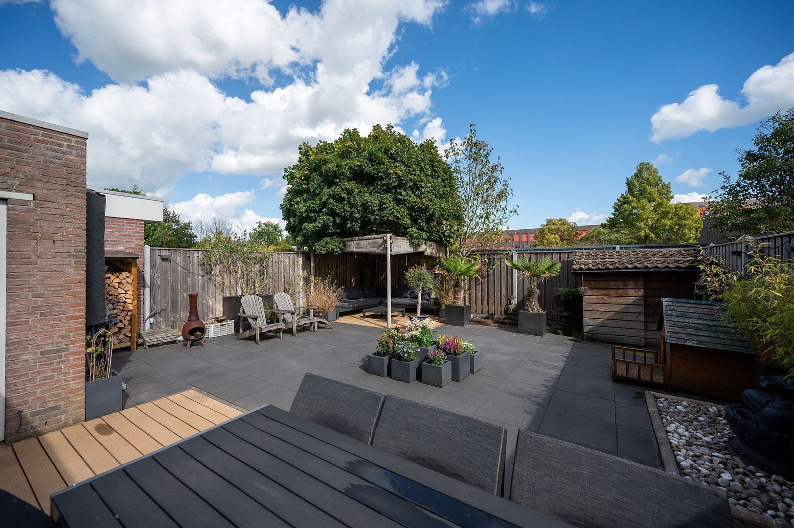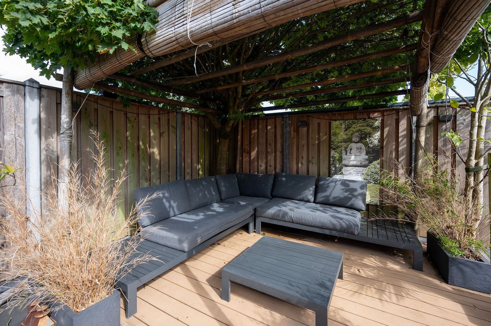 De achtertuin is diep, zonnig gelegen op het oosten en fraai ingericht met een terras, gazon, borders en volwassen beplanting. Verder zijn aanwezig: een buitenkraan, zonnescherm en houtopslag.