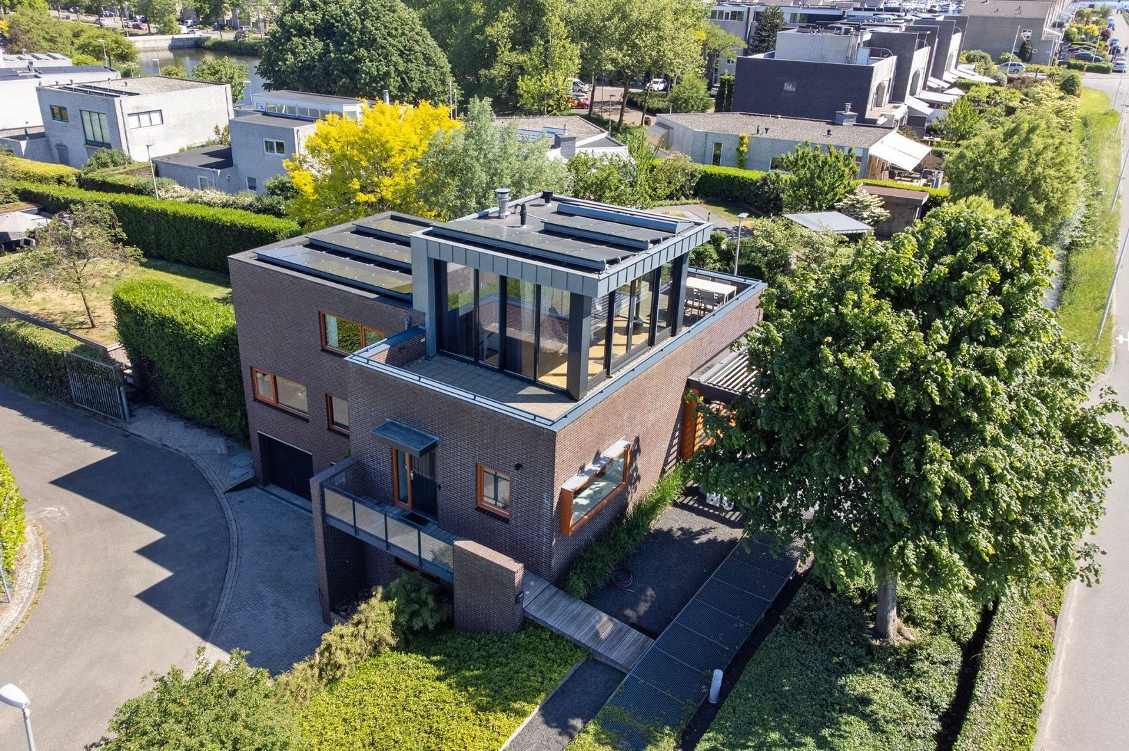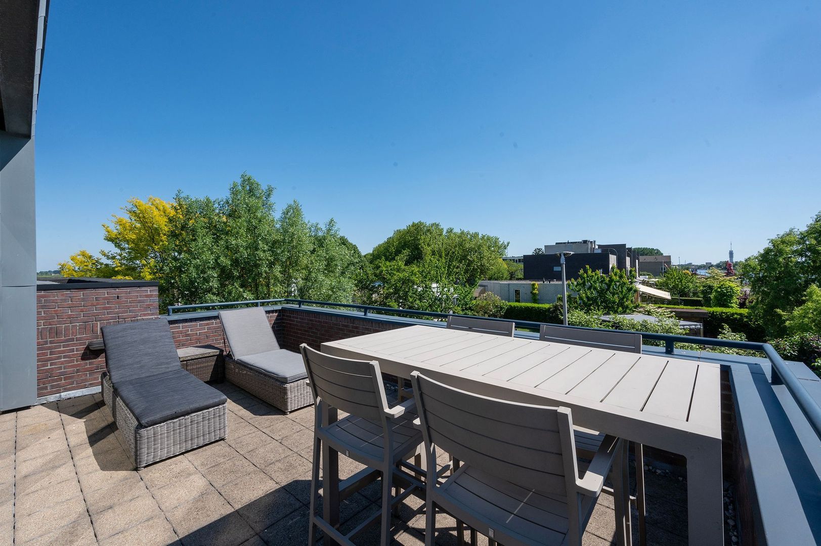 Het dakterras rondom de tuinkamer biedt een prachtig uitzicht over de omgeving en vormt een unieke plek om buiten te zitten.