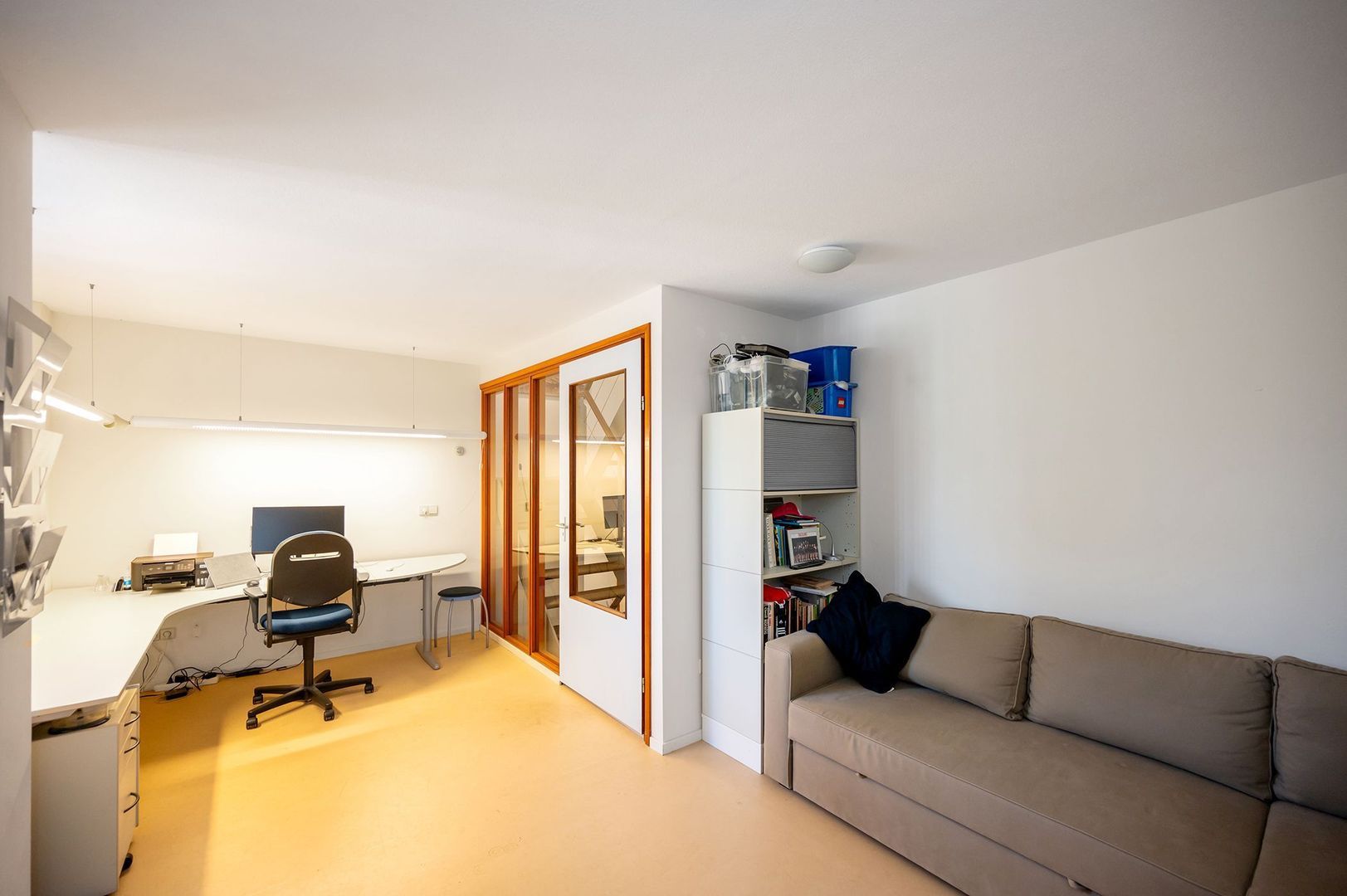 Massief houten vloeren en marmoleum in de werkkamers