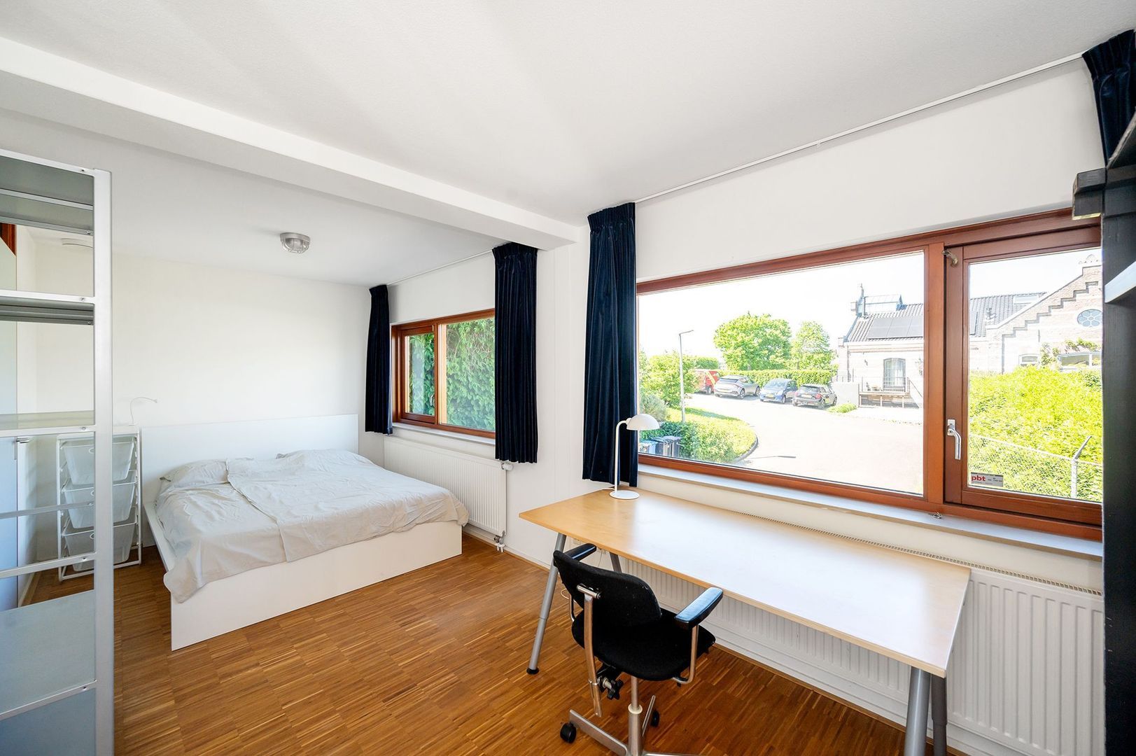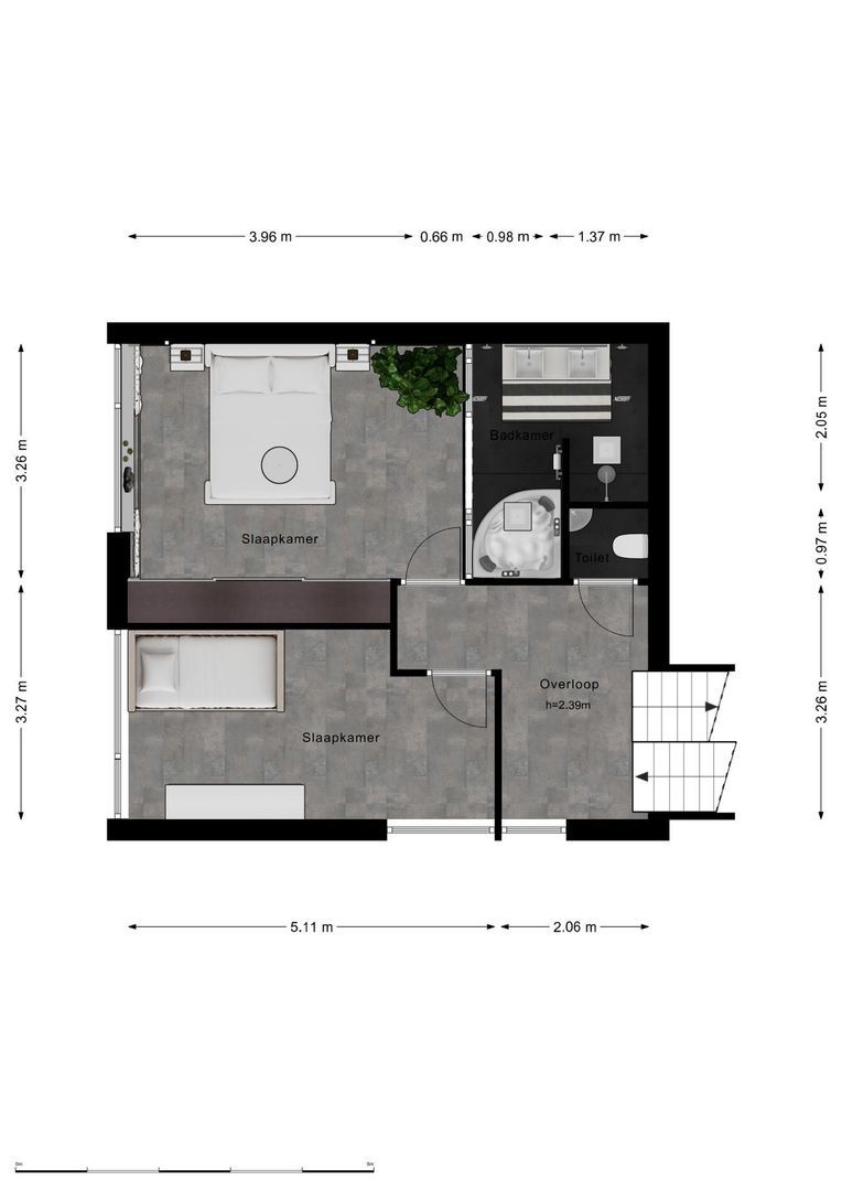 Vanaf de overloop zijn beide kamers bereikbaar. De grootste slaapkamer ligt aan de voorzijde van de woning en beschikt over grote raampartijen met veel lichtinval.