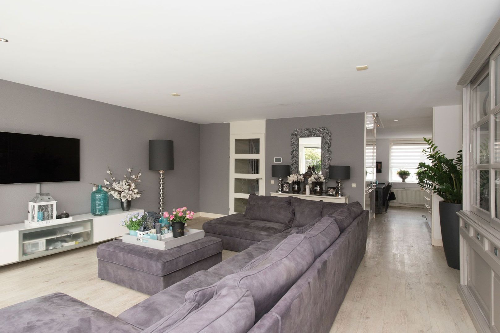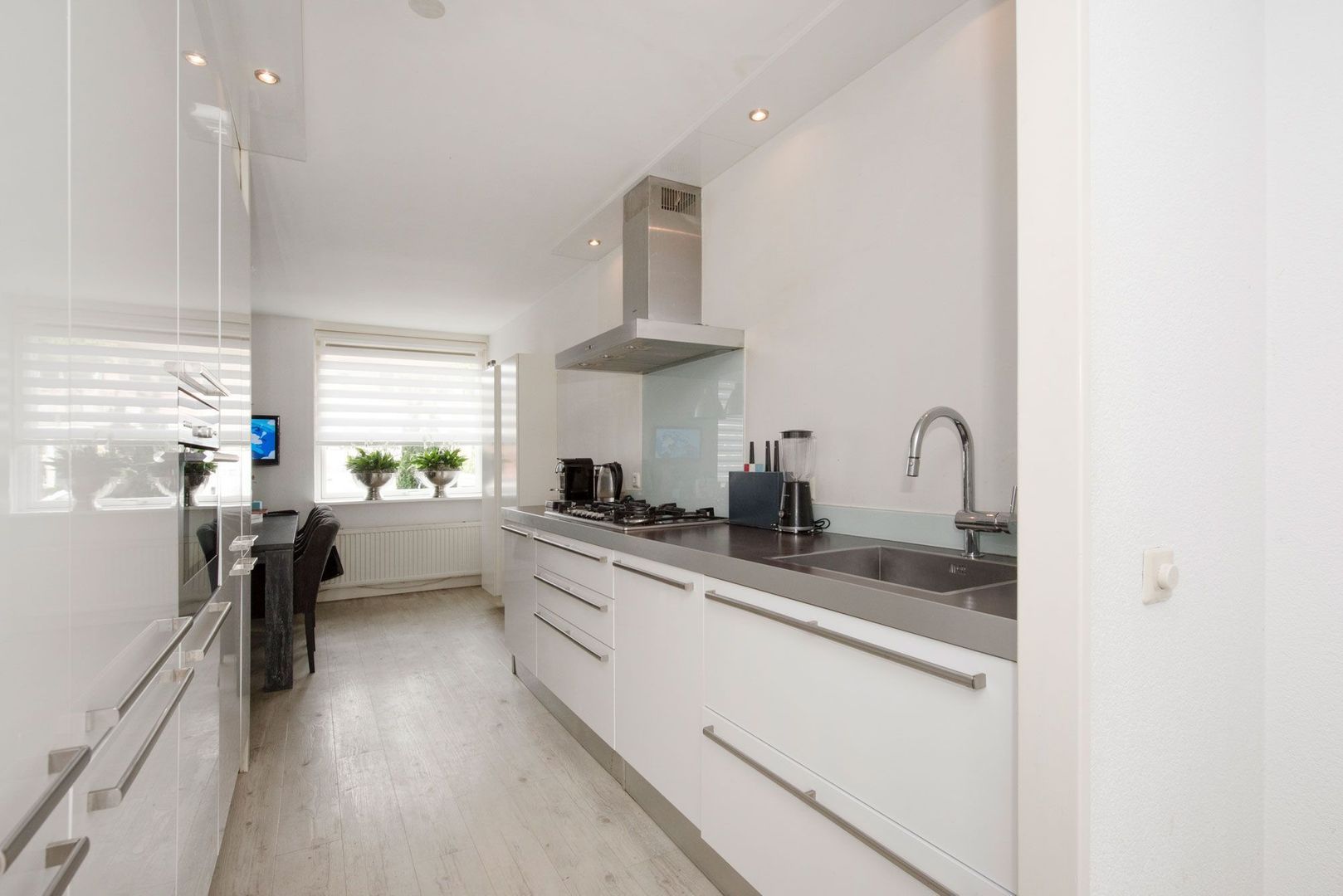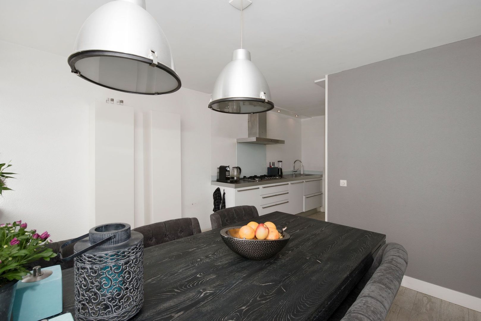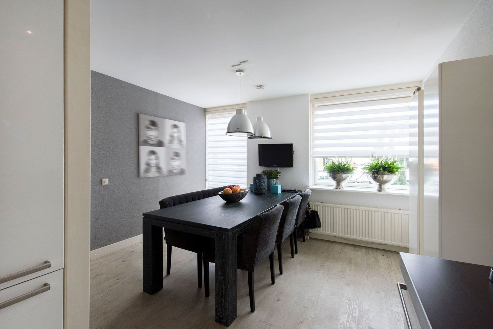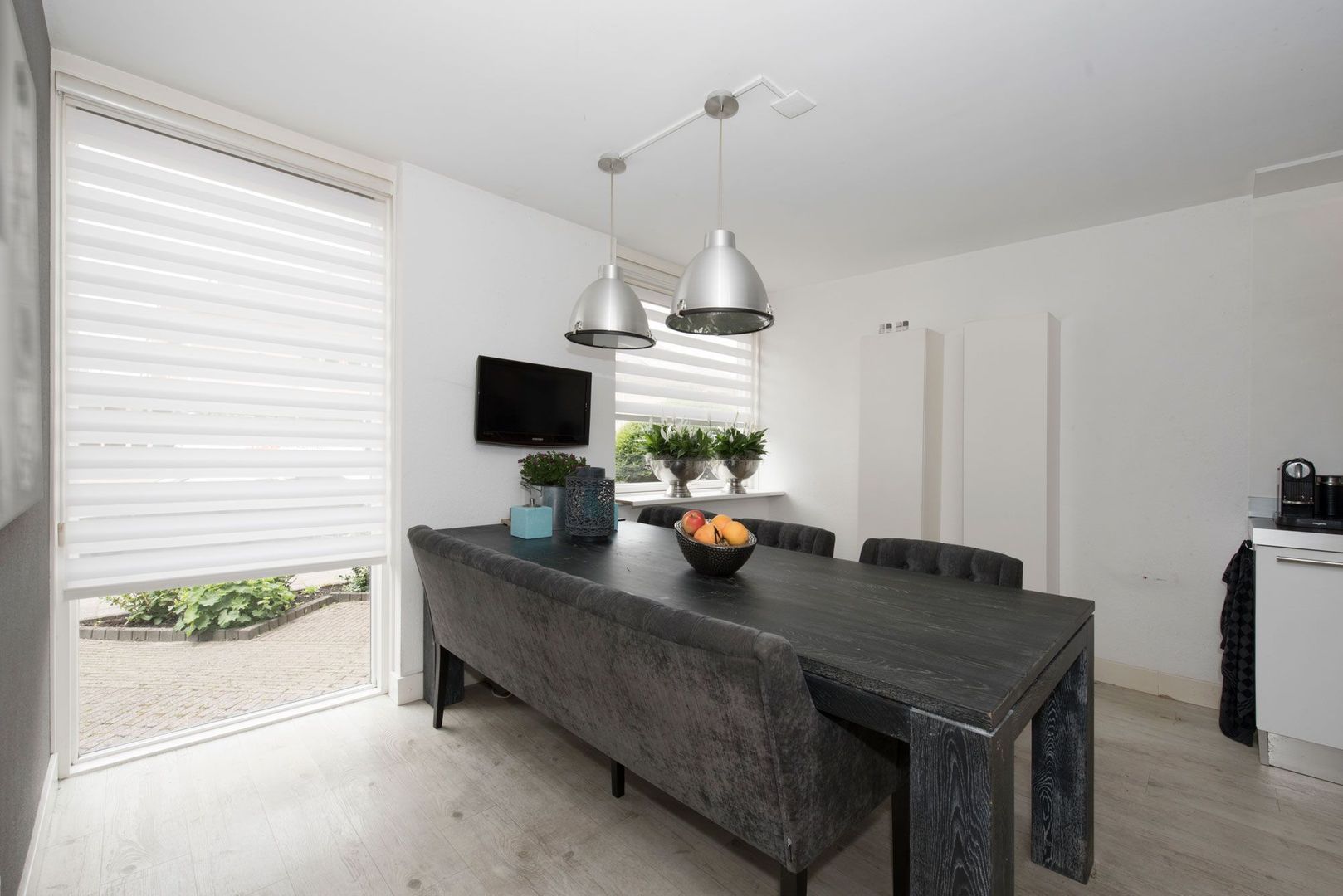 De gezellige eetkamer is gelegen aan de straatzijde. De gehele begane grondvloer is voorzien van whitewash PVC.